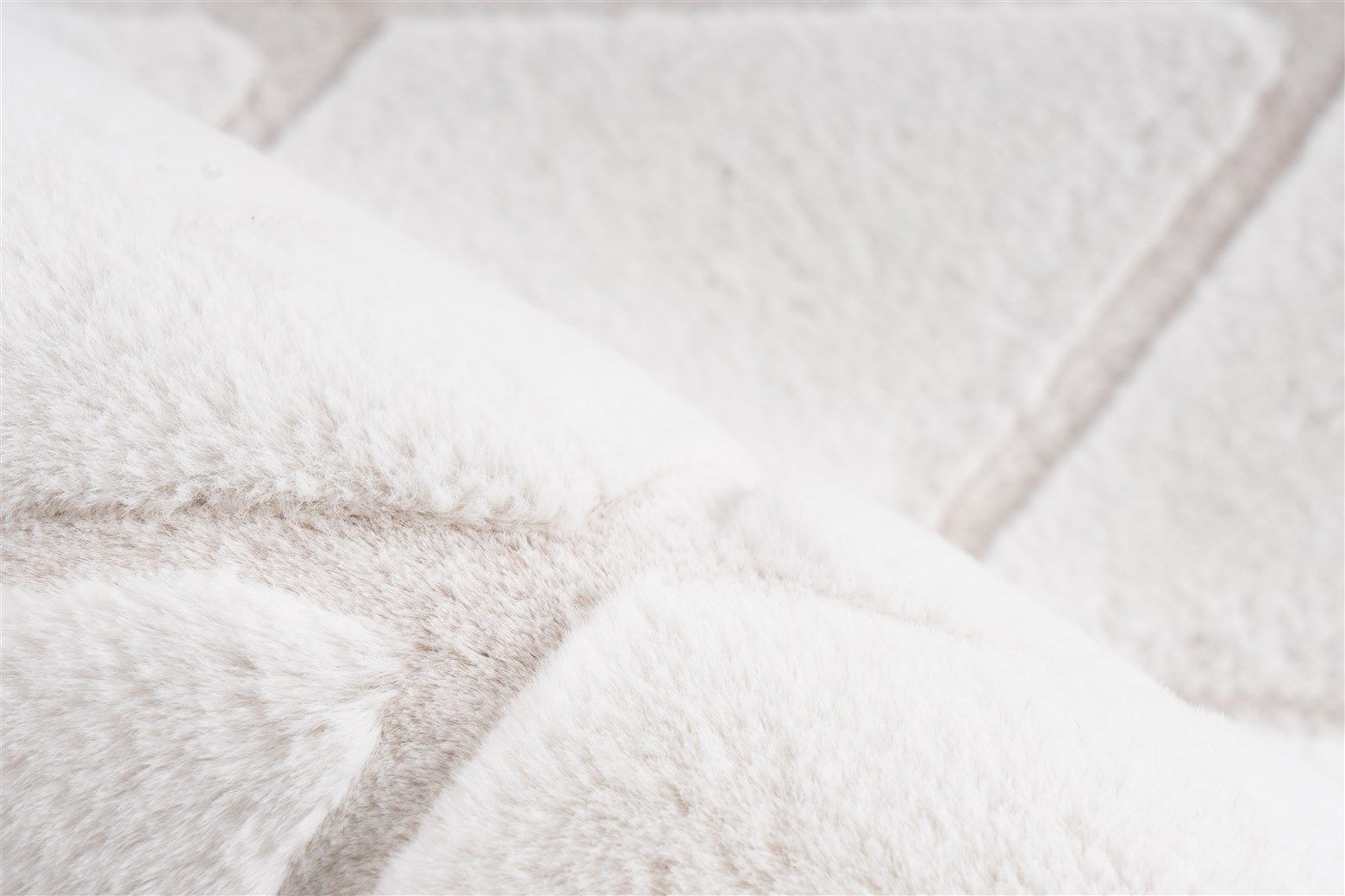 Der besondere Look dieses Hochflorteppichs zeichnet sich durch das attraktive geprägte Muster aus, das für einen attraktiven 3D-Effekt sorgt. Durch die geometrischen Formen des Musters erhält der Teppich zudem einen stilvollen Retro-Charakter. Der ansonsten schlichte und einfarbige Flor kann sich in jedem Wohnraum sehen lassen und lässt sich dank der schlichten Eleganz mit jeder Einrichtung kombinieren. Die kuschelige Oberfläche sorgt für eine gemütliche Atmosphäre im Raum. In Räumen mit Fußbodenheizung kann der Teppich ebenso problemlos ausgelegt werden.