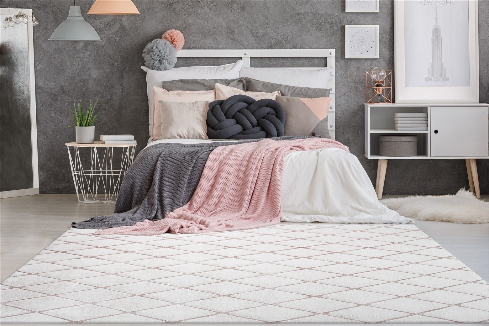 Der besondere Look dieses Hochflorteppichs zeichnet sich durch das attraktive geprägte Muster aus, das für einen attraktiven 3D-Effekt sorgt. Durch die geometrischen Formen des Musters erhält der Teppich zudem einen stilvollen Retro-Charakter. Der ansonsten schlichte und einfarbige Flor kann sich in jedem Wohnraum sehen lassen und lässt sich dank der schlichten Eleganz mit jeder Einrichtung kombinieren. Die kuschelige Oberfläche sorgt für eine gemütliche Atmosphäre im Raum. In Räumen mit Fußbodenheizung kann der Teppich ebenso problemlos ausgelegt werden.