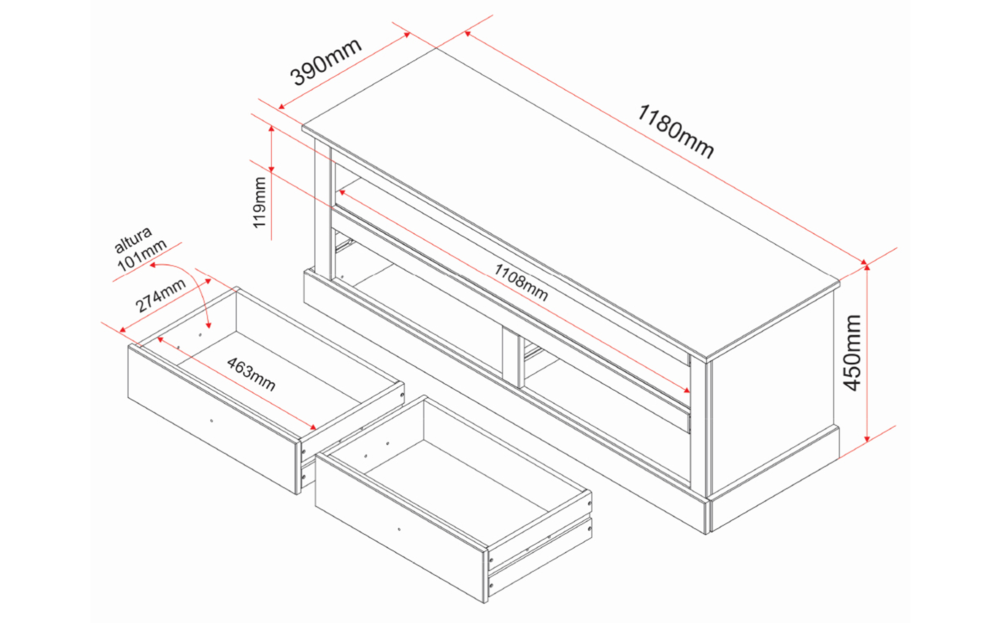Zusätzlich zur Nische bietet das TV-Möbel zwei geräumige Schubladen, die ausreichend Platz für DVDs, Fernbedienungen oder andere Multimedia-Zubehörteile bieten.