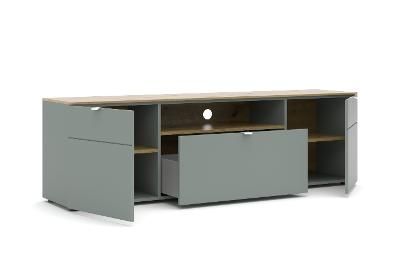 Das offene Fach eignet sich perfekt für Receiver oder Spielkonsolen und ermöglicht eine optimale Kabelführung. Hinter den Türen lassen sich Gegenstände ordentlich und blickgeschützt verstauen, während die Schublade schnellen Zugriff auf häufig genutzte Utensilien bietet.