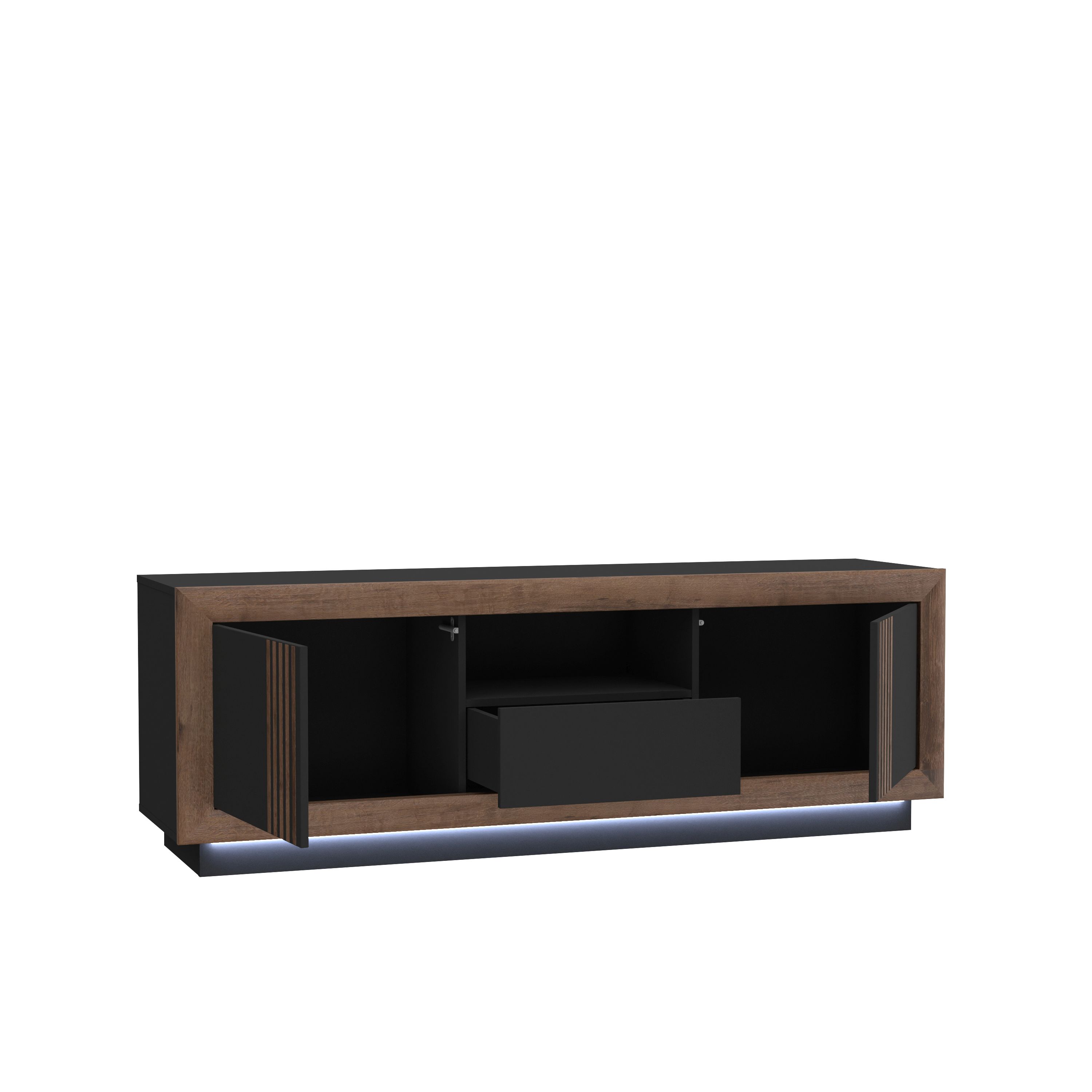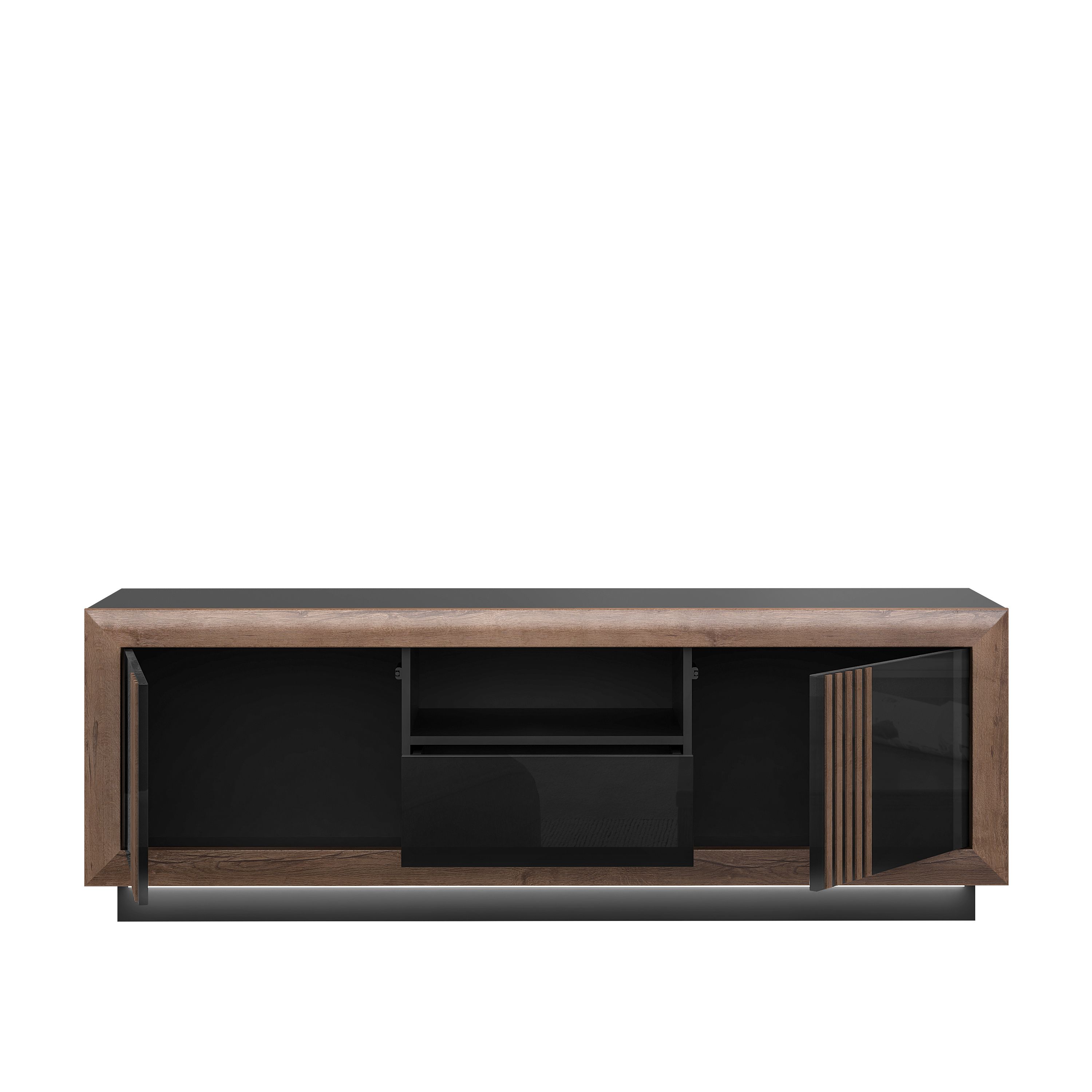 Front und Korpus: Mud Eiche Holznachbildung kombiniert mit Absetzungen in Black Hochglanz
