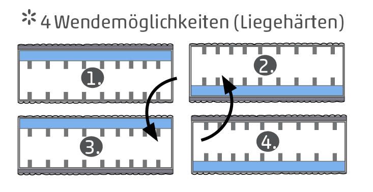 Je nach Platzierung des Kernes oder des Bezuges ist die Liegehärte individuell wählbar (4 Wendemöglichkeiten/Liegehärten).