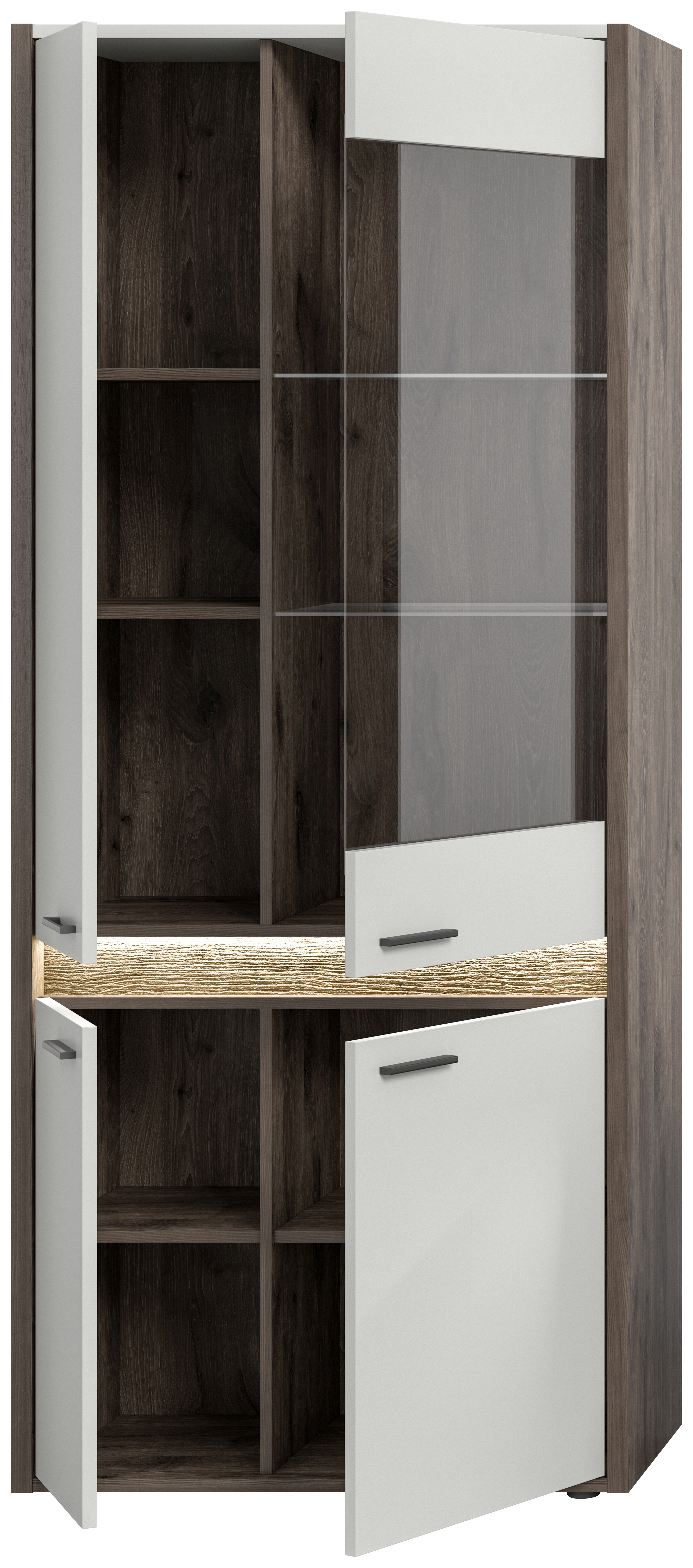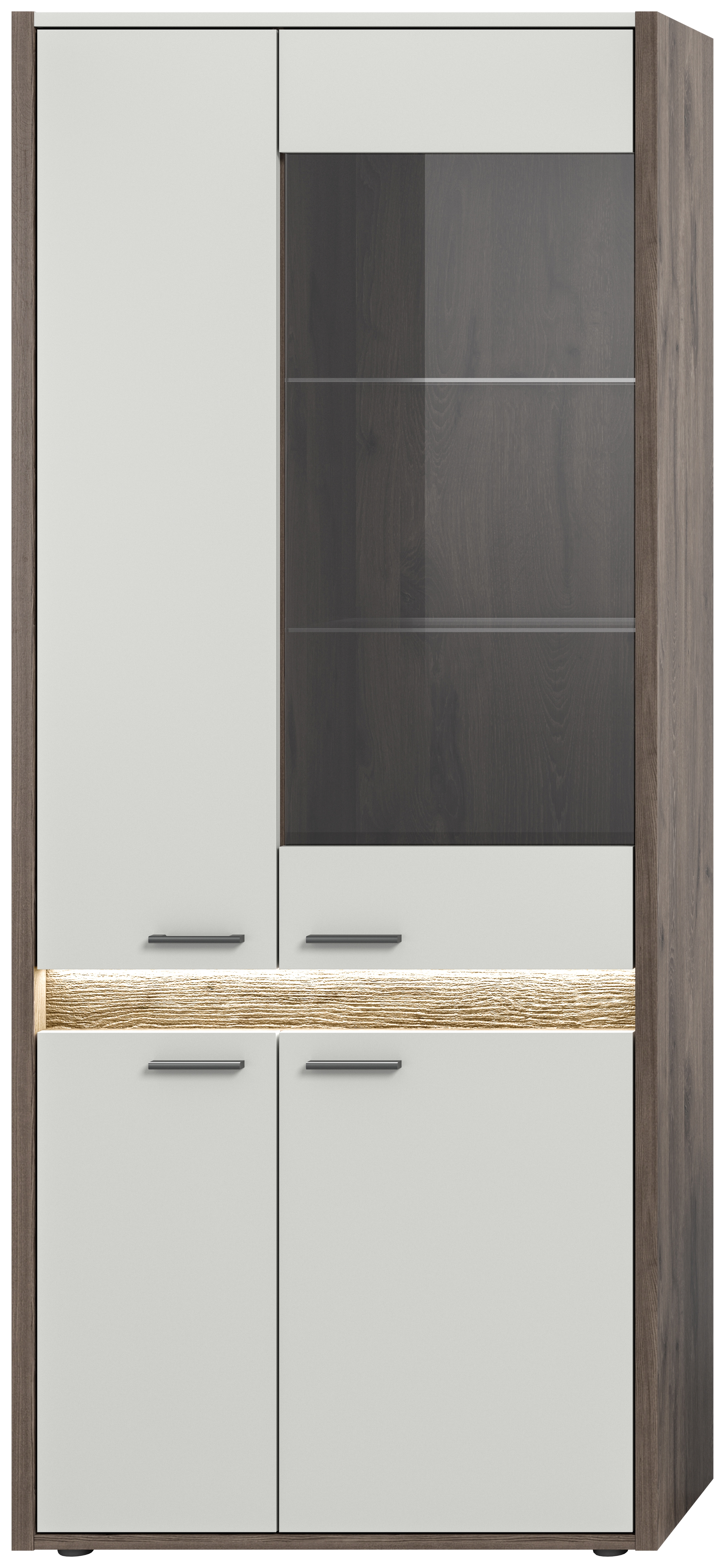 - Design/Stil: Moderne Vitrine in Nox Oak Dunkel und Hellgrau, die mit ihrem zeitgemäßen Design und der eleganten Farbkombination eine stilvolle Ergänzung darstellt und einen Hauch von Raffinesse in den Raum bringt.