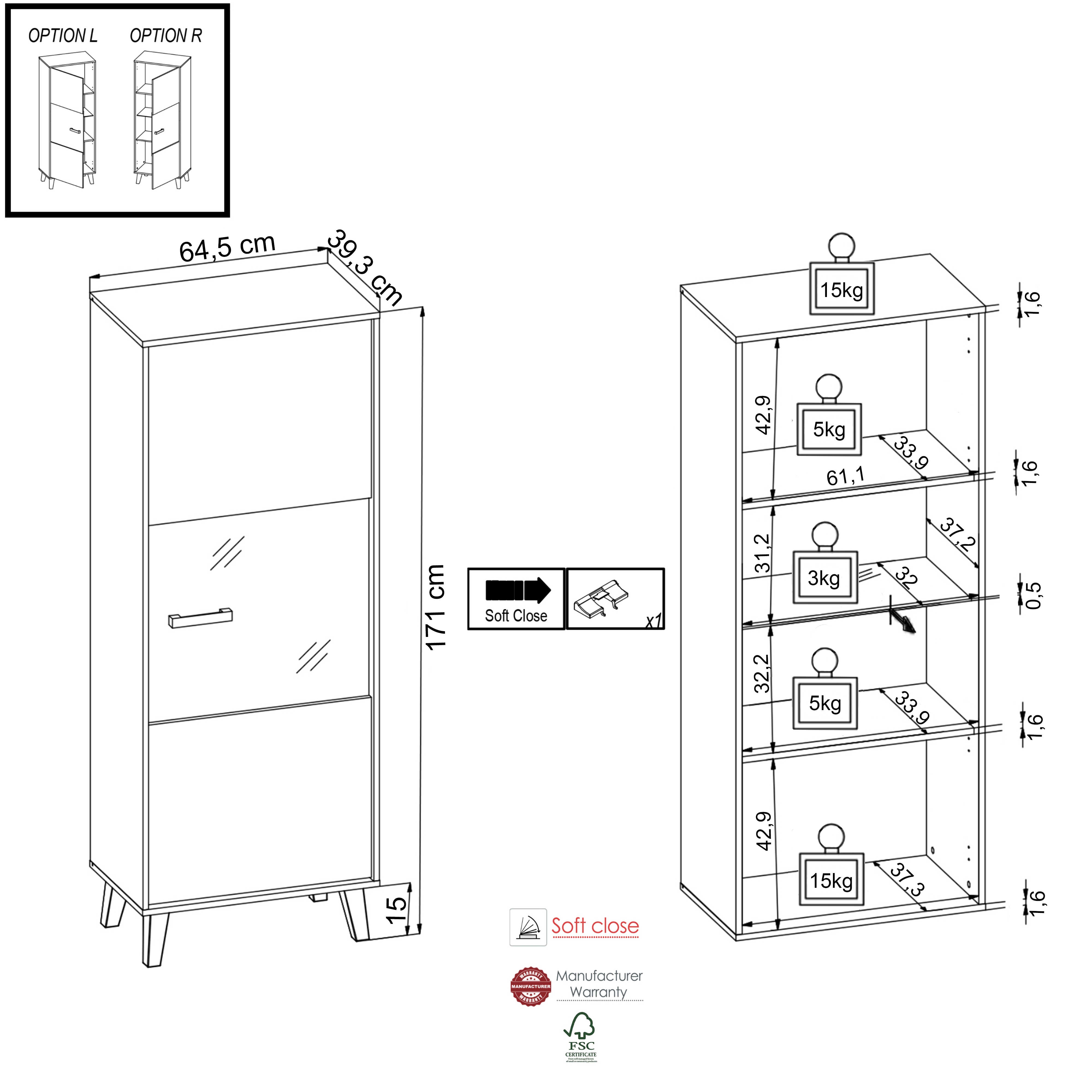 - Das Möbel besteht aus FSC®-zertifiziertem Holz, Glas und Ganzmetallscharnieren.