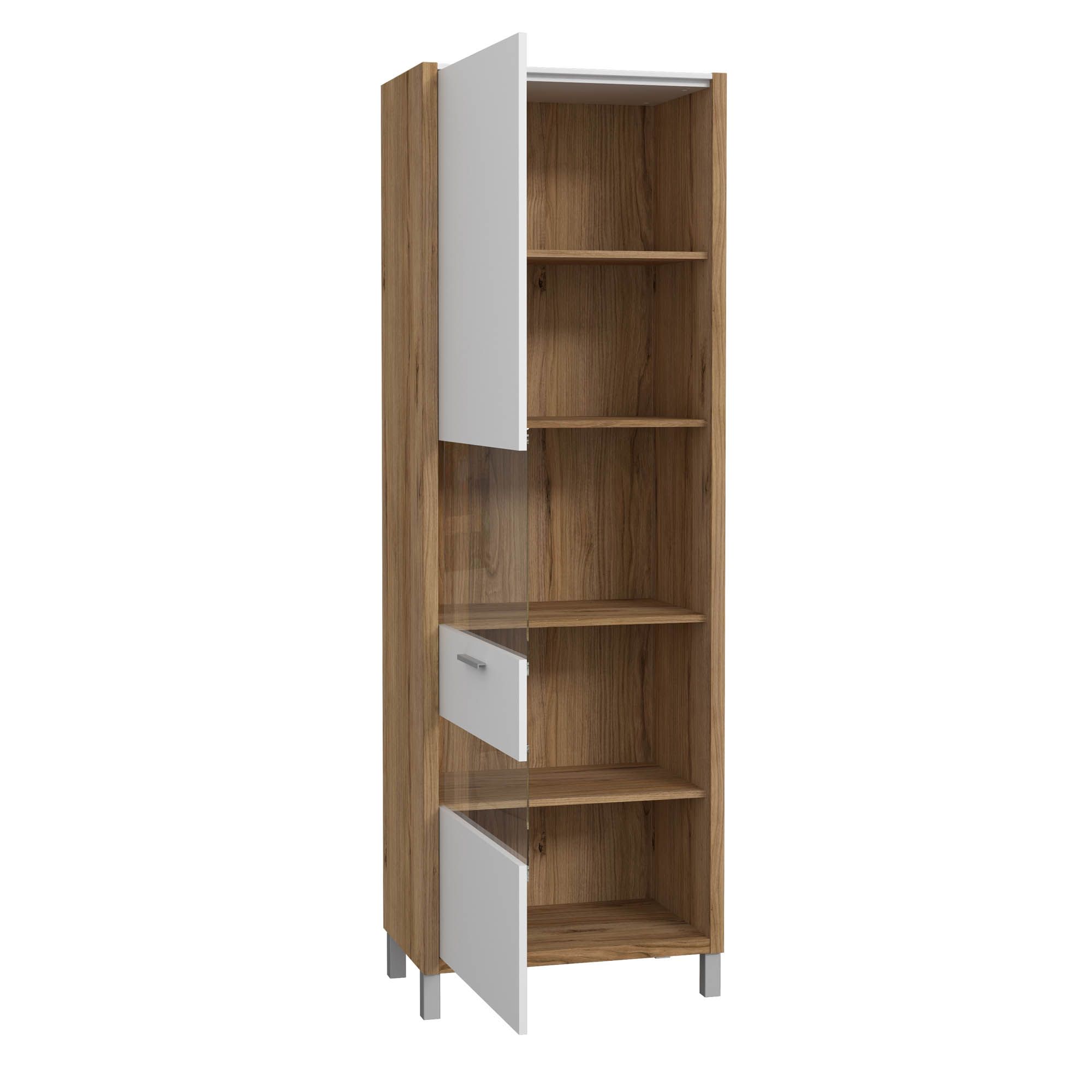 Front und Korpus: Weiß kombiniert mit Catania Eiche Holznachbildung / Glas