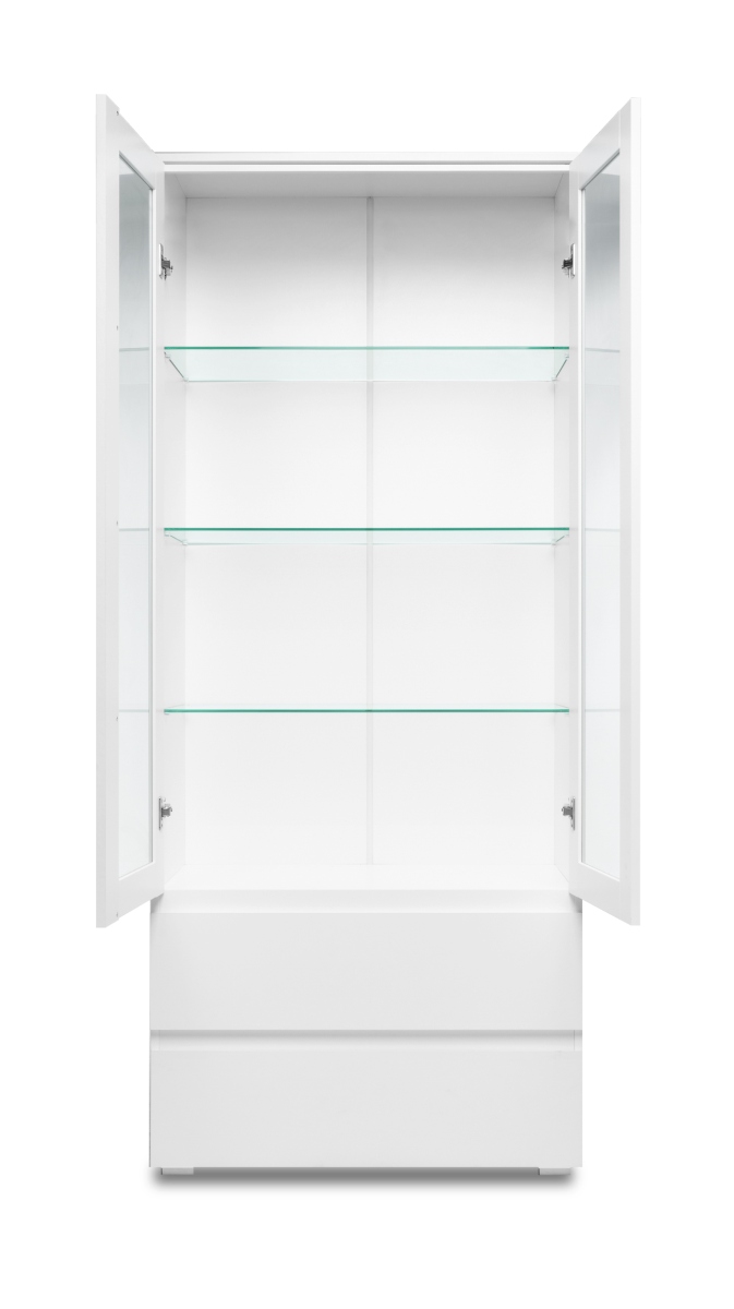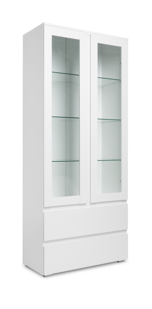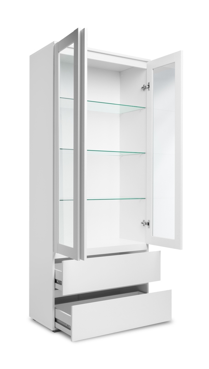 Korpus und Front: Weiß matt mit drehbarer Rückwand in Honigeiche Holznachbildung / Glas