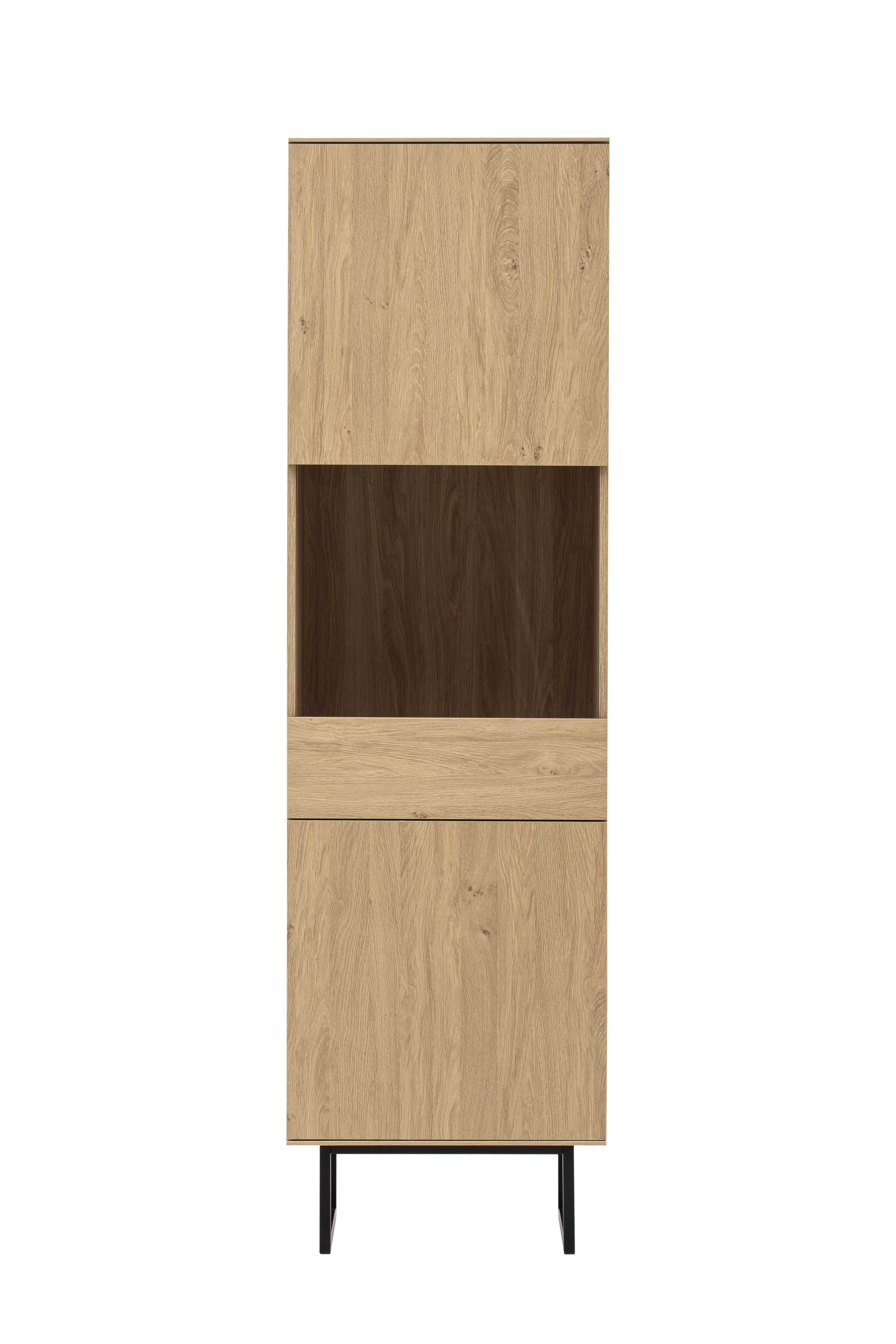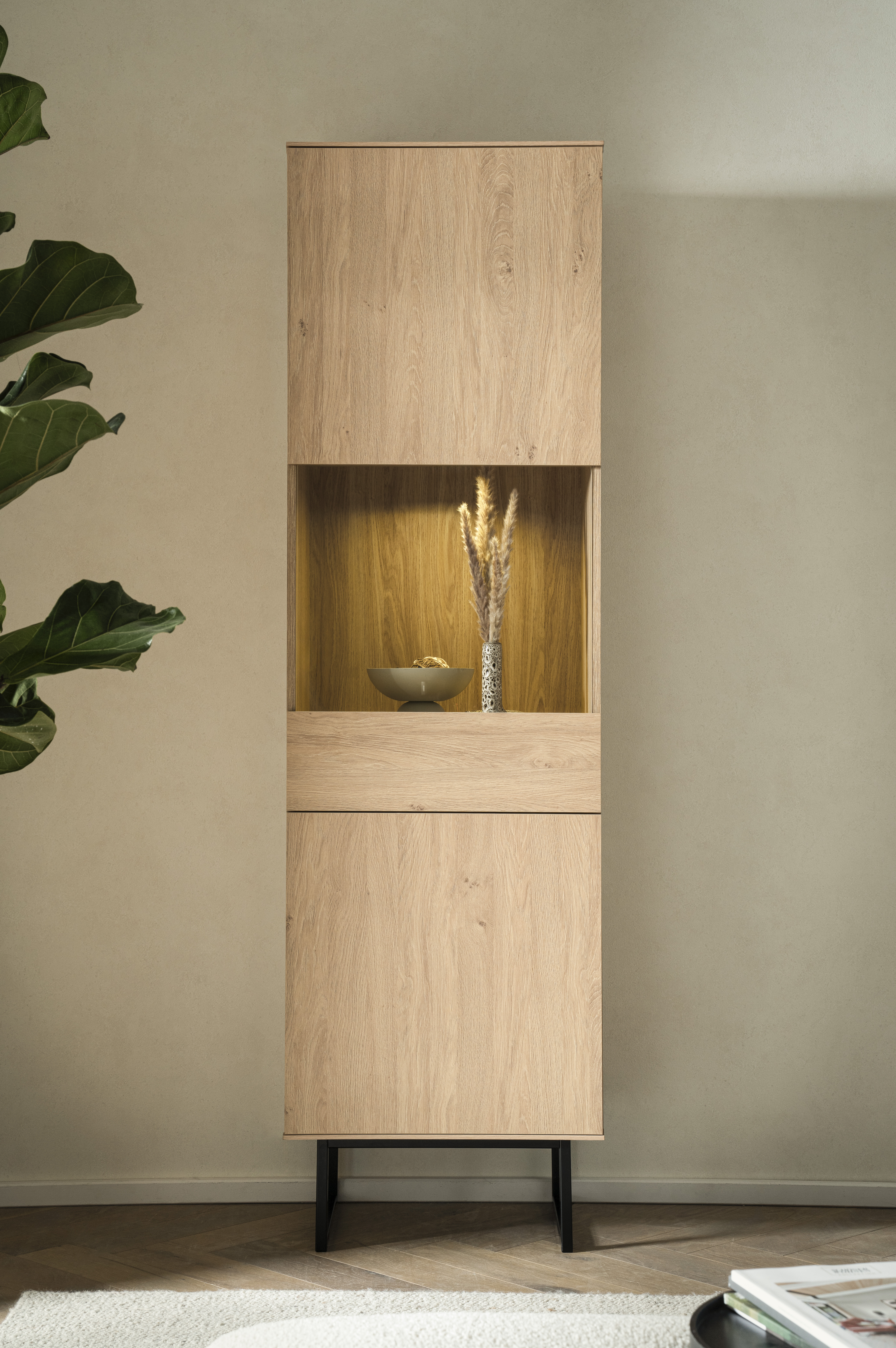 Das schwarz pulverbeschichtete Metallgestell verleiht der Vitrine Stabilität und einen modernen Kontrast zur warmen Holzoptik.