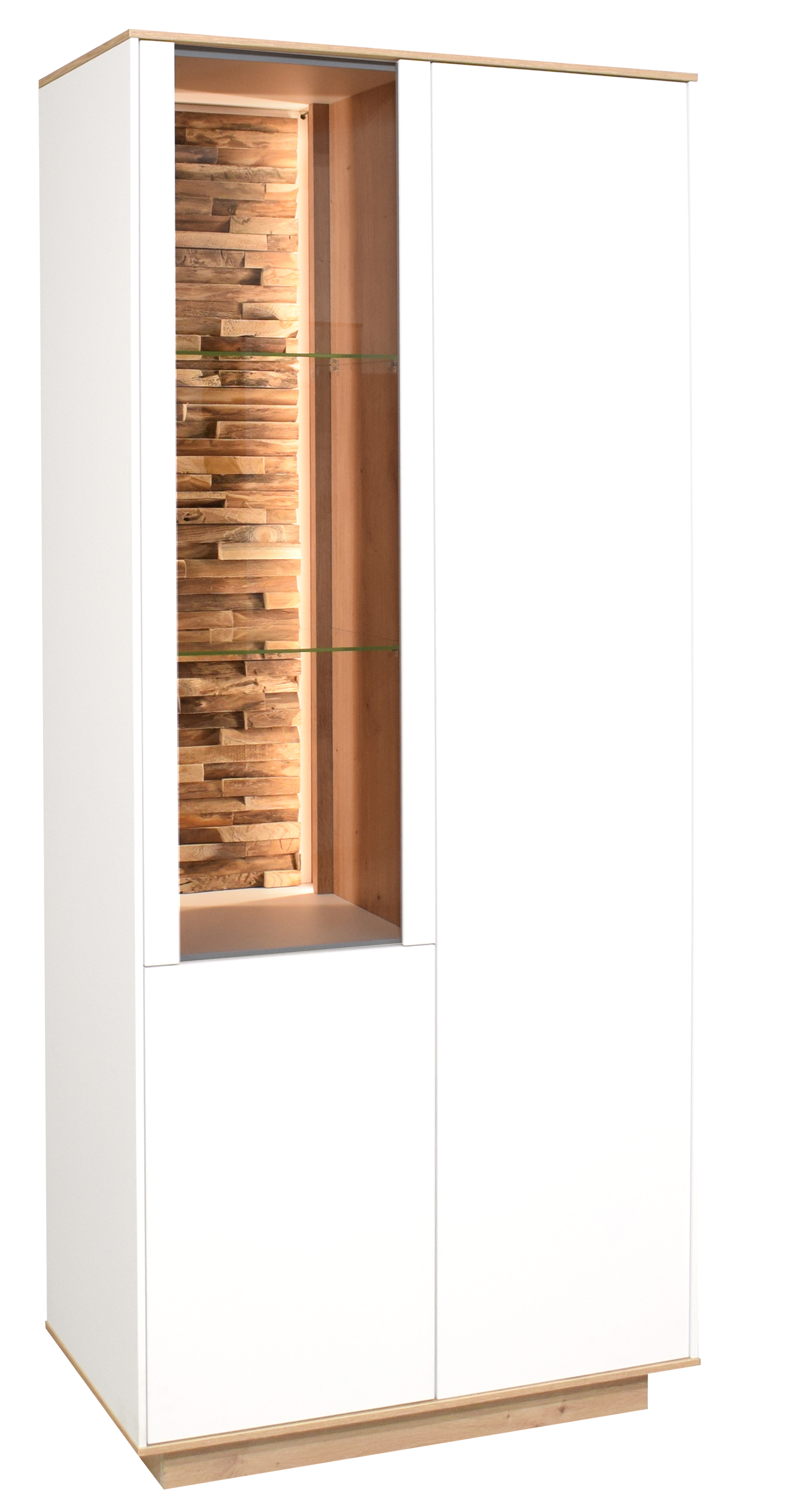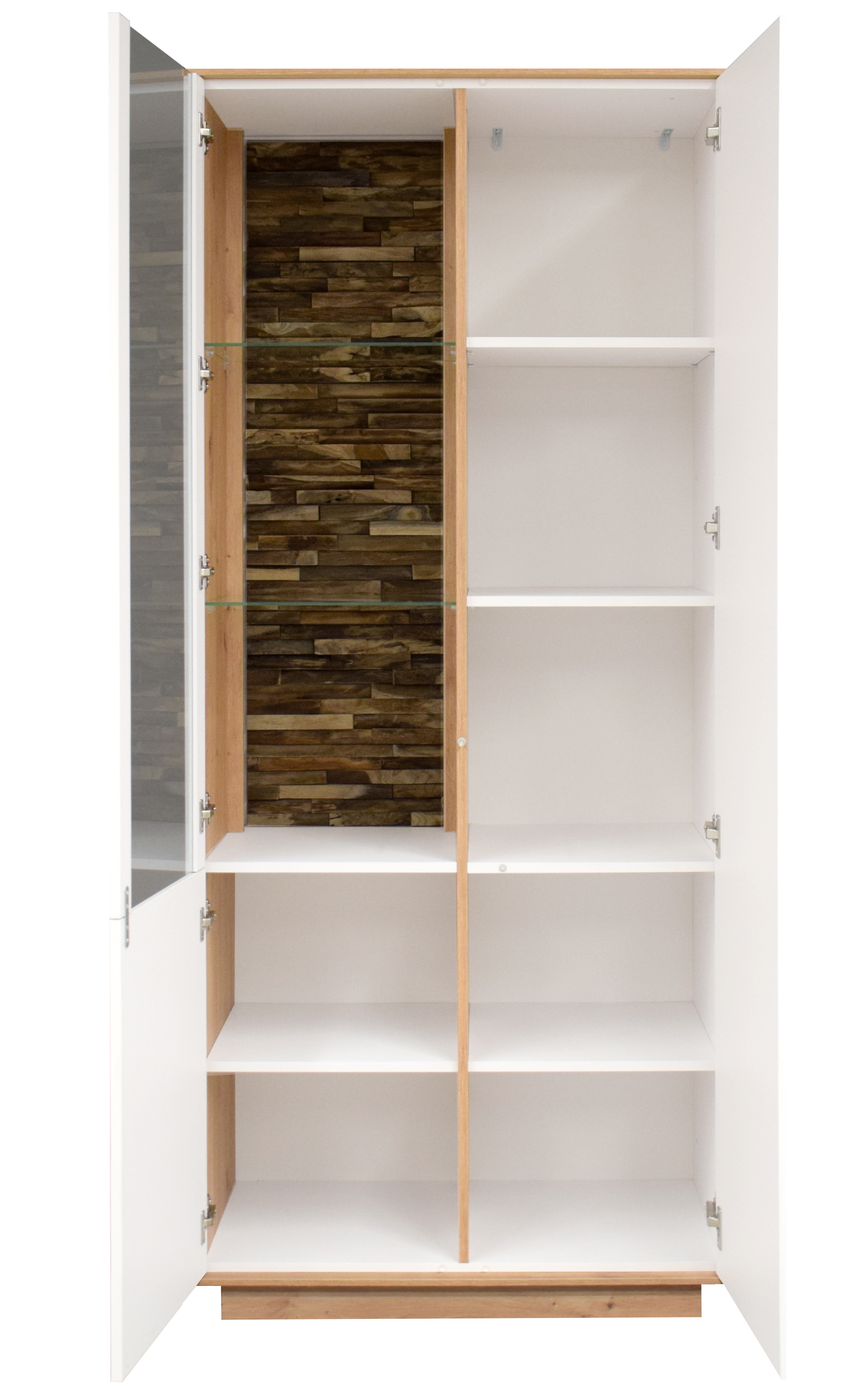 links: 1 Glastür & Tür verbunden, 3 Glaseinlegeböden, 1 Holzapplikation (4-teilig), 1 Mittelboden, 1 Einlegeboden