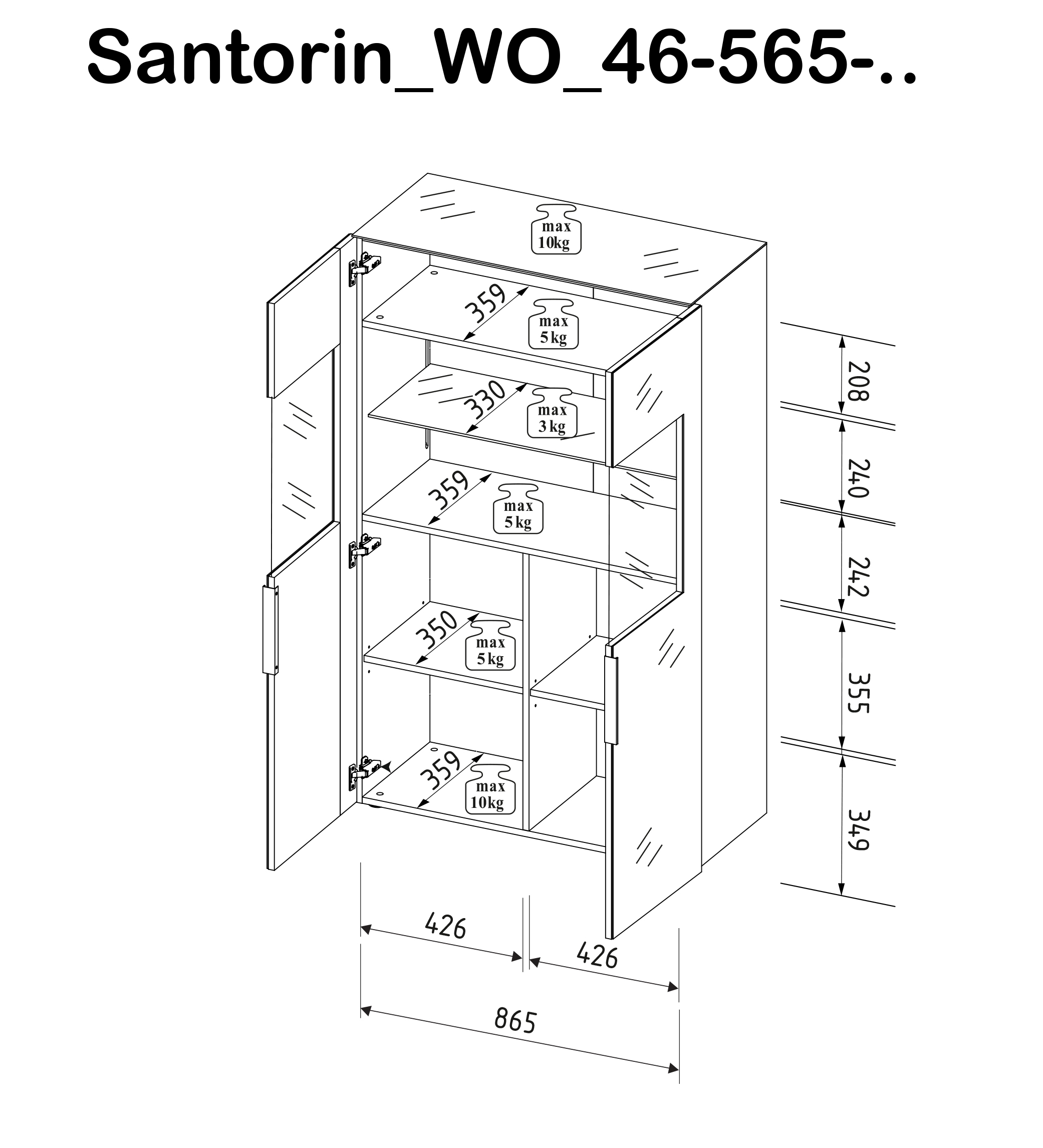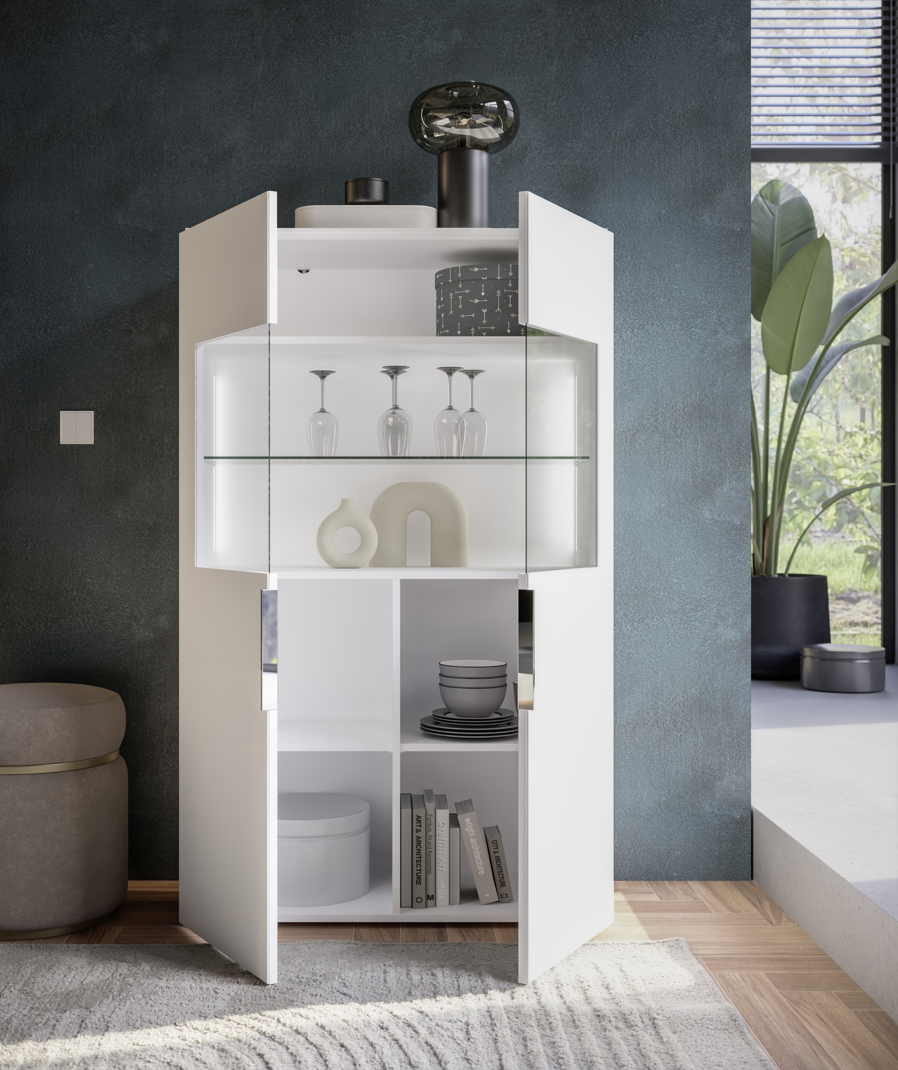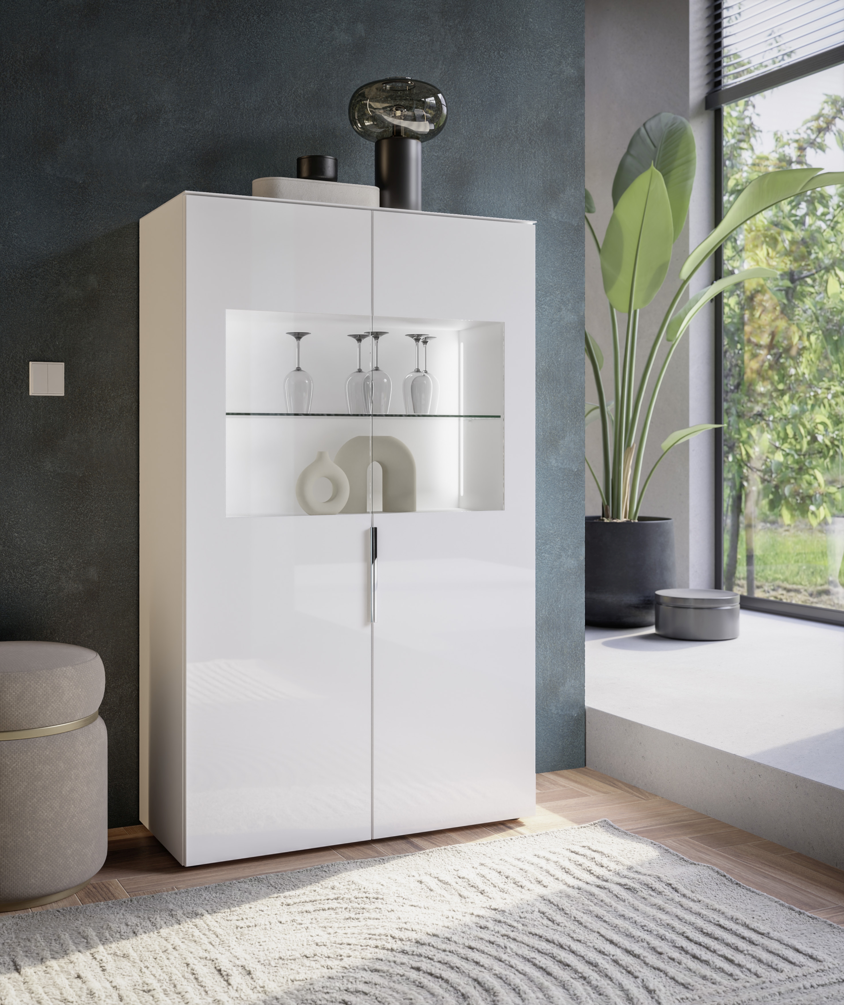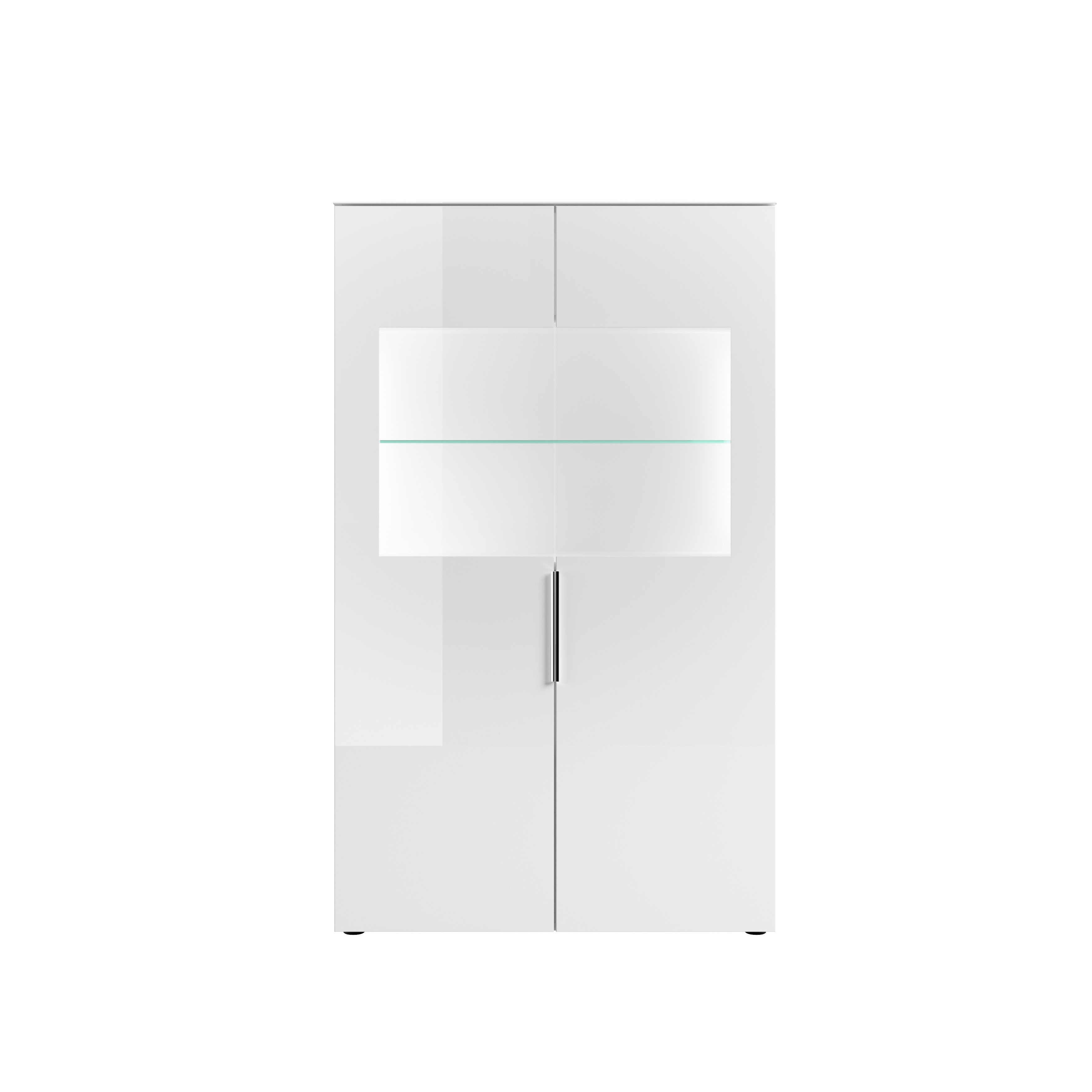 Der Korpus sowie die Front bestehen aus weiß melaminbeschichteter Spanplatte und sind damit pflegeleicht und widerstandsfähig im Alltag. Die teilverglasten Türen setzen gezielte optische Akzente, während runde Möbelgleiter aus schwarzem Kunststoff für stabilen Stand und bodenschonende Platzierung sorgen.