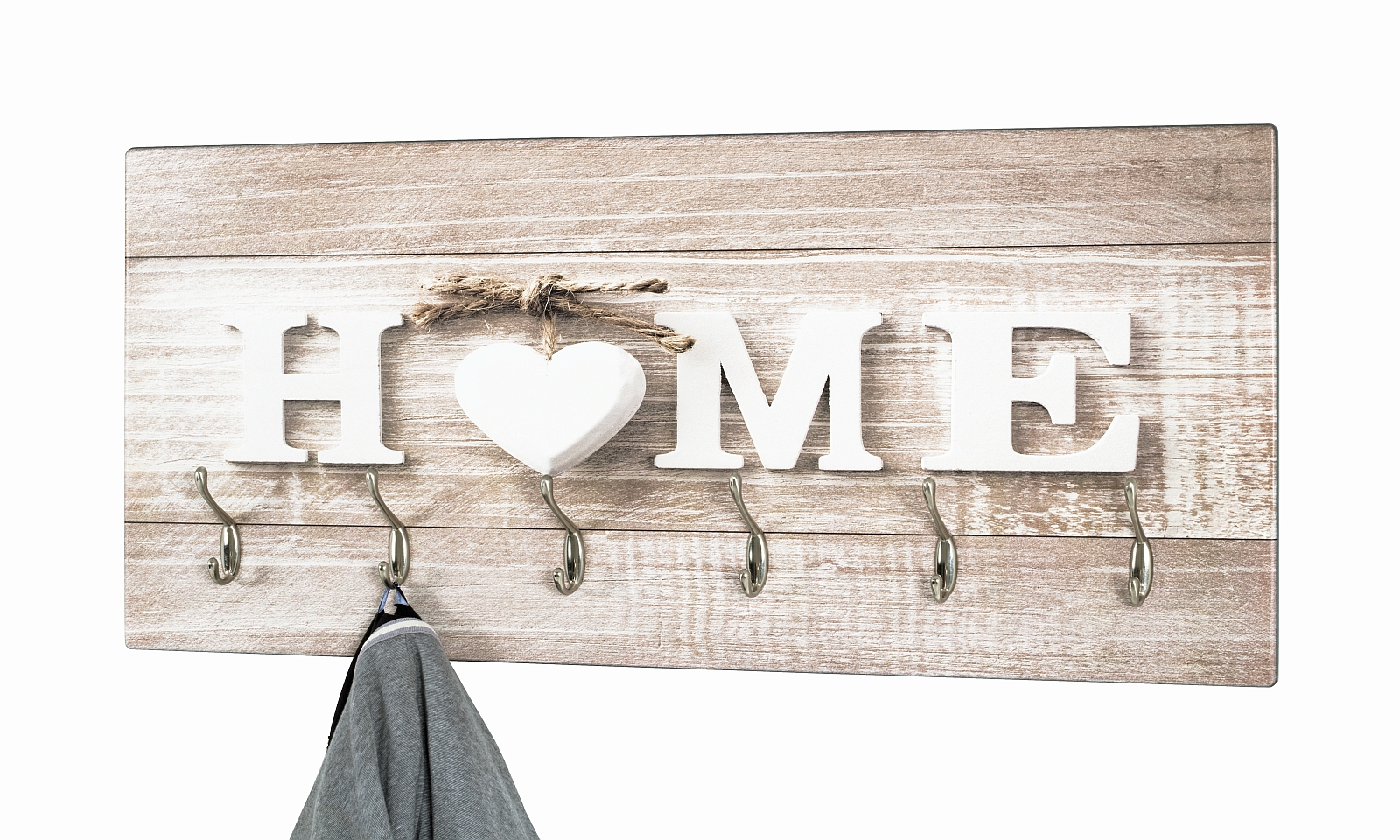 aus MDF (Mitteldichte Holzfaserplatte) mit Motivdruck HOME mit Garderobenhaken in Edelstahloptik