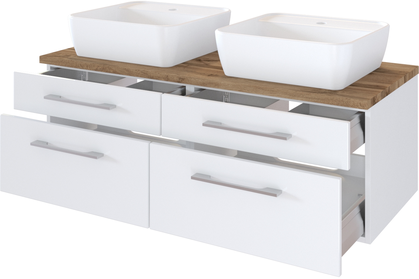 1 Waschbeckenunterschrank mit 2 Schubkästen und 2 Auszügen mit Softclose-Funktion, inklusive Siphonausschnitte