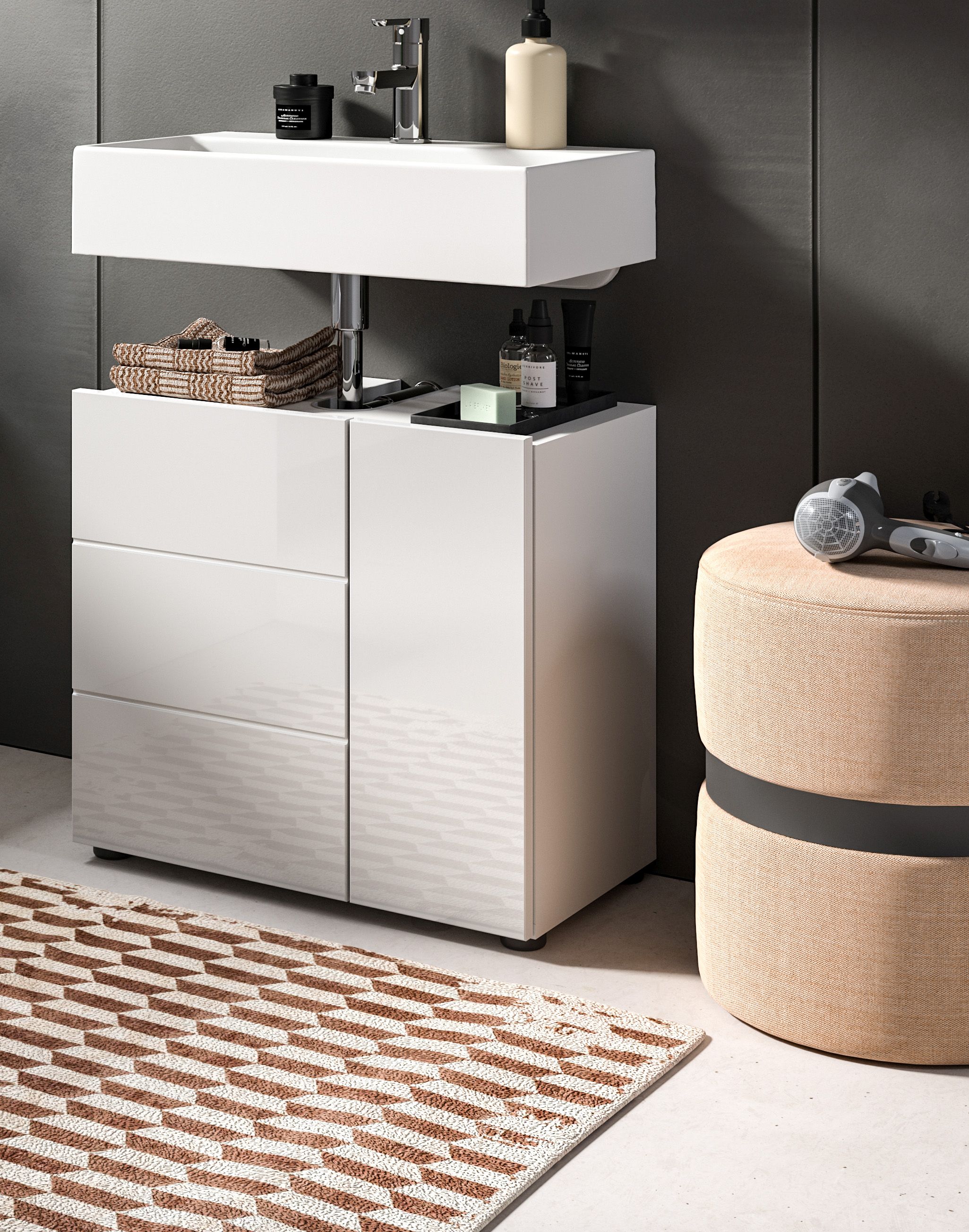 - Einsatzbereich: Geeignet für den Einsatz im Badezimmer, insbesondere unter einem Waschbecken, um zusätzlichen Stauraum zu schaffen und gleichzeitig das ästhetische Erscheinungsbild des Raums zu verbessern.