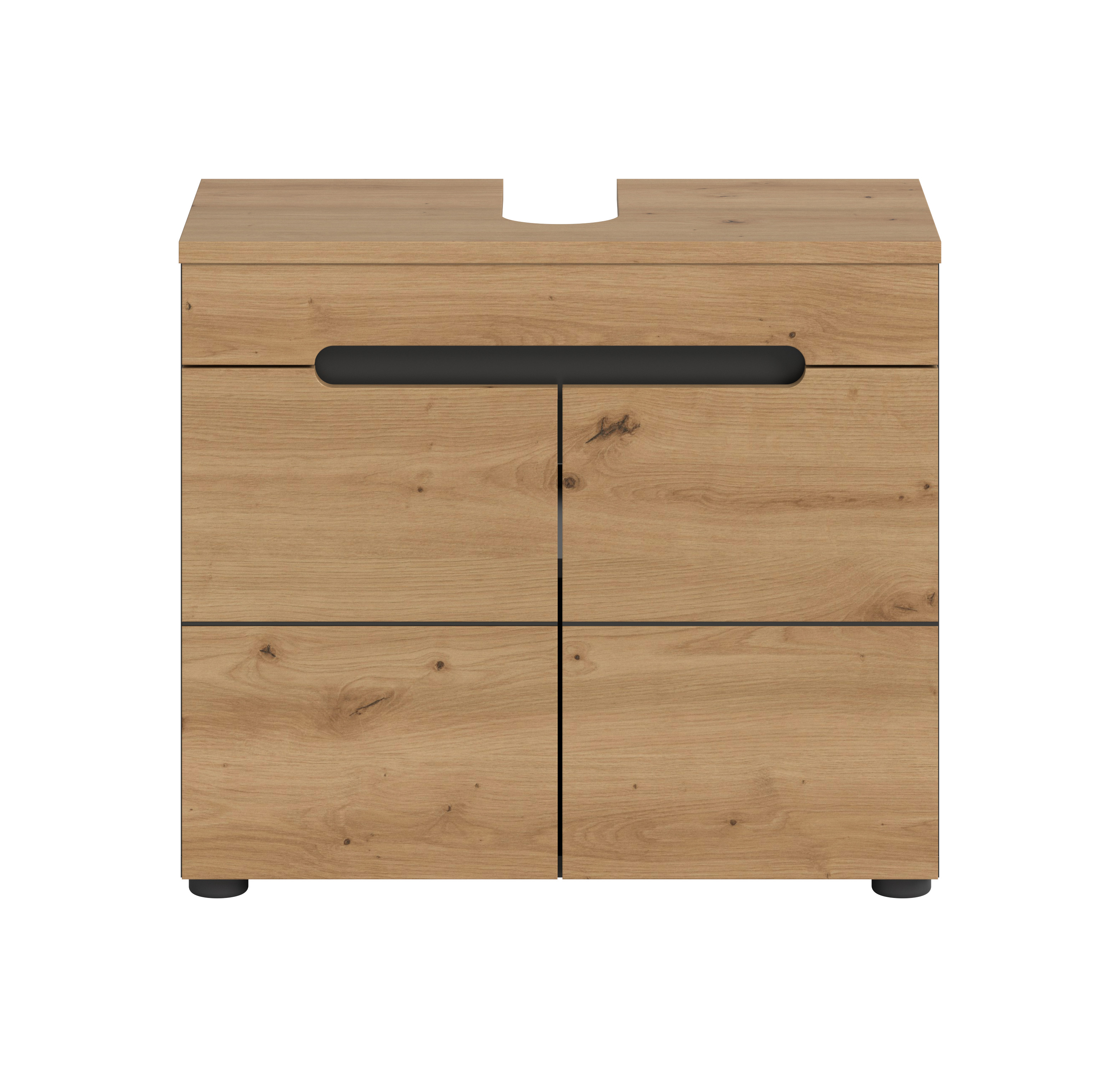 In einer stilvollen Basalt Grau Nachbildung kombiniert mit einer Artisan Nachbildung in Holzoptik, überzeugt er durch eine naturgetreue Maserung und einen eleganten schwarzen Innenraum. Der Schrank bietet mit einem Regalboden zwei großzügige Fächer, die ideal für die Aufbewahrung von Handtüchern, Reinigungsmitteln oder Badezimmerutensilien sind.