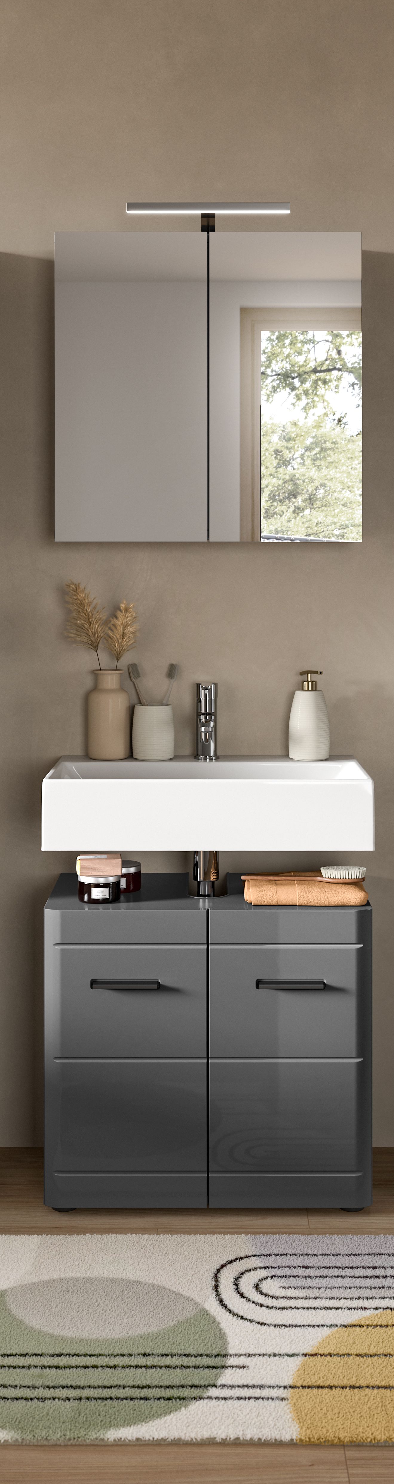 - Design/Stil: Der Waschbeckenunterschrank in grauer Nachbildung mit grauem Hochglanz tiefzieh präsentiert sich mit einem modernen und zeitgemäßen Design, das durch seine glänzende Oberfläche und klare Linien eine ansprechende Ästhetik im Badezimmer schafft, die gleichzeitig schlicht und elegant ist.