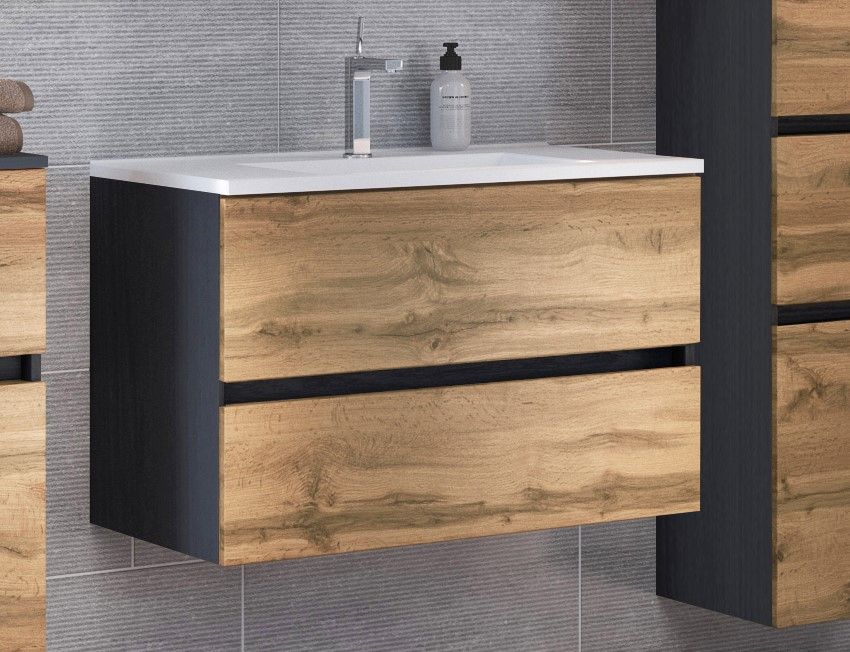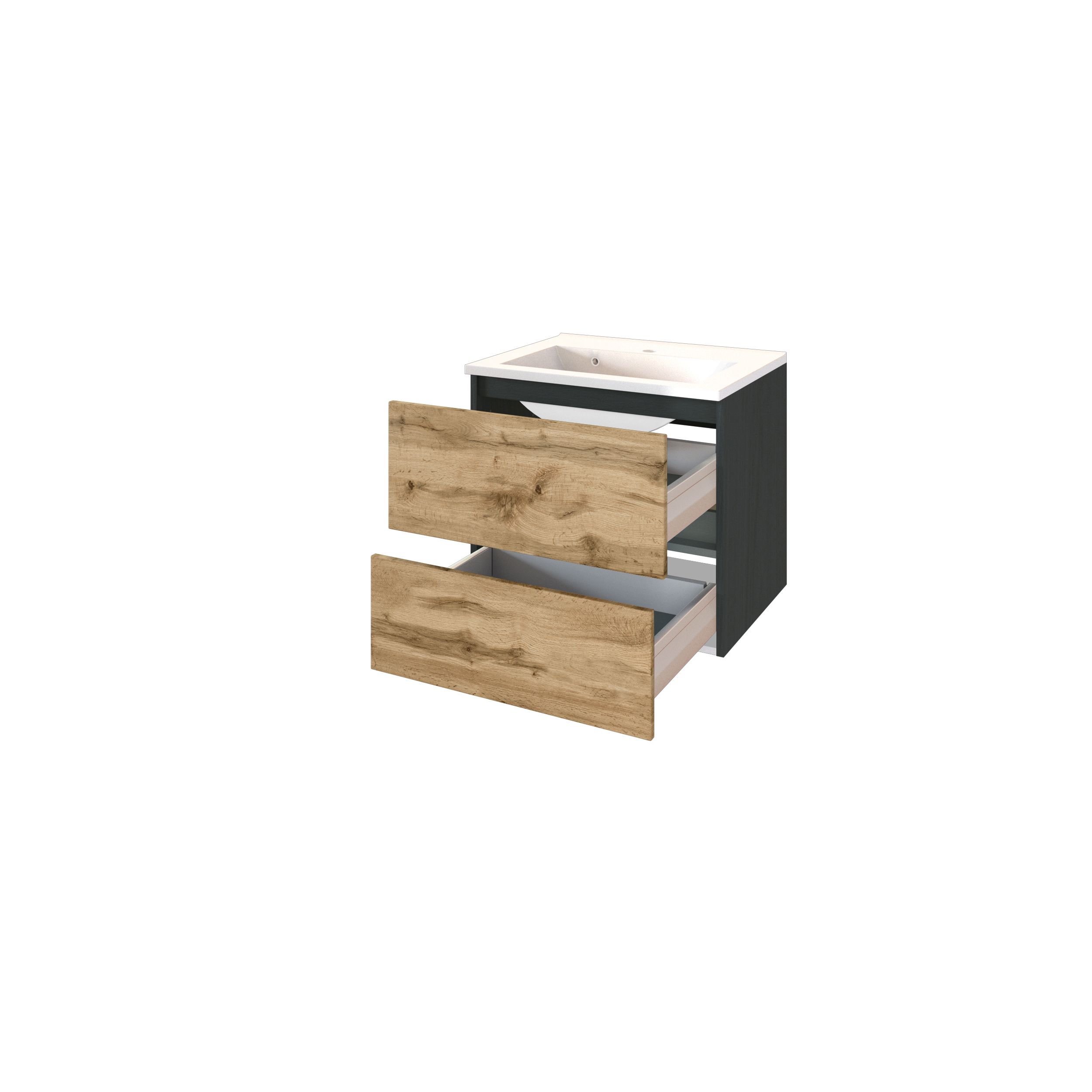 1 Waschbeckenunterschrank mit 2 Metallauszügen mit Softclose-Funktion und Reling, grifflos
