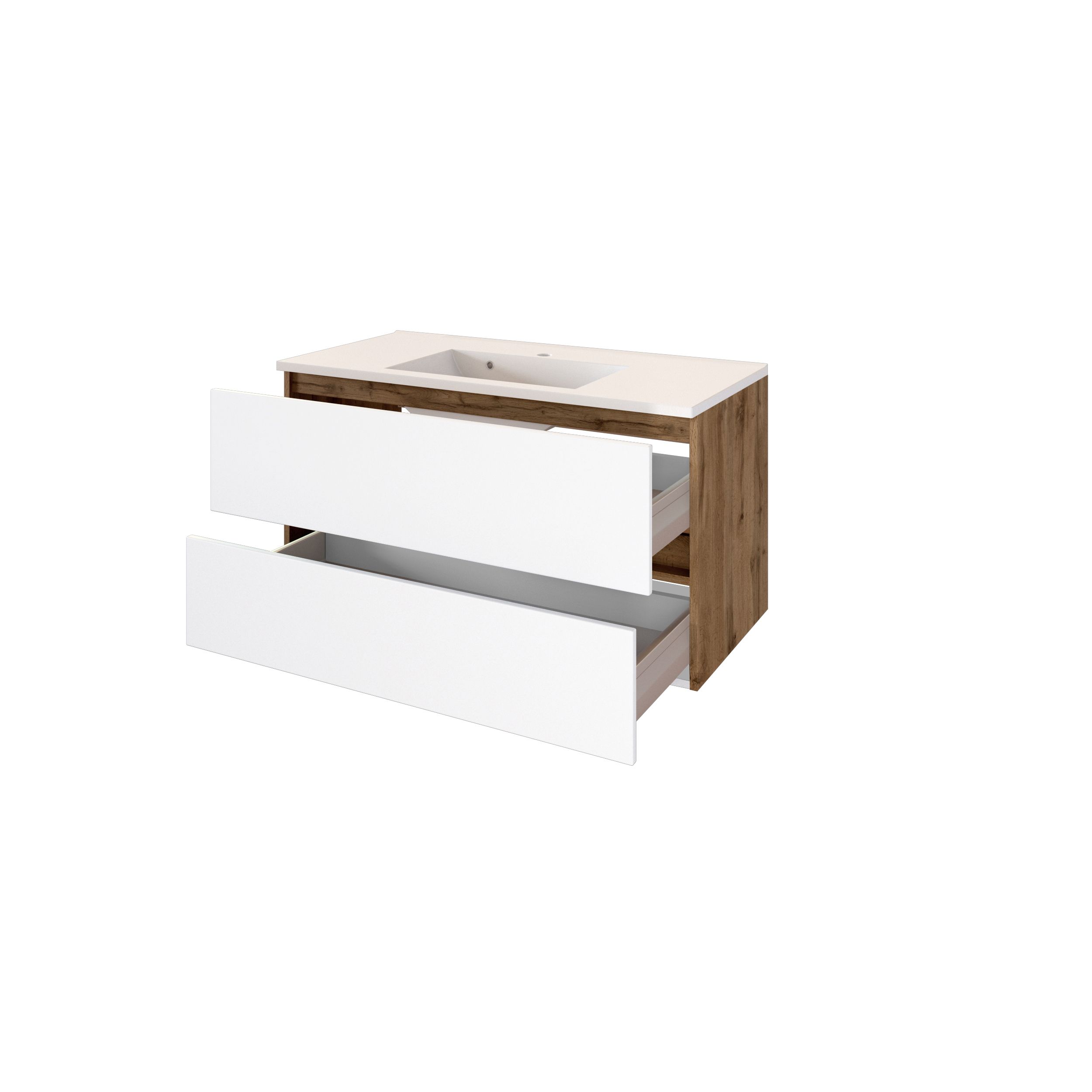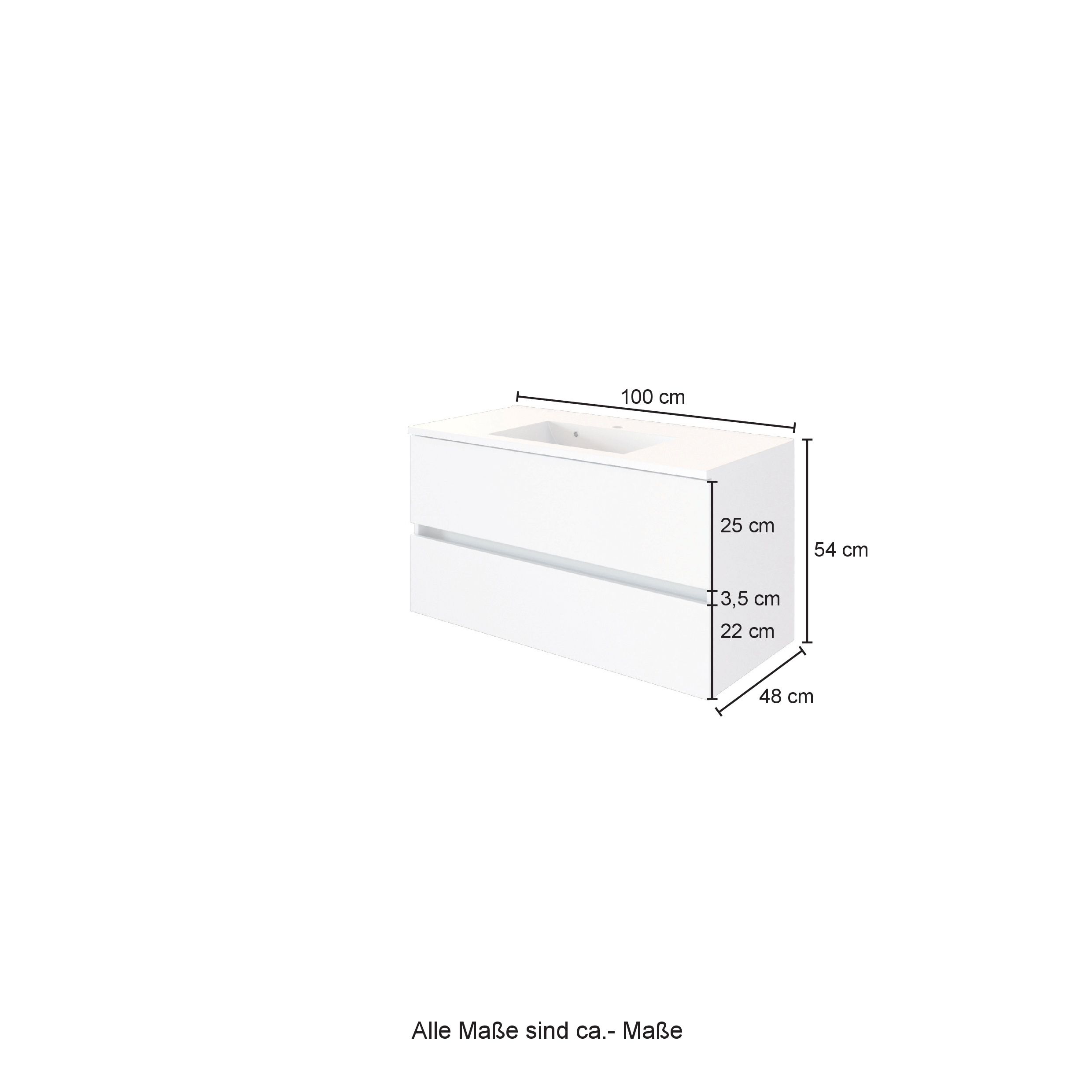 1 Waschbeckenunterschrank mit 2 Metallauszügen mit Softclose-Funktion und Reling, grifflos