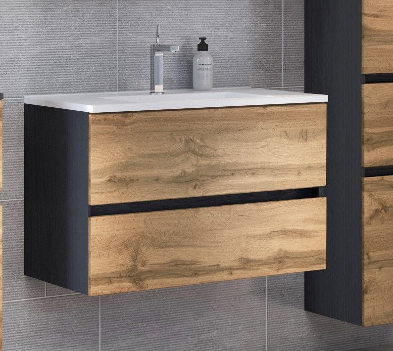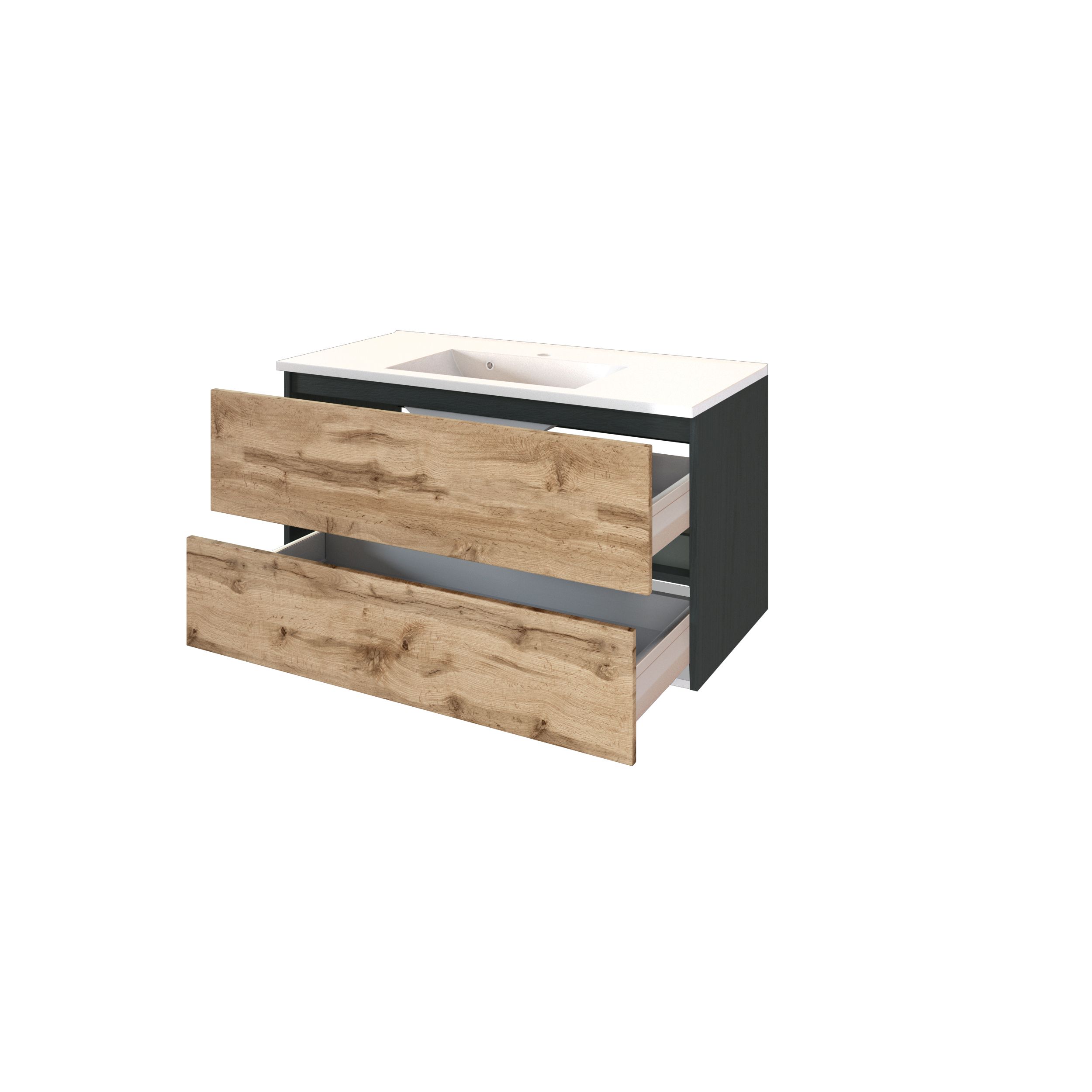 1 Waschbeckenunterschrank mit 2 Metallauszügen mit Softclose-Funktion und Reling, grifflos
