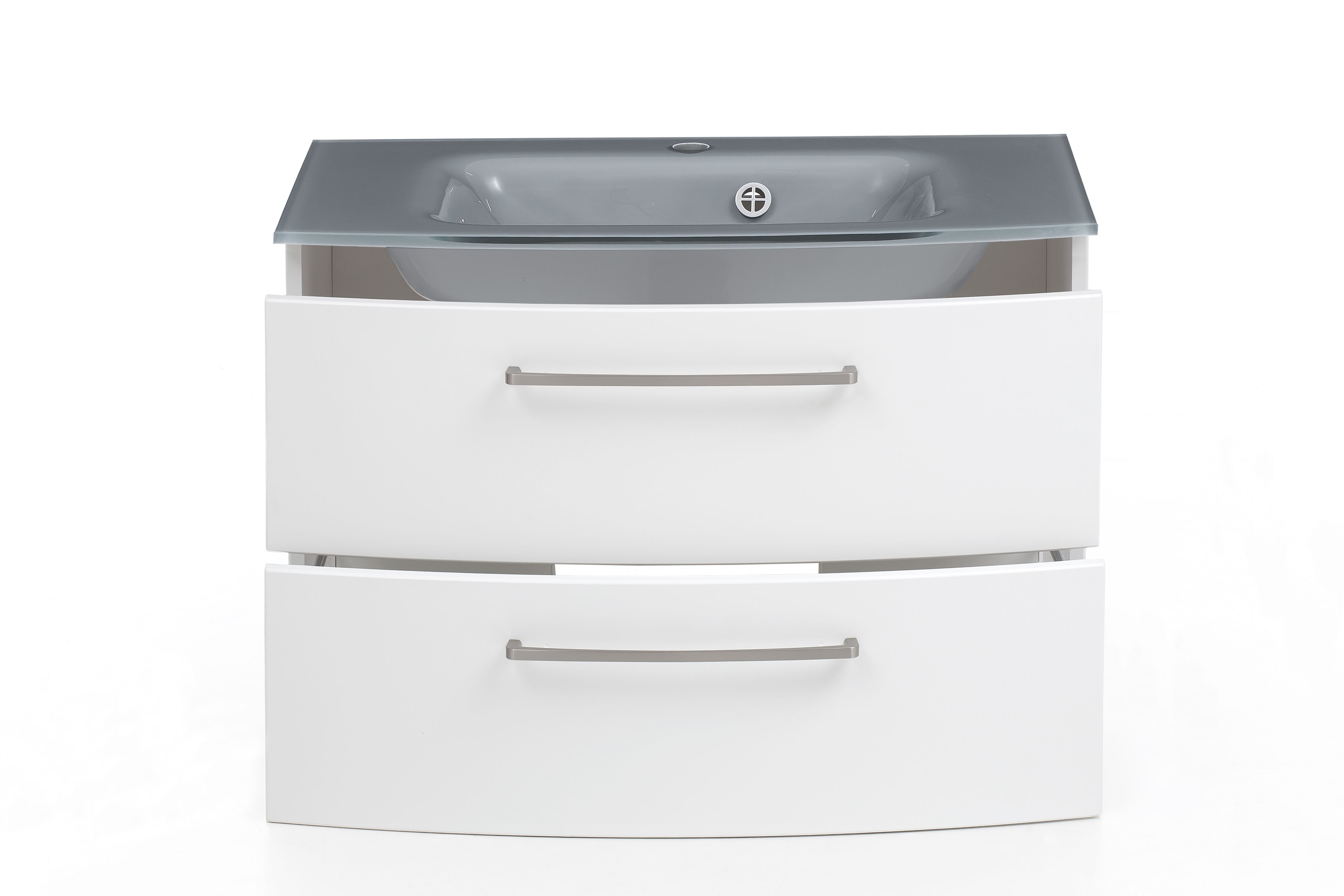 1 Waschbeckenunterschrank mit 2 Schubkästen mit Softclose-Funktion (Vollauszüge), unterer Auszug mit Reling inklusive gebogenen Fronten