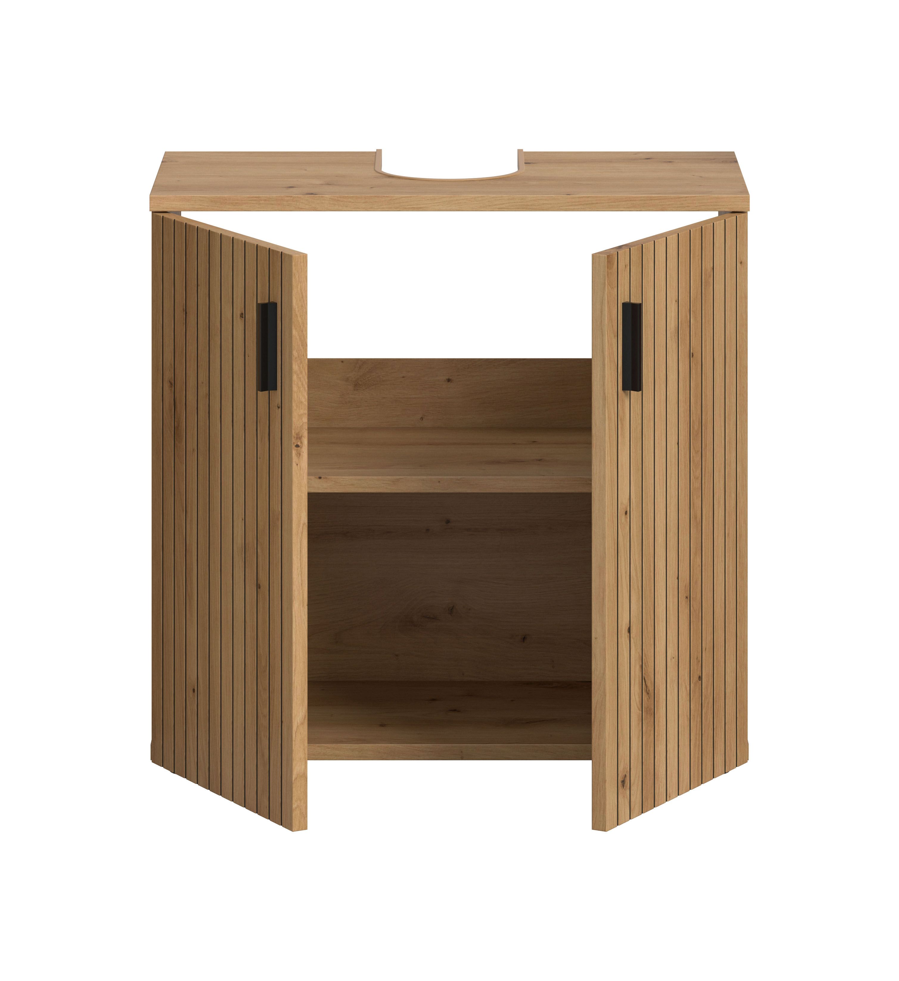 Der Waschbeckenunterschrank in Artisan Oak Nachbildung (60 x 59 x 30 cm) ist eine praktische und stilvolle Ergänzung für dein Bad. Mit zwei Türen, einem höhenverstellbaren Einlegeboden, zwei Fächern sowie einem Siphonausschnitt und einer Rückwand mit Aussparung bietet er optimalen Stauraum und einfache Installation. Die pflegeleichte Front mit eingefräster Paneeloptik ist hochwertig verarbeitet und verleiht deinem Bad eine warme, natürliche Optik. Durch die vielfältigen Kombinationsmöglichkeiten der Serie kannst du deinen Badbereich individuell und funktional gestalten. Dieser Waschbeckenunterschrank verbindet Qualität, Design und praktische Nutzung für ein organisiertes Bad.