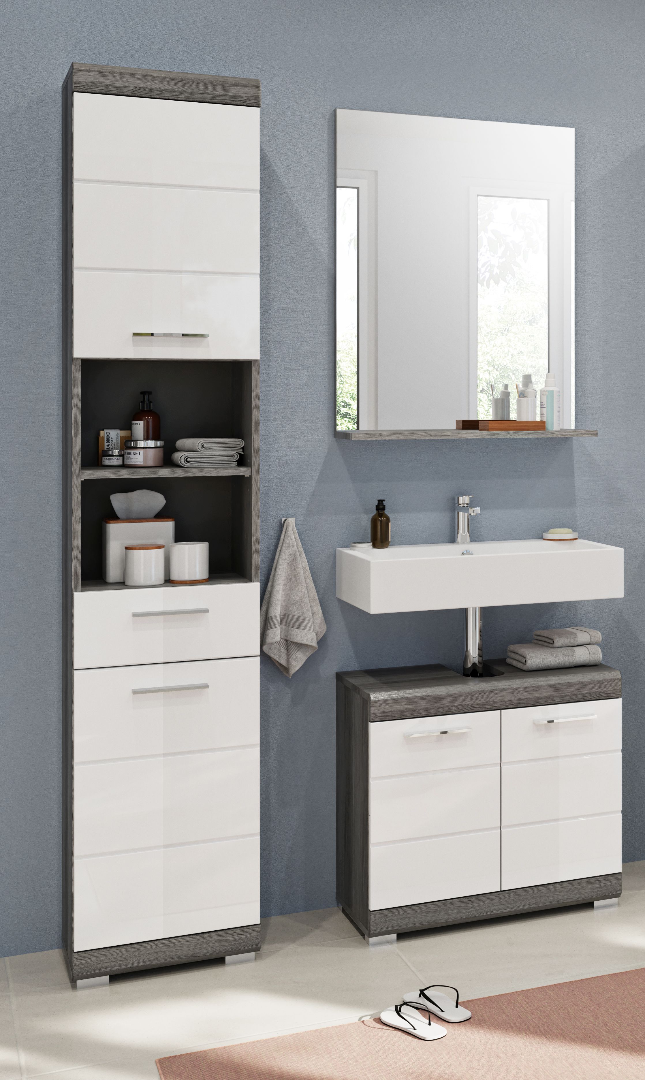 In unserem modernen Sortiment präsentieren wir einen Badezimmer Waschbeckenunterschrank in angesagter Rauchsilber Nachbildung und weißem Hochglanz tiefgezogenem Finish, der deinem Badezimmer einen modernen Look verleiht. Mit kompakten Maßen von 60x56x34 cm bietet er nicht nur praktischen Stauraum, sondern auch ein stilvolles Design. Entdecke die perfekte Kombination aus Funktionalität und trendigem Chic mit diesem angesagten Waschbeckenunterschrank.