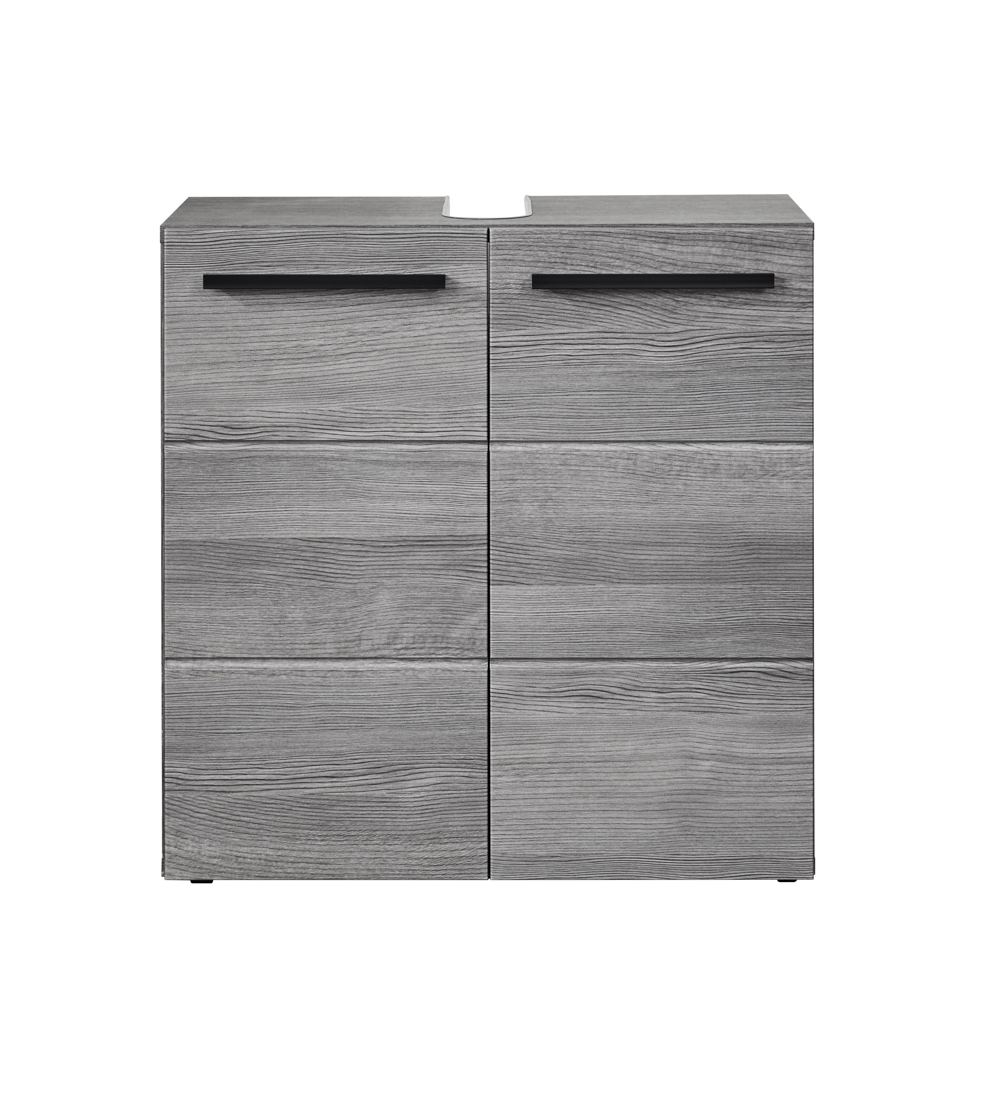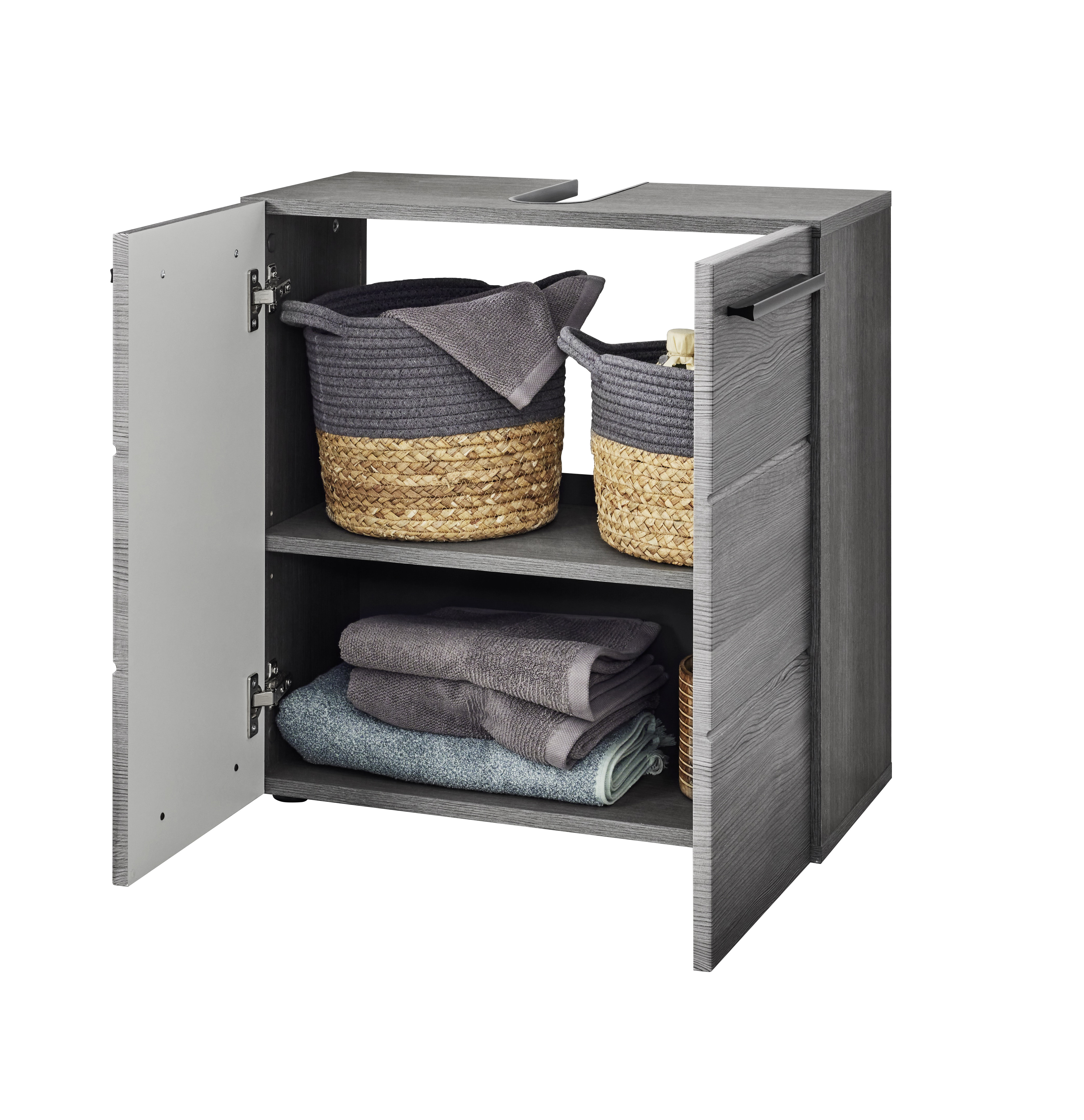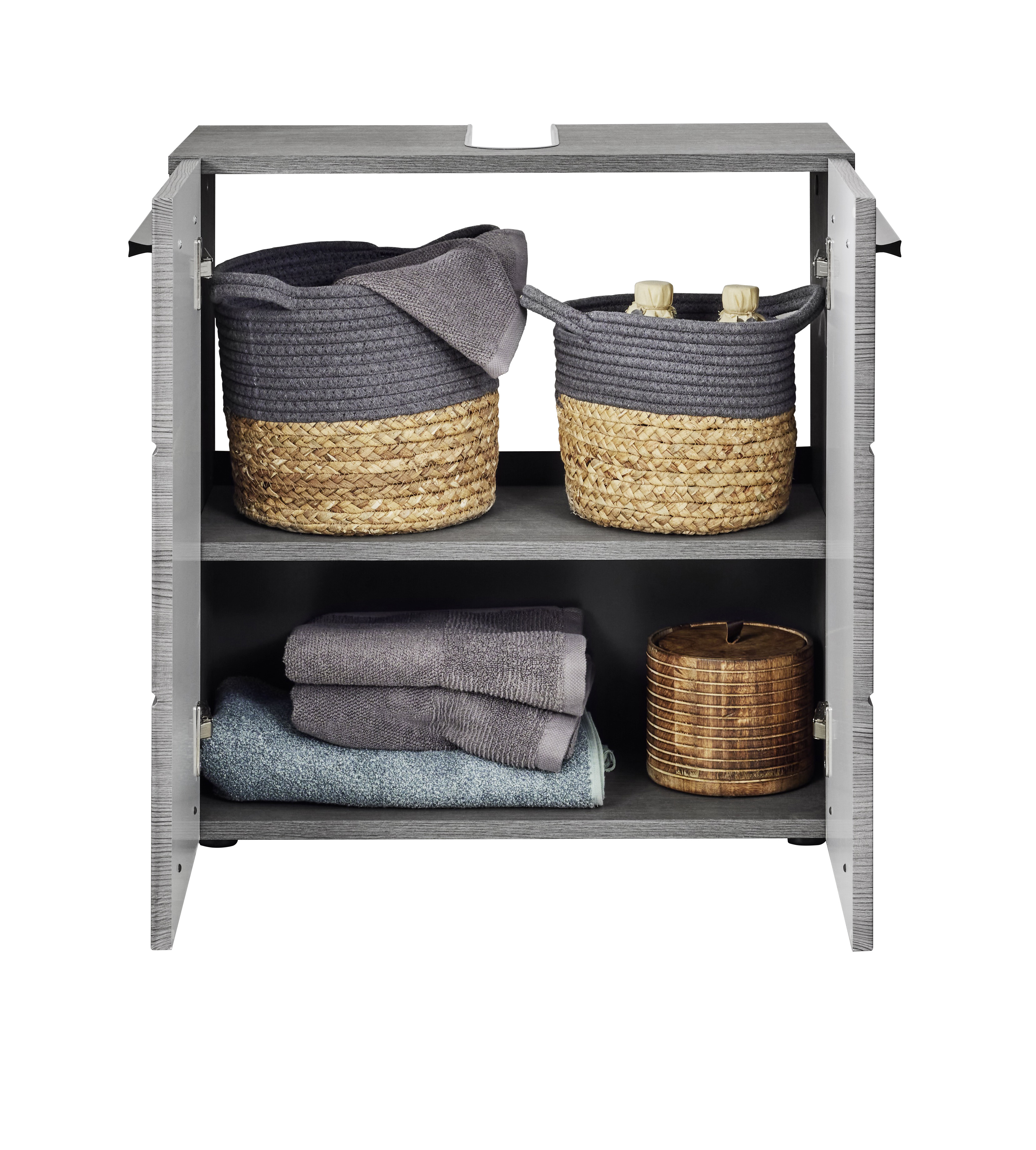 Im Inneren bietet ein praktischer Einlegeboden ausreichend Stauraum für Pflegeprodukte, Handtücher oder Reinigungsutensilien. Dank des integrierten Siphonausschnitts ist der Unterschrank optimal für den Einsatz unter dem Waschbecken geeignet.