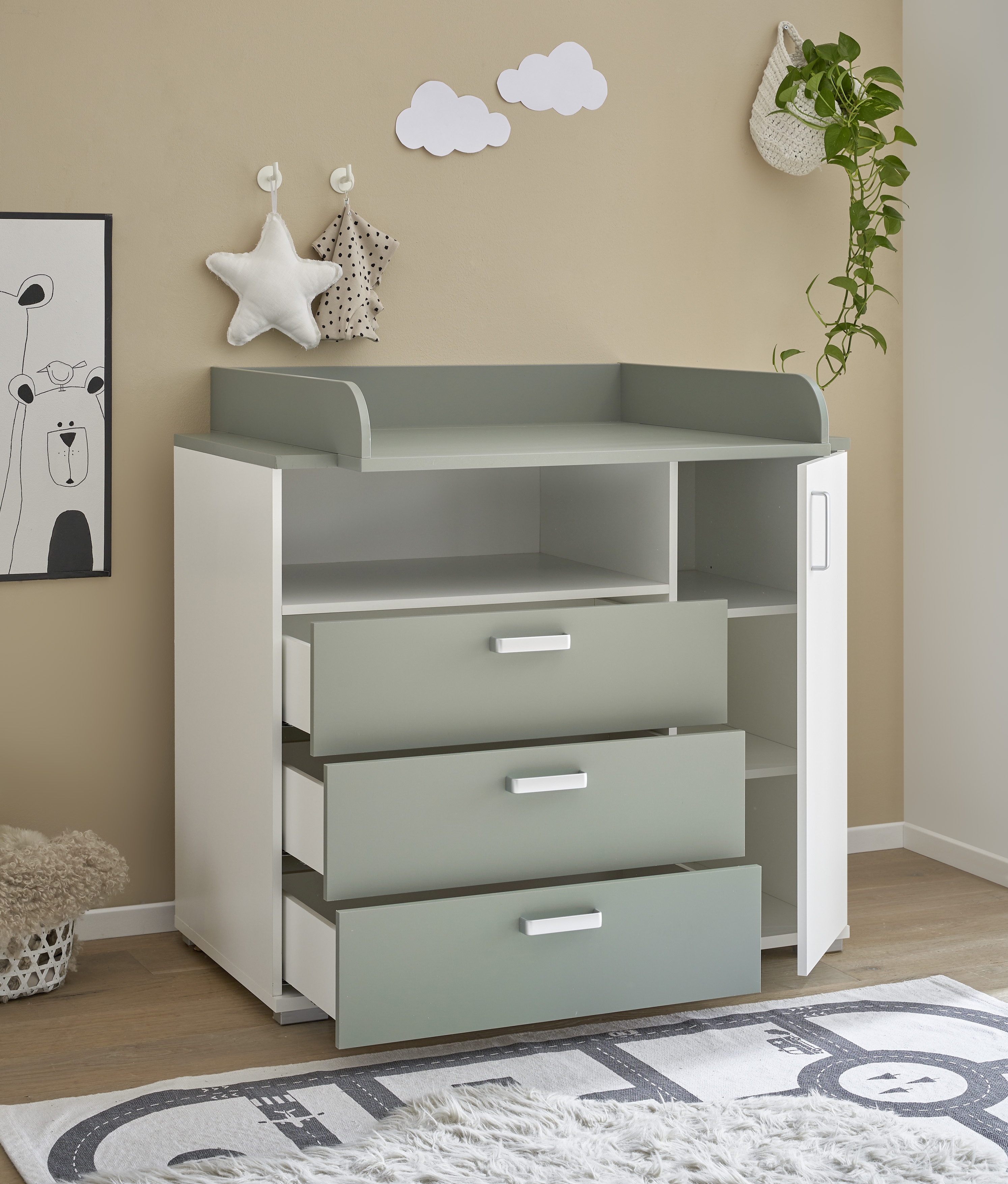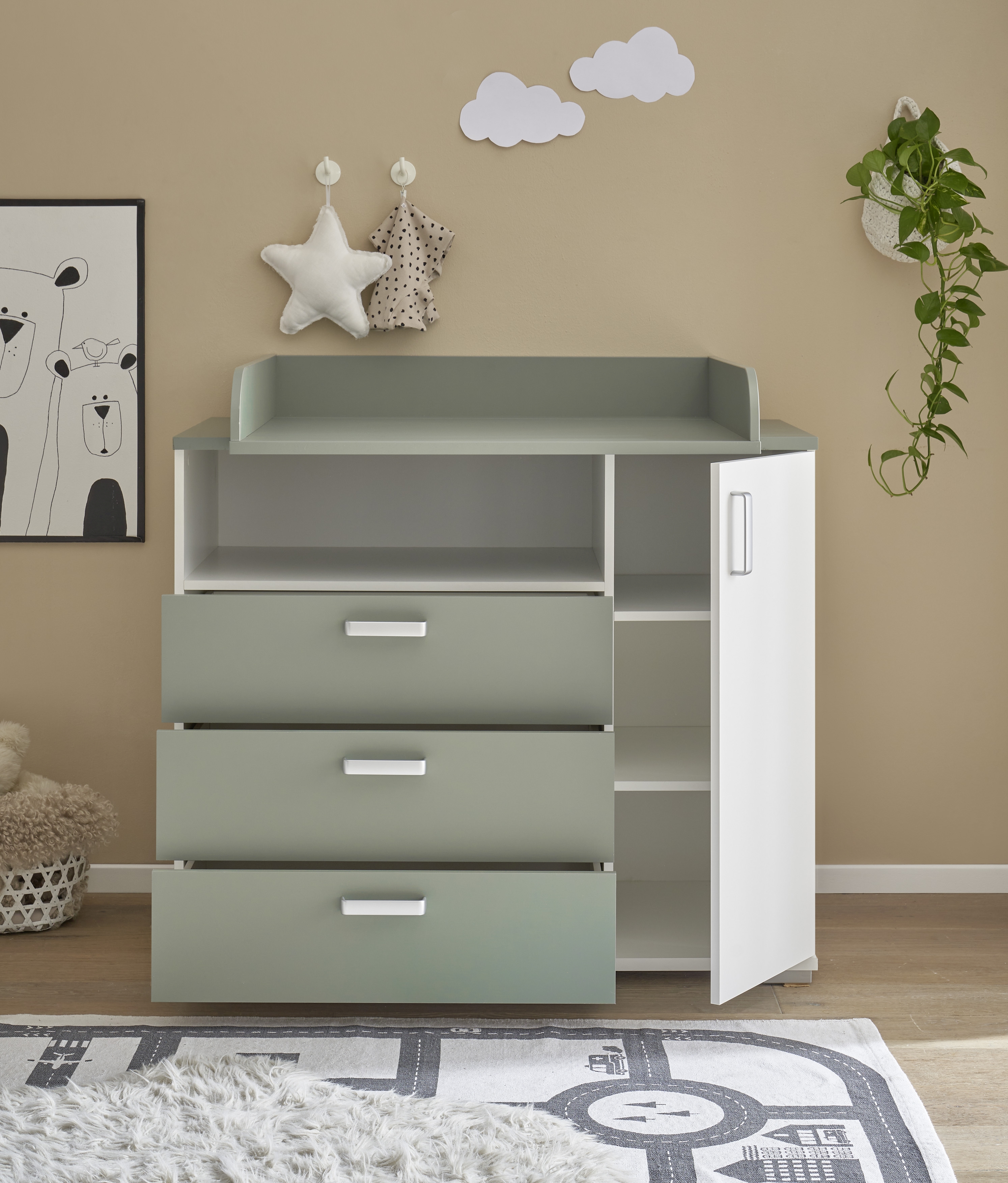 | Ausstattung Kommoden Phono Büro Regal: | Schublade(n), Türe(n), inkl. Wickelaufsatz | ||