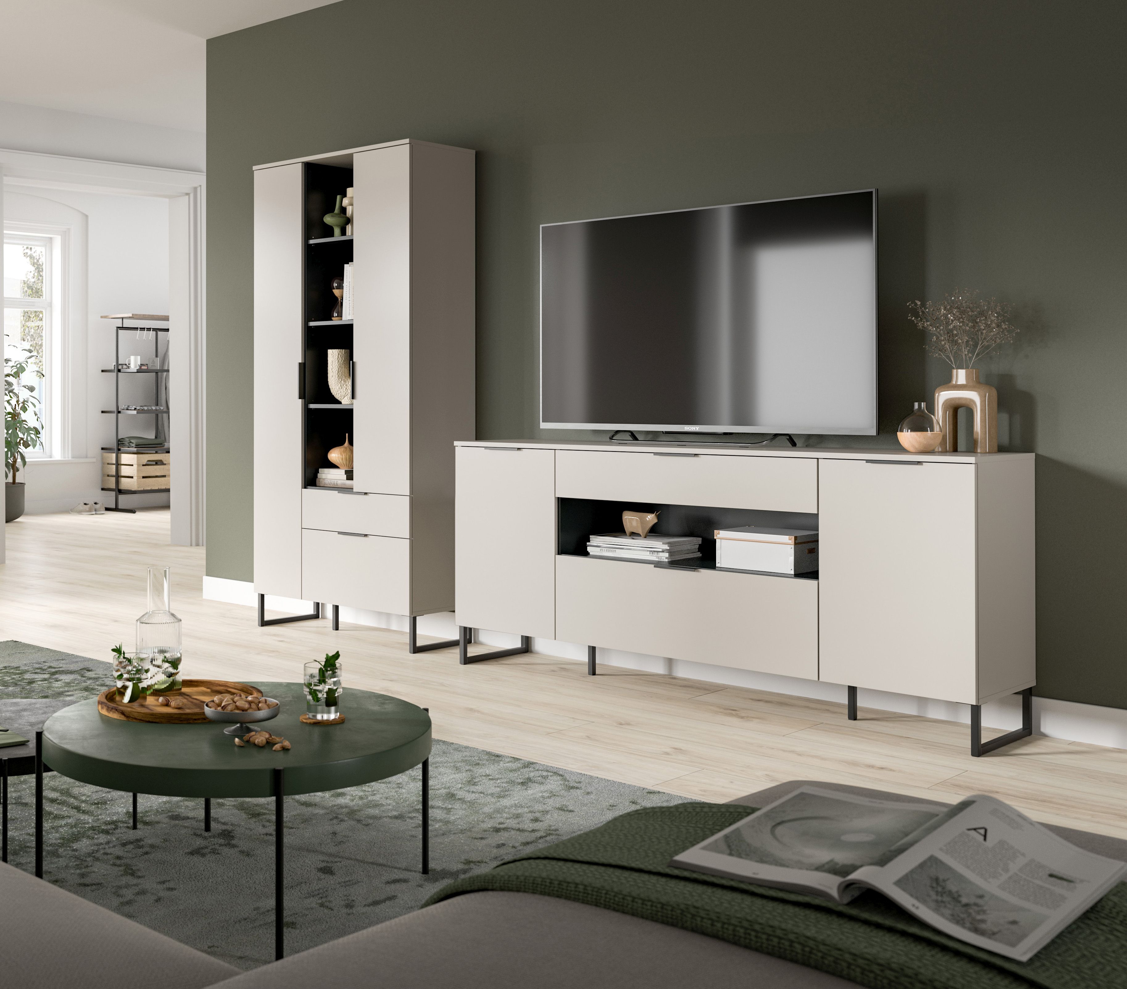 Die 2-teilige Wohnkombination in Kaschmir Nachbildung (240 x 192 x 41 cm) umfasst eine Stauraumtype und ein Sideboard. Die pflegeleichte Oberfläche in trendiger Farbausführung sorgt für eine moderne und elegante Optik. Diese Kombination bietet viel Stauraum zur Aufbewahrung und Organisation deiner Wohnaccessoires und ist ideal für eine ordentliche und stilvolle Gestaltung deines Wohnzimmers. Die hochwertigen Möbel sind robust und langlebig und lassen sich flexibel kombinieren. Mit dieser Wohnkombination schaffst du ein wohnliches und funktionales Zuhause.