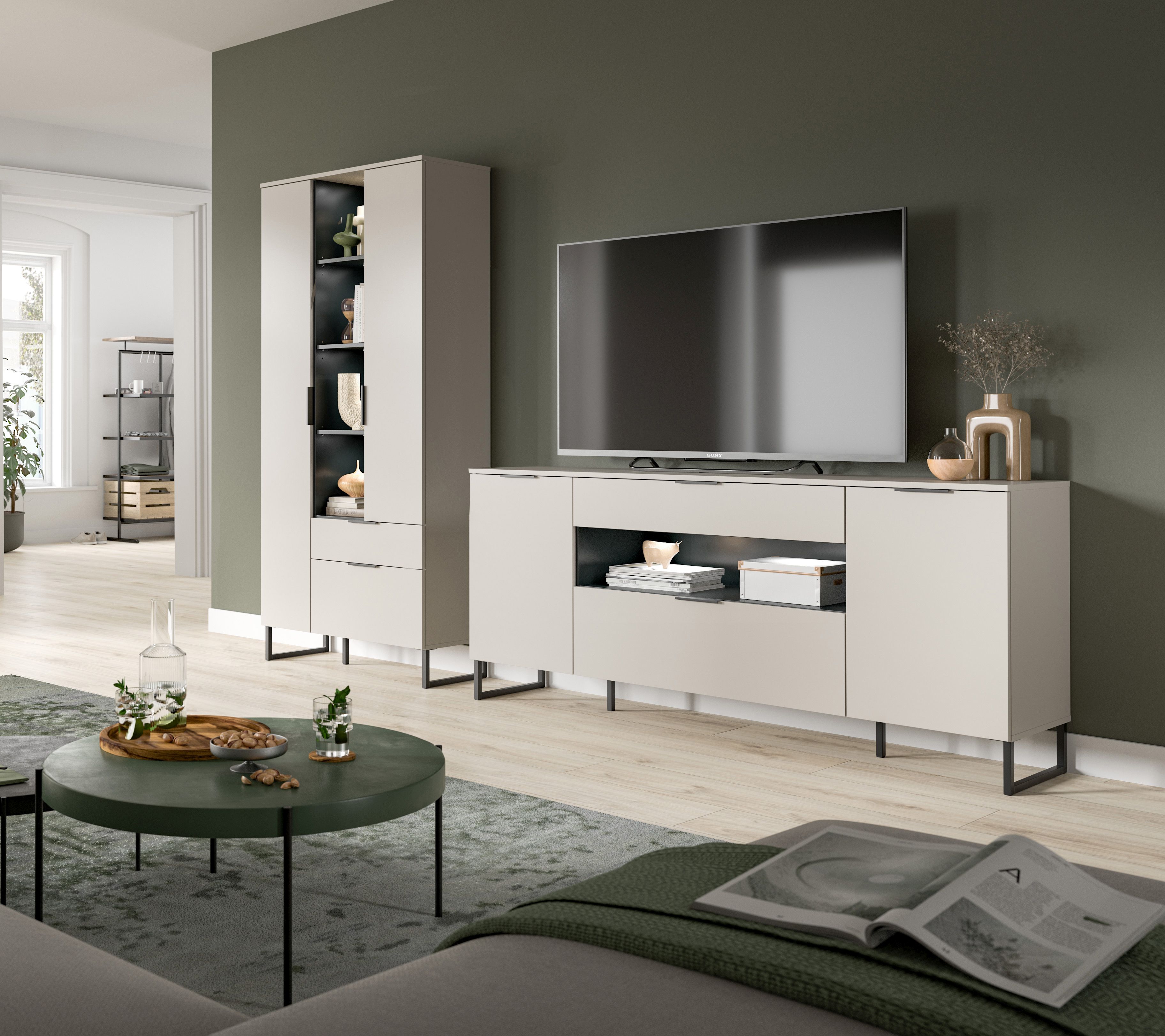 Die 4-teilige Wohnkombination mit Beleuchtung in Kaschmir Nachbildung (290 x 192 x 41 cm) umfasst eine Stauraumtype, ein Sideboard sowie ein 2er und ein 4er Set Unterbauspots. Die pflegeleichte Oberfläche in trendiger Farbausführung sorgt für eine elegante und moderne Optik. Die integrierte Beleuchtung setzt stilvolle Highlights und schafft eine angenehme Wohnatmosphäre. Diese Kombination bietet dir viel Stauraum zur Aufbewahrung und Organisation deiner Wohnaccessoires und Multimedia-Geräte. Die hochwertigen Möbel sind robust und langlebig. Mit dieser Wohnkombination schaffst du ein wohnliches und funktionales Ambiente, das Design und Komfort perfekt vereint.