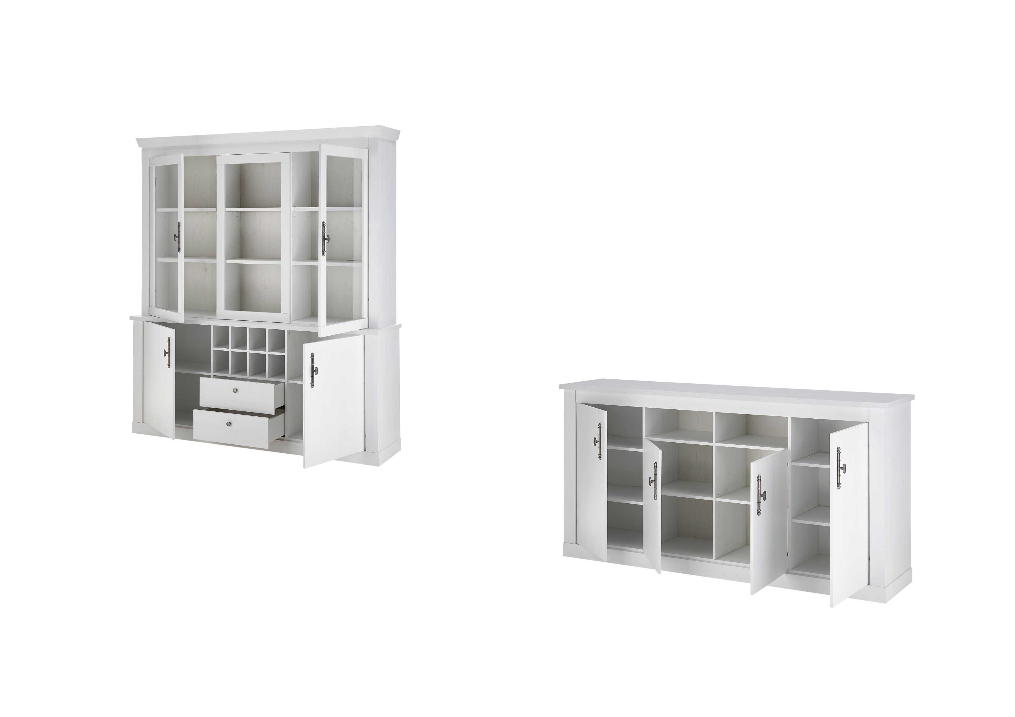 1 Buffet mit 2 Türen (dahinter je 1 Boden), mittig 2 Schubkästen und 1 Flascheneinteilung mit 8 Fächern, oben 1 Aufsatz mit 2 Glasrahmentüren, 4 Böden und 3 offenen Fächern