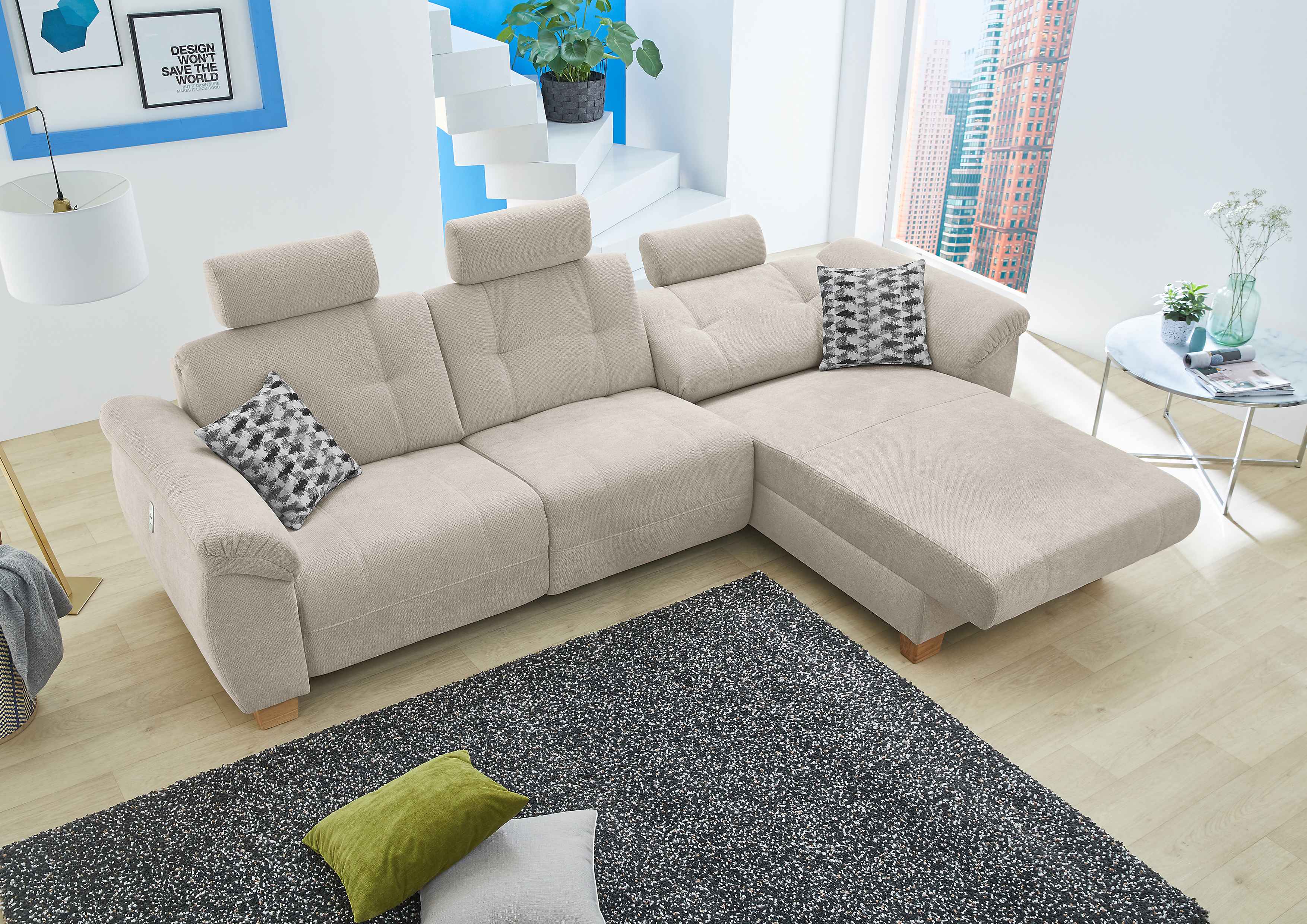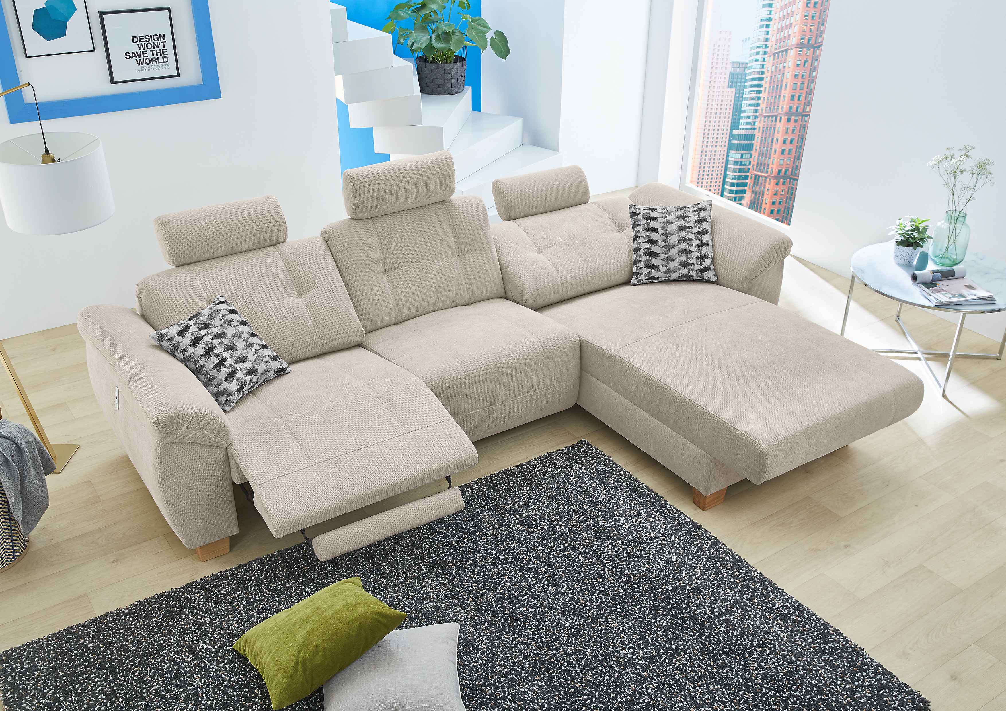 | Ausstattung Polster: | Kopfstützen, Ottomane rechts links wählbar, Rücken echt, USB Anschluss, inkl. Kissen | ||