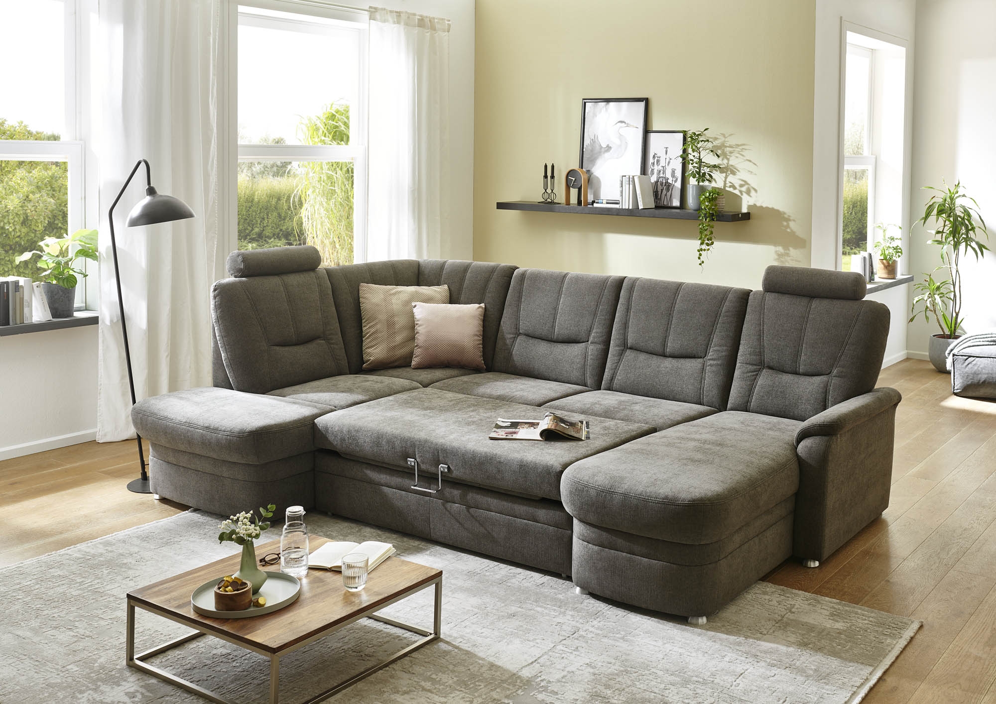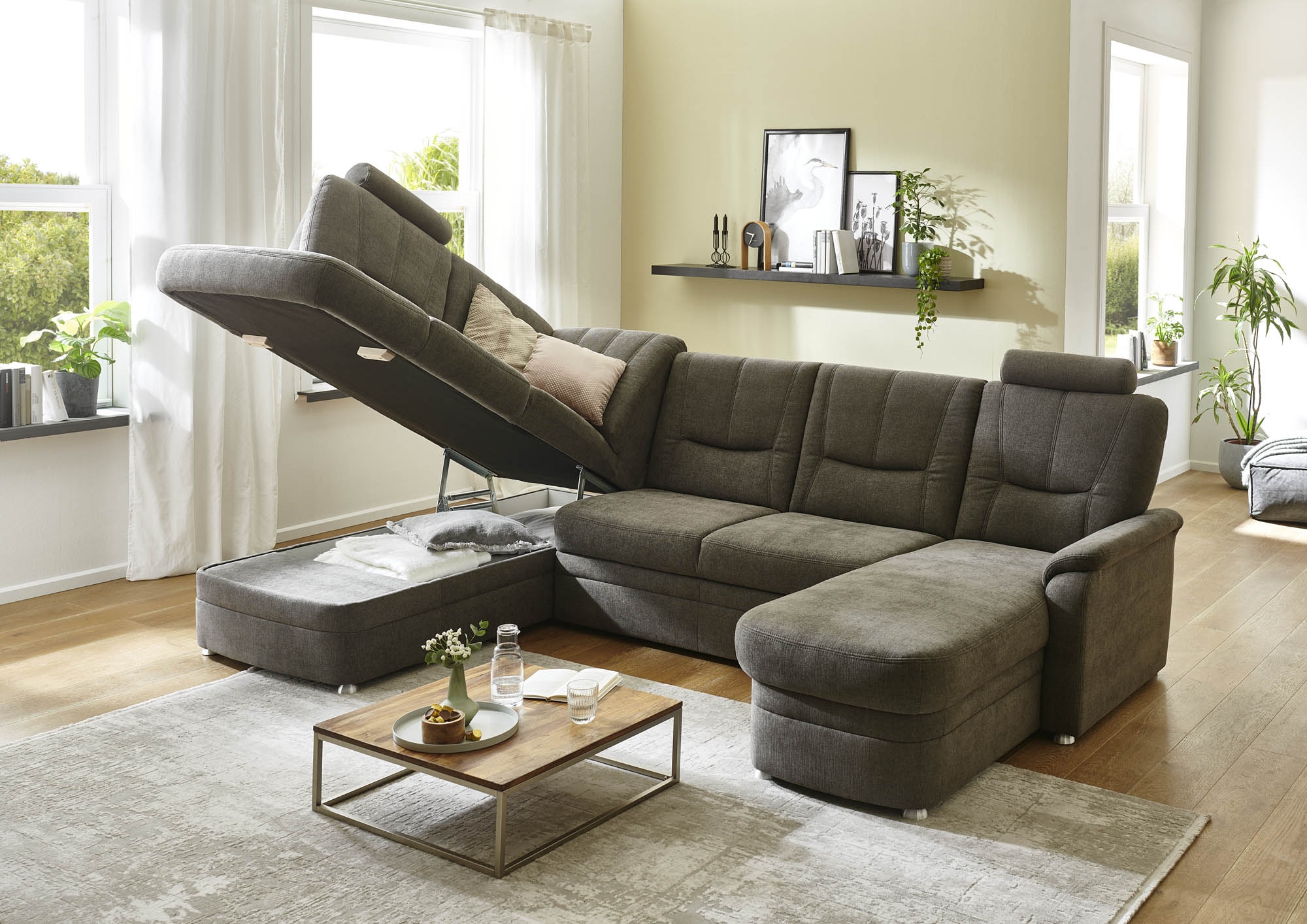 | Ausstattung Polster: | Ottomane rechts, Rücken echt, inkl. Bettkasten | ||