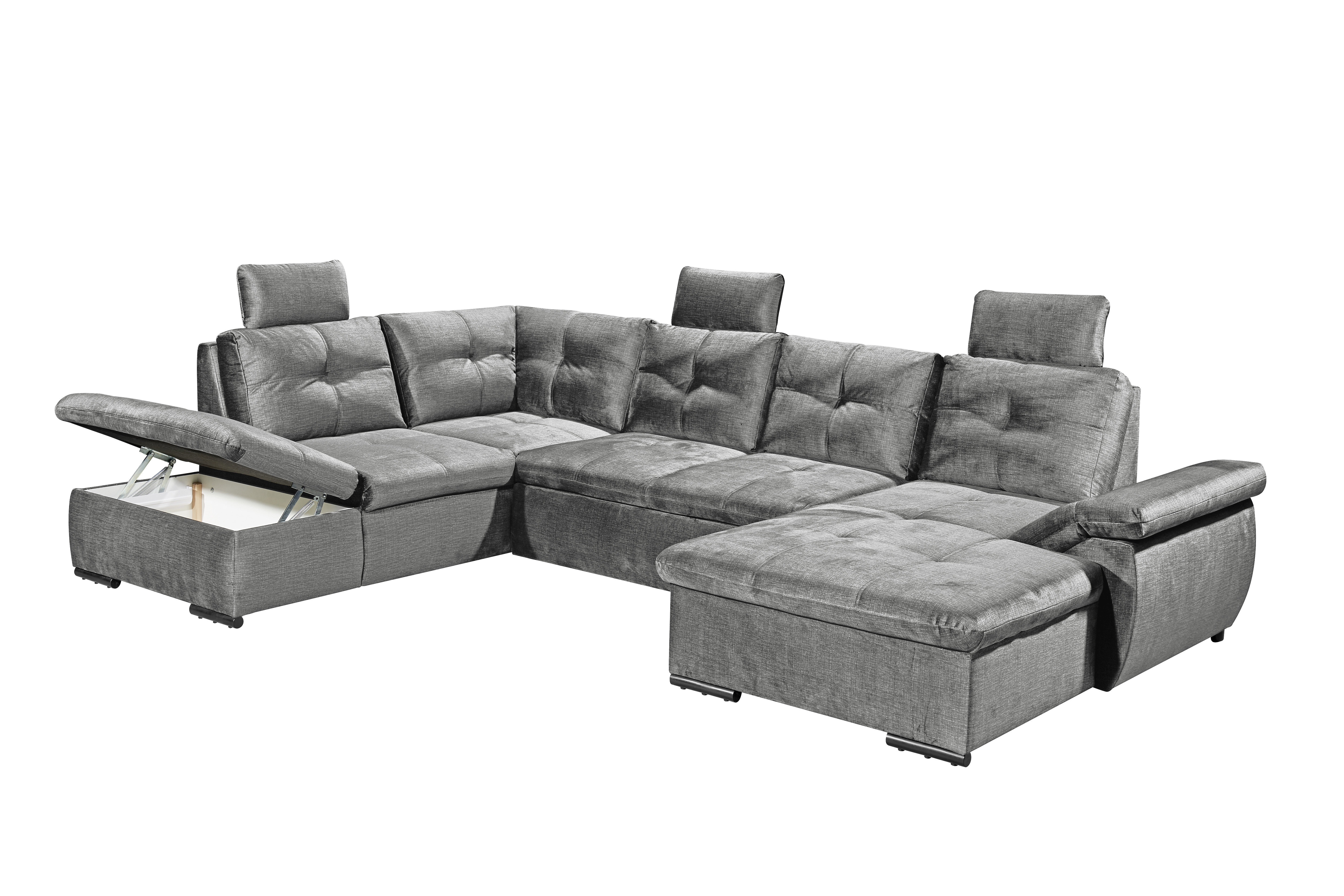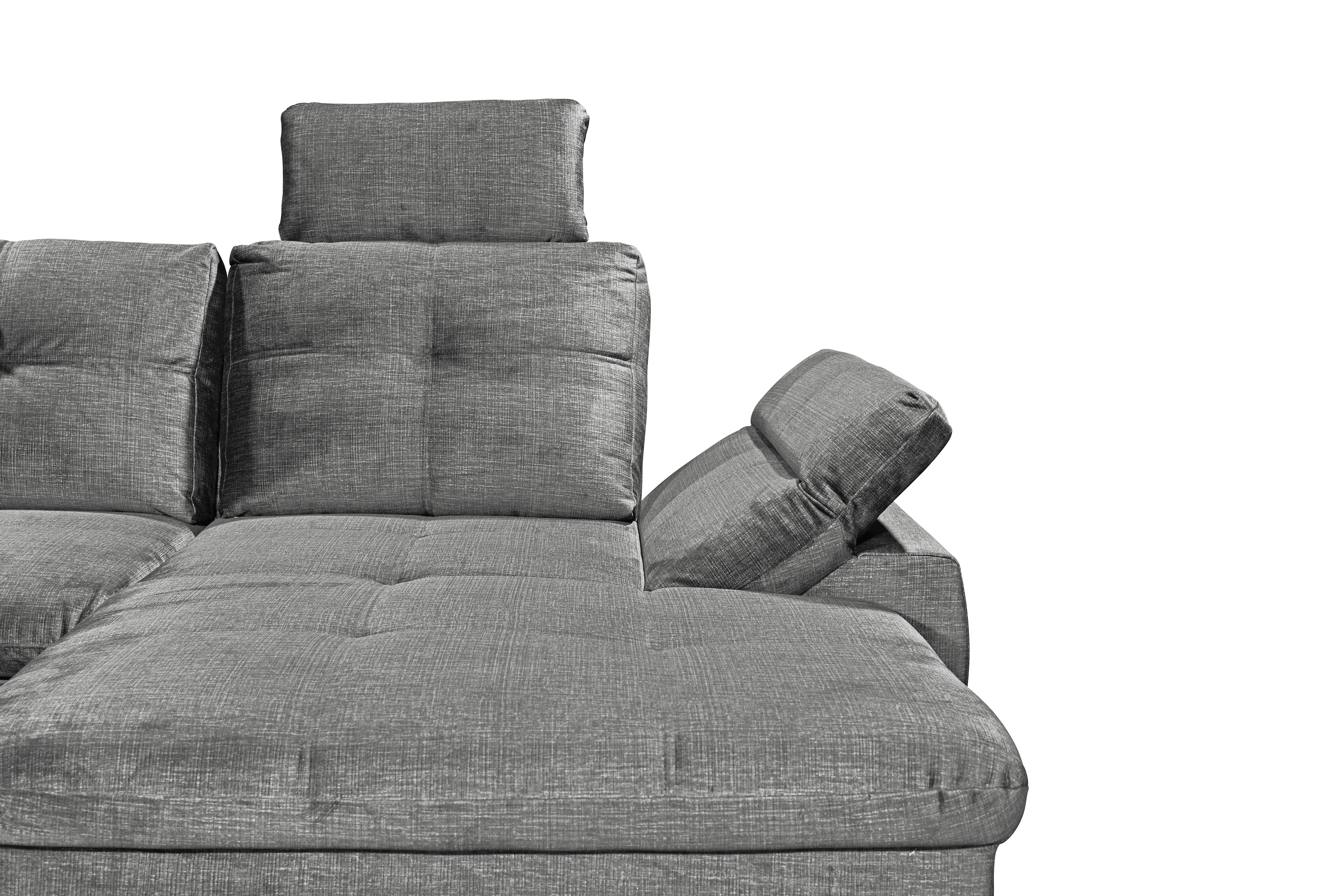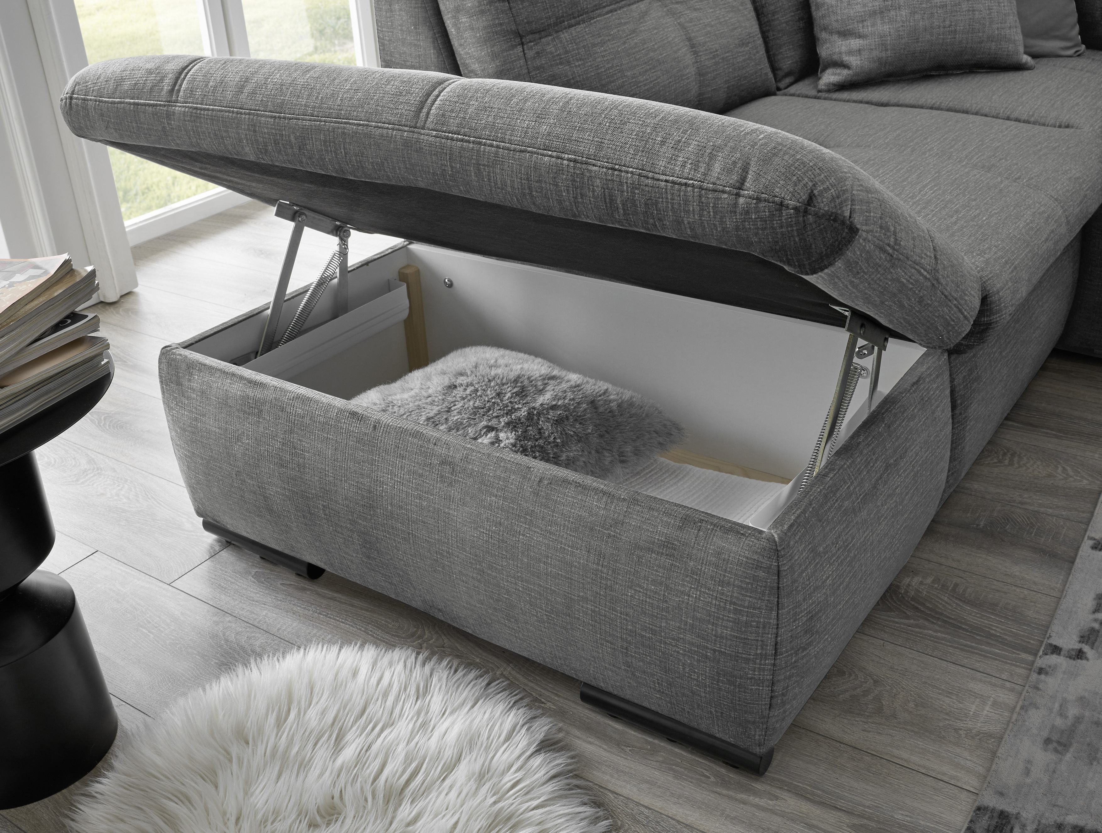 | Ausstattung Polster: | Kopfstützen, Ottomane links, Rücken echt, inkl. Bettkasten | ||