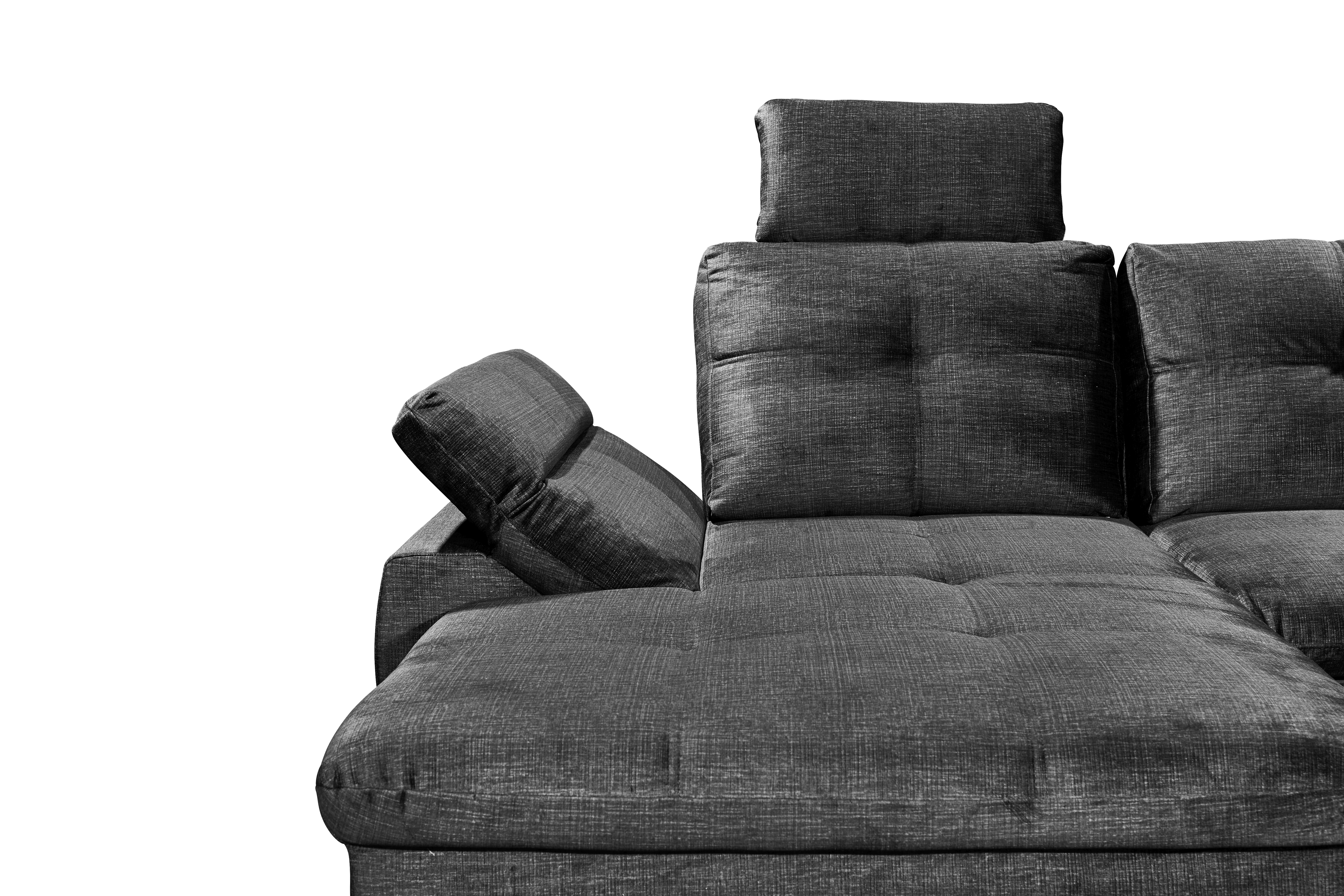 | Ausstattung Polster: | Kopfstützen, Ottomane rechts, Rücken echt, inkl. Bettkasten | ||