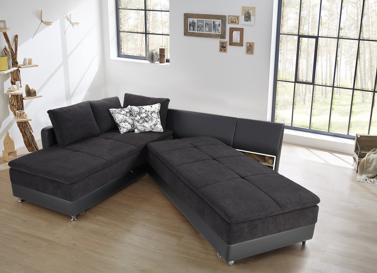 Bezug: Korpus in einem Kunstleder in der Farbe schwarz aus 100% Polyurethan; Sitz und große Kissen in einer Microfaser in schwarz aus 100% Polyester; Kleine Kissen in einem schwarz/grau gemusterten Flachgewebe aus 50% Polyester, 33% Acryl und 17% Viscose