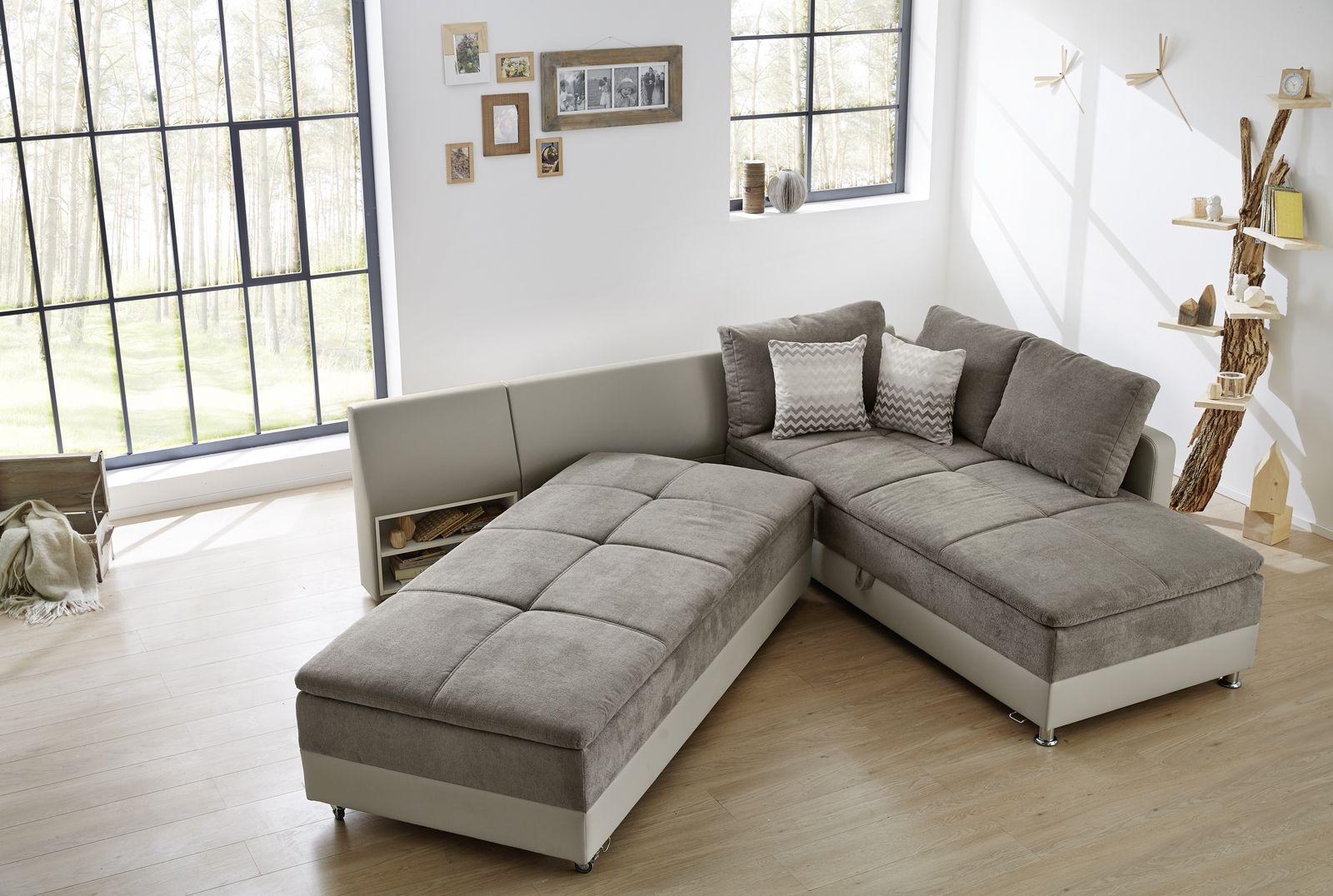 Top aktuelle Wohnlandschaft mit hochwertiger Polsterung im Boxspringverfahren. Diese Polstergruppe ist durch ihre Polsterung mit Wellenunterfederung und 7-Zonen-Tonnentaschenfederkern in beiden Liegeflächen als Dauerschläfer geeignet und sorgt für einen perfekten Sitz- und Schlafkomfort, unterstützt durch den integrierten Kaltschaum-Topper. Durch Eindrehen des Ottomanen entsteht eine große Liegefläche. Eine praktische Nachtkonsole mit zwei Fächern ist in der Rückenlehne integriert.
