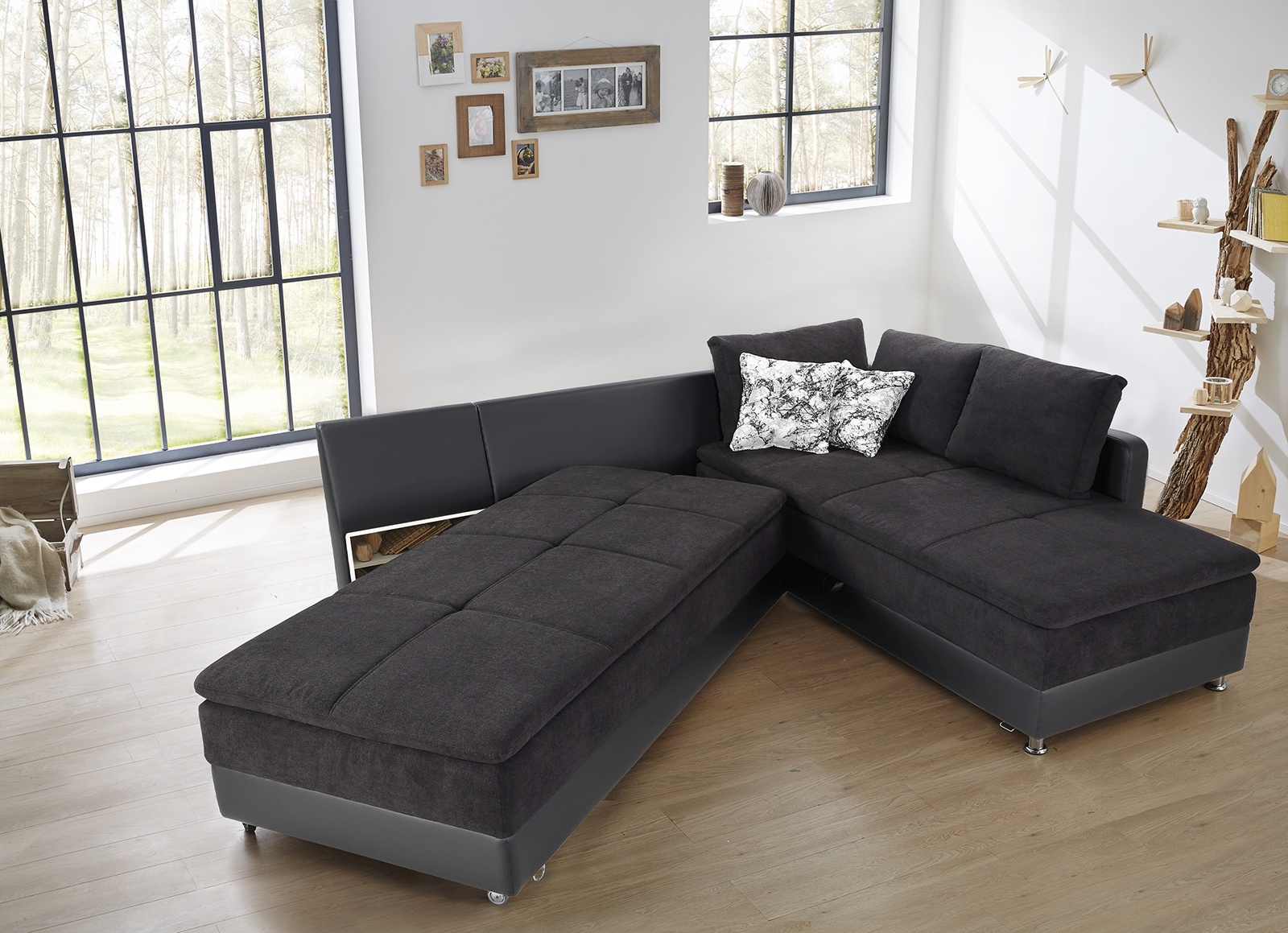 Bezug: Korpus in einem Kunstleder in der Farbe schwarz aus 100% Polyurethan; Sitz und große Kissen in einer Microfaser in schwarz aus 100% Polyester; Kleine Kissen in einem schwarz/grau gemusterten Flachgewebe aus 50% Polyester, 33% Acryl und 17% Viscose