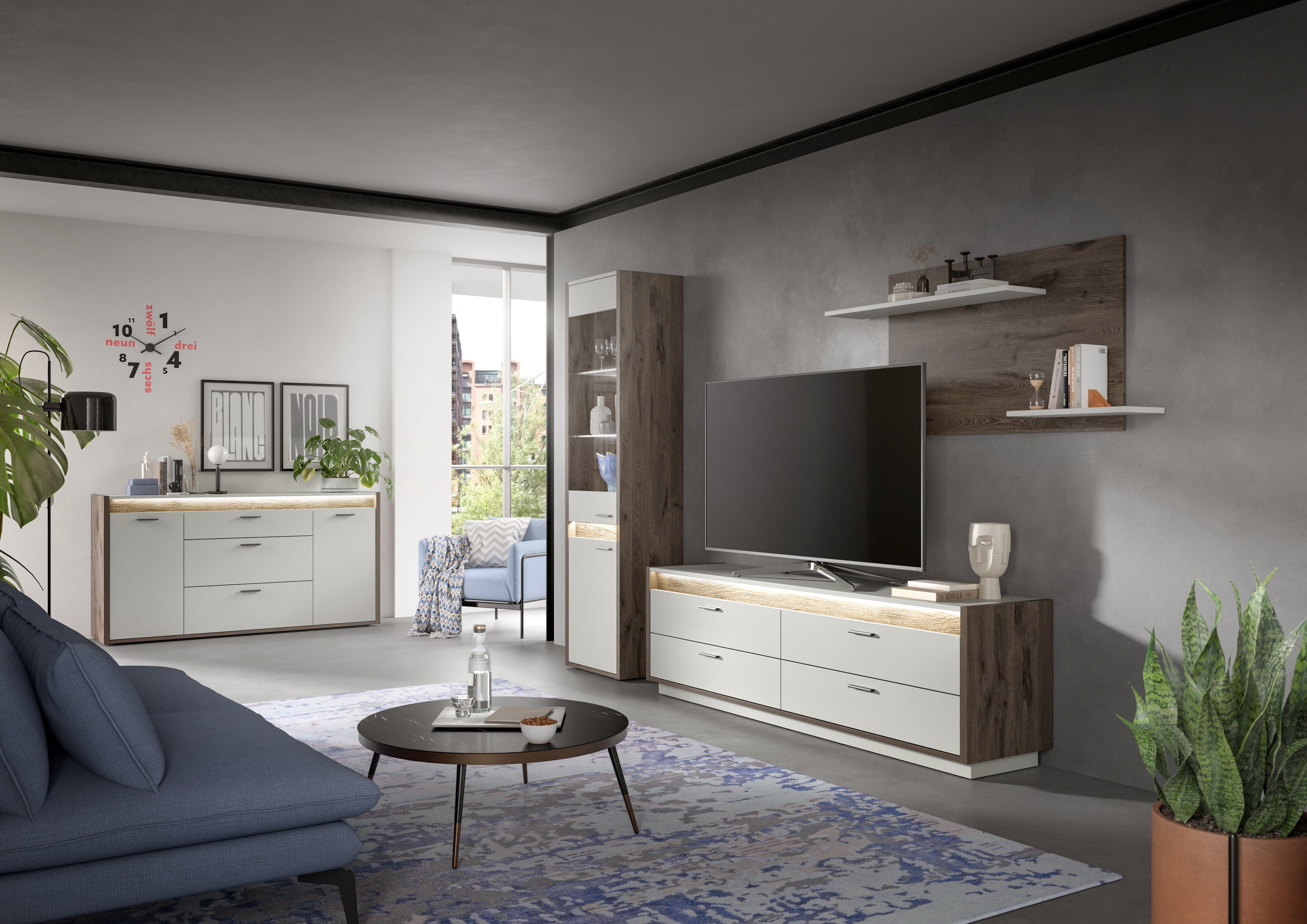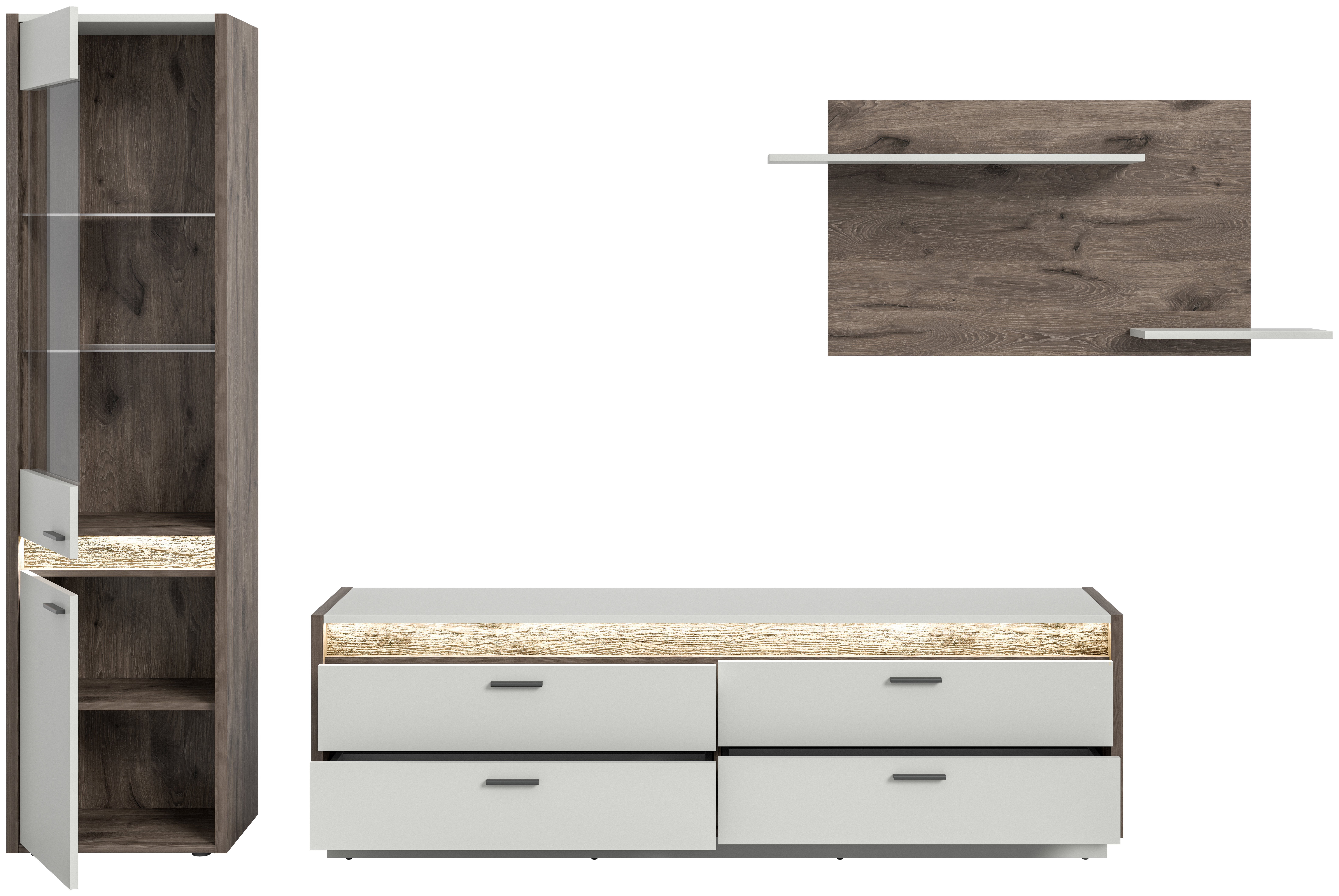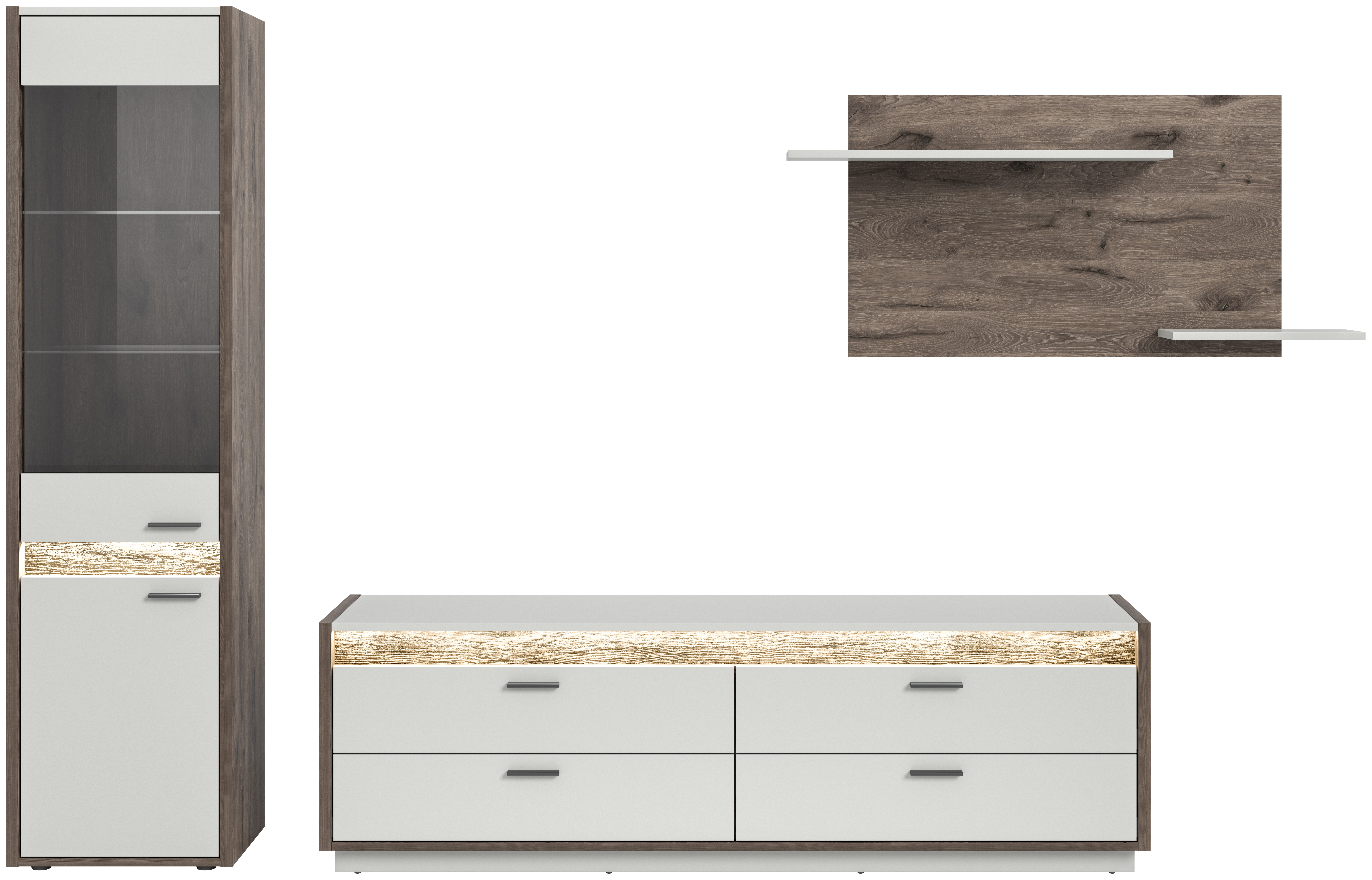 Entdecken Sie die vielseitige Wohnkombination in Nox Oak dunkel Nachbildung und hellgrau Nachbildung - eine intelligente Fusion aus Stil und Funktionalität für Ihr Zuhause. Mit ihrer einzigartigen dimmbaren Frontbeleuchtung schafft sie nicht nur eine einladende Atmosphäre, sondern bietet auch großzügigen Stauraum für Ihre persönlichen Gegenstände. Verleihen Sie Ihrem Wohnraum mit dieser eleganten Wohnkombination einen modernen Touch und genießen Sie eine harmonische Verbindung von Ästhetik und Praktikabilität.