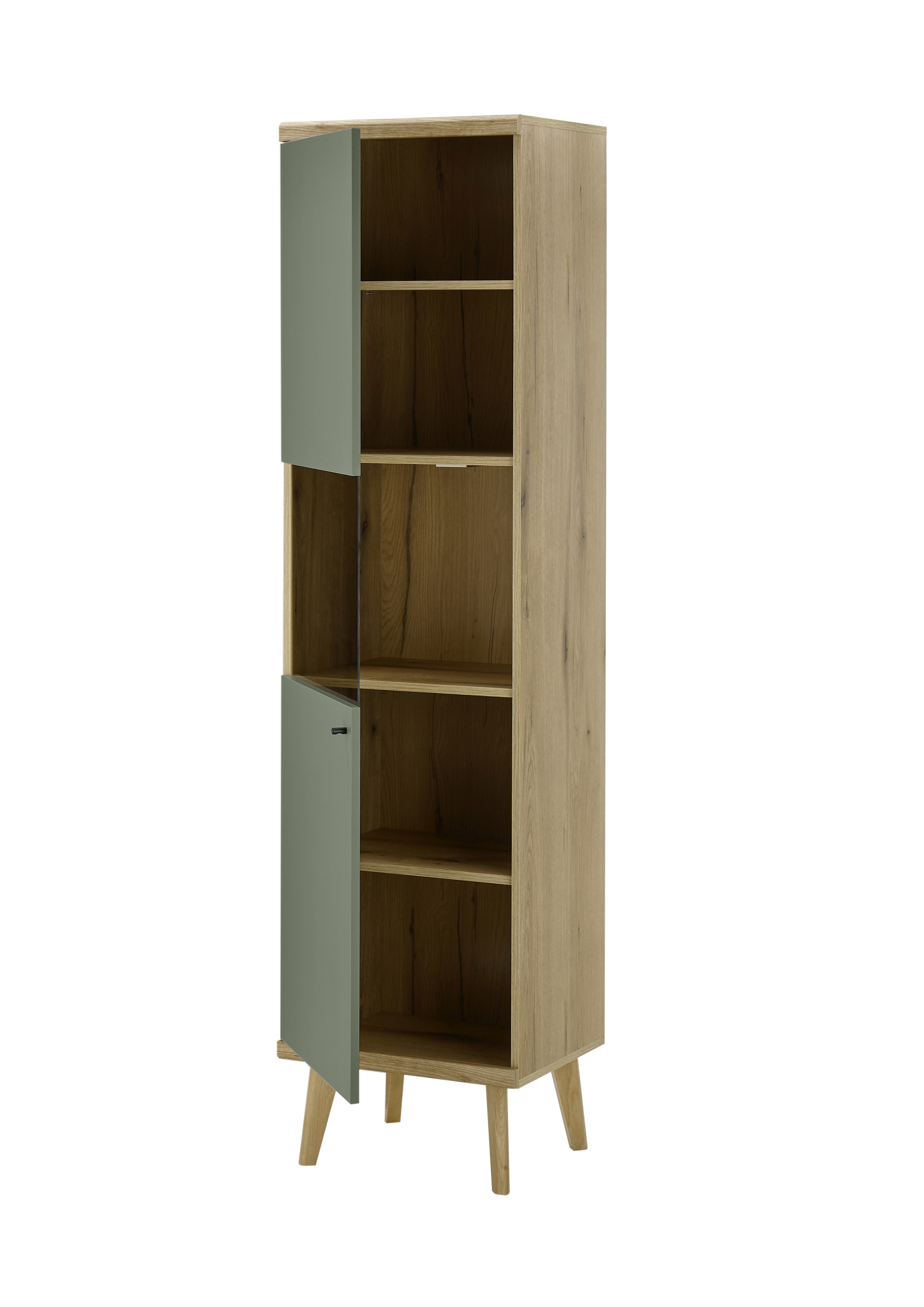 1 Highboardvitrine mit 2 Türen; links hinter der Tür 1 Glas- und 2 Konstruktionsböden, rechts 2 Einlegenböden