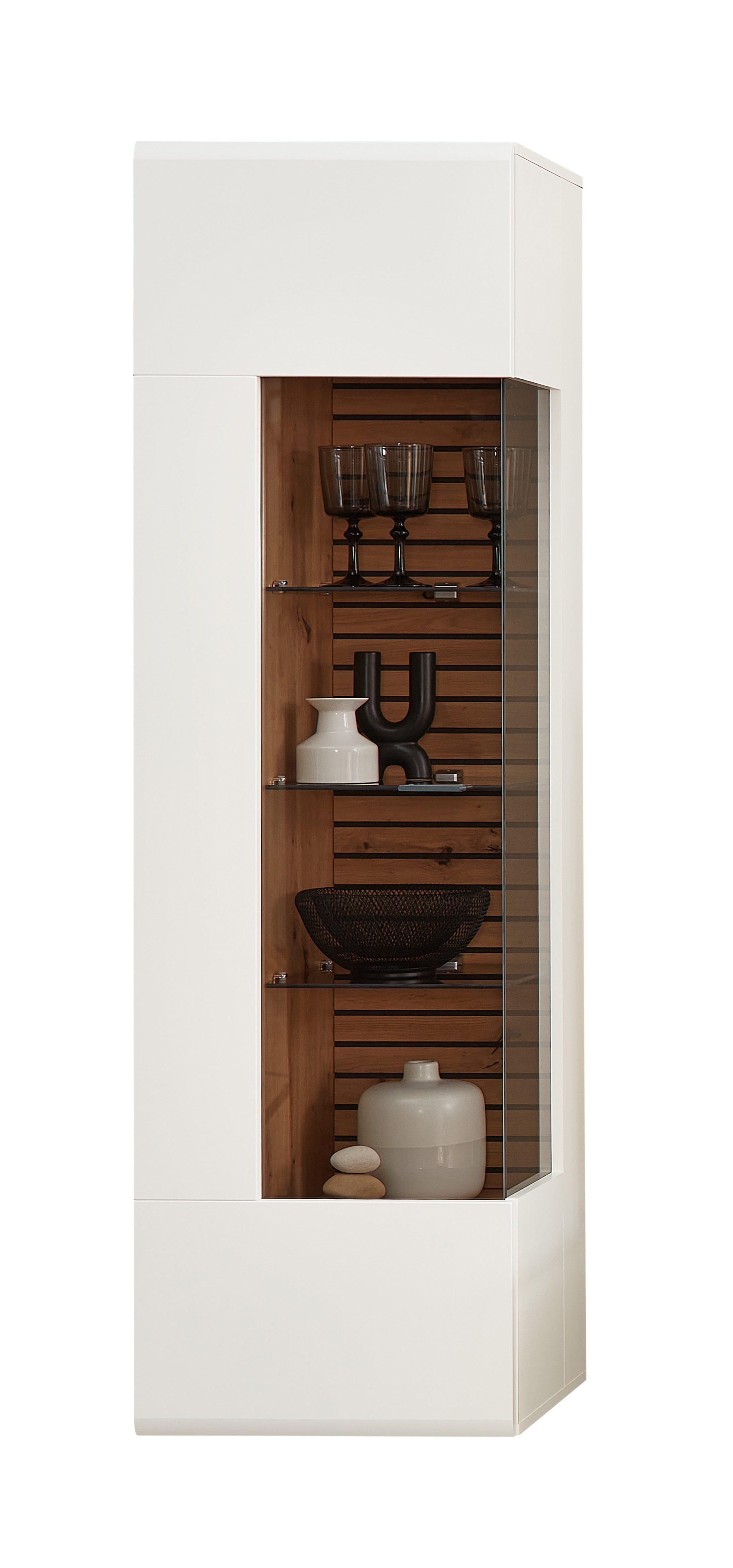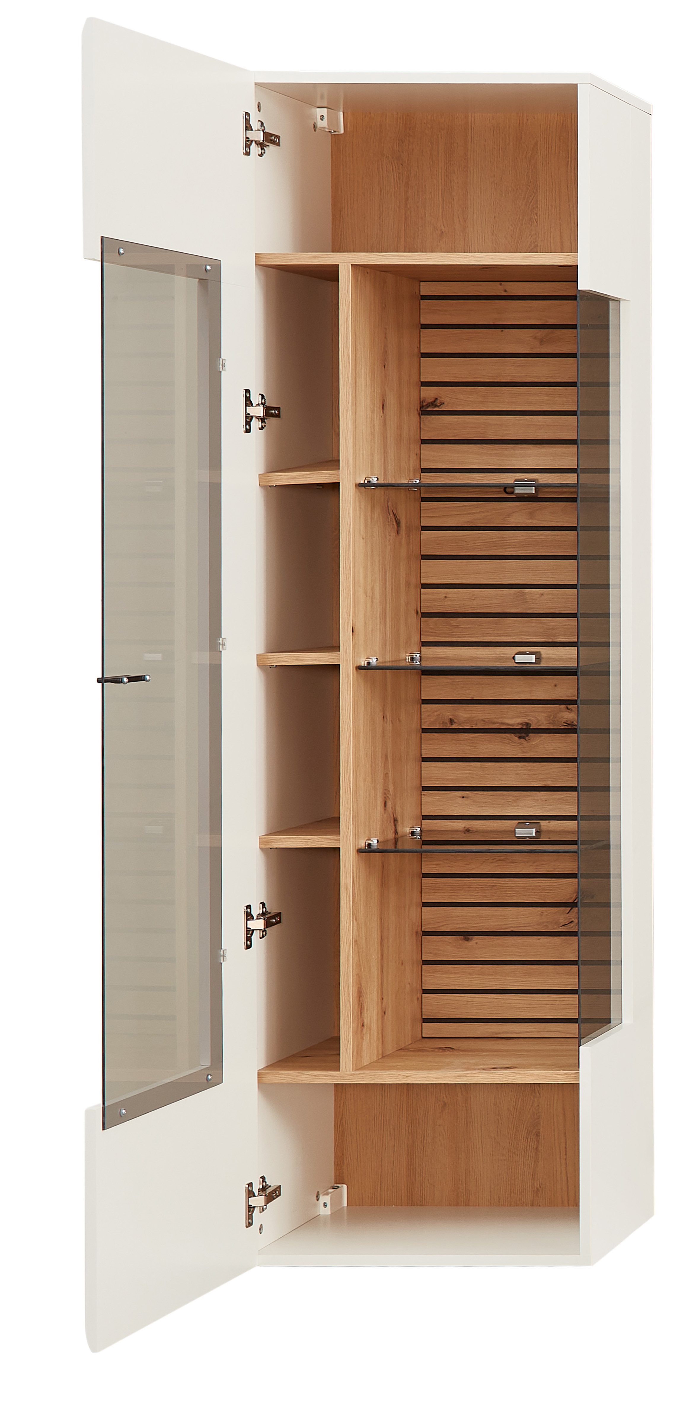 1 Hängevitrine mit 1 Tür mit Glaseinsatz, 2 Konstruktionsböden, 3 Böden und 3 Glasböden