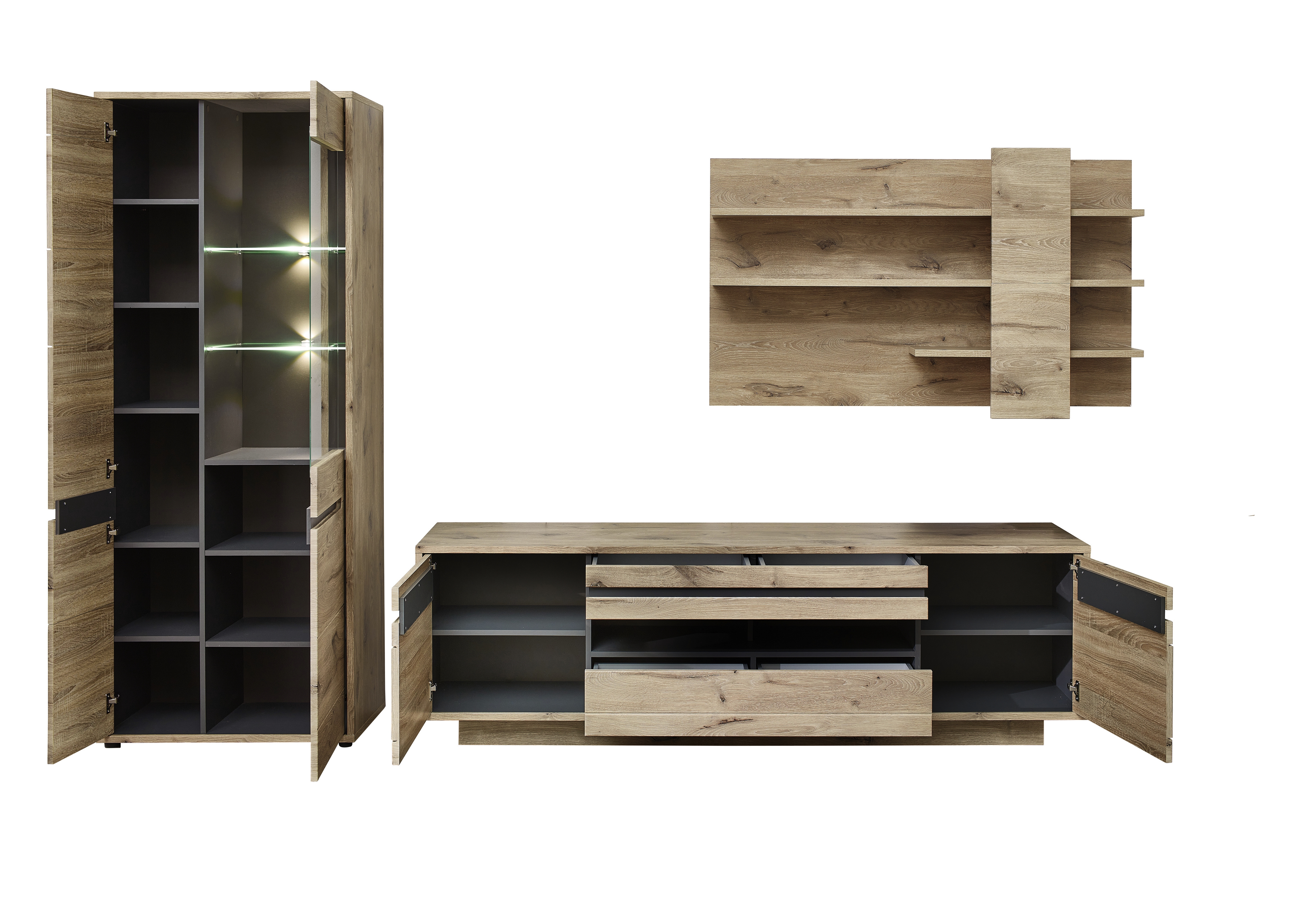 | Ausstattung Anbauwände: | Schublade(n), inkl. Beleuchtung, offene Fächer | ||
