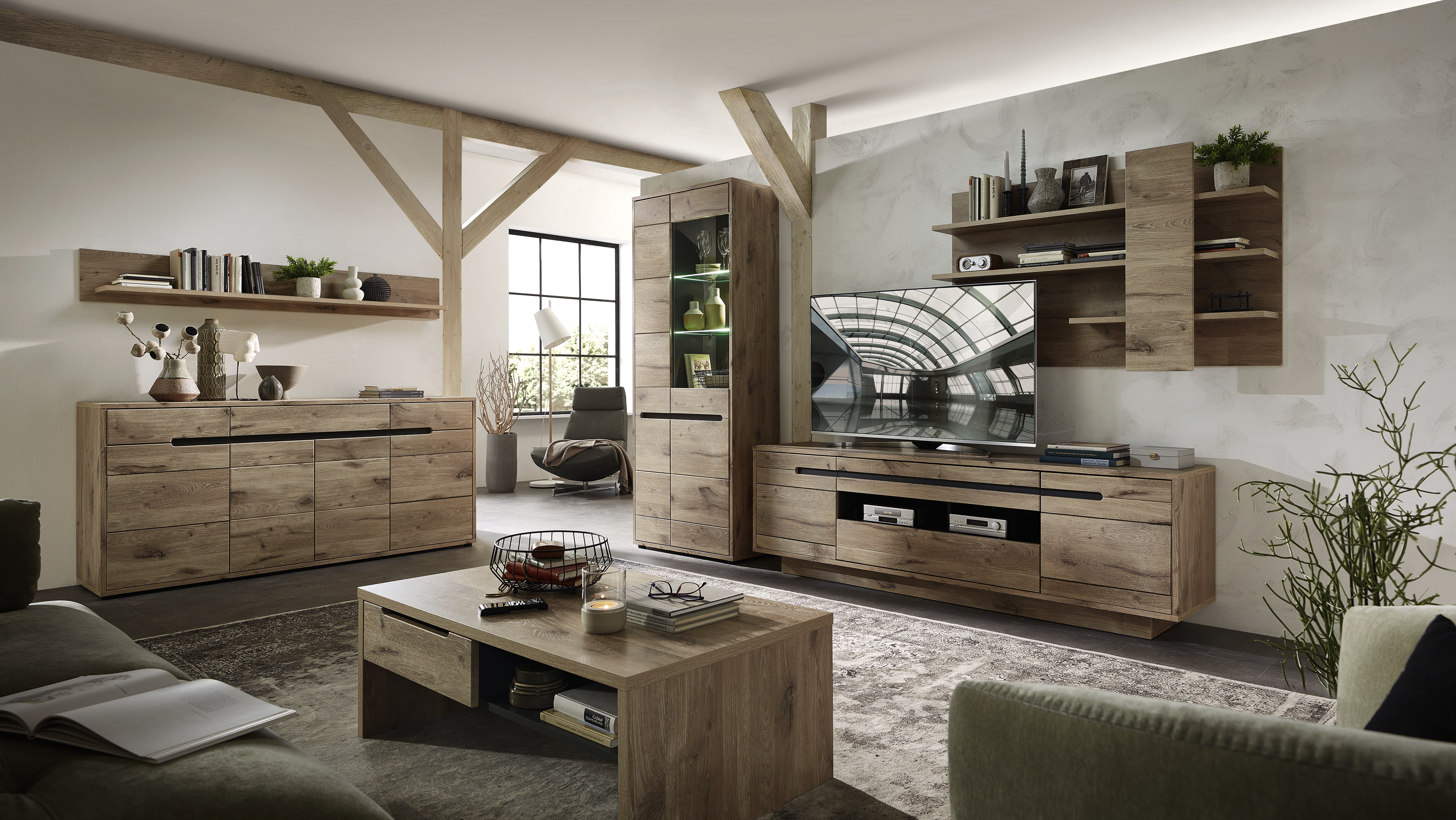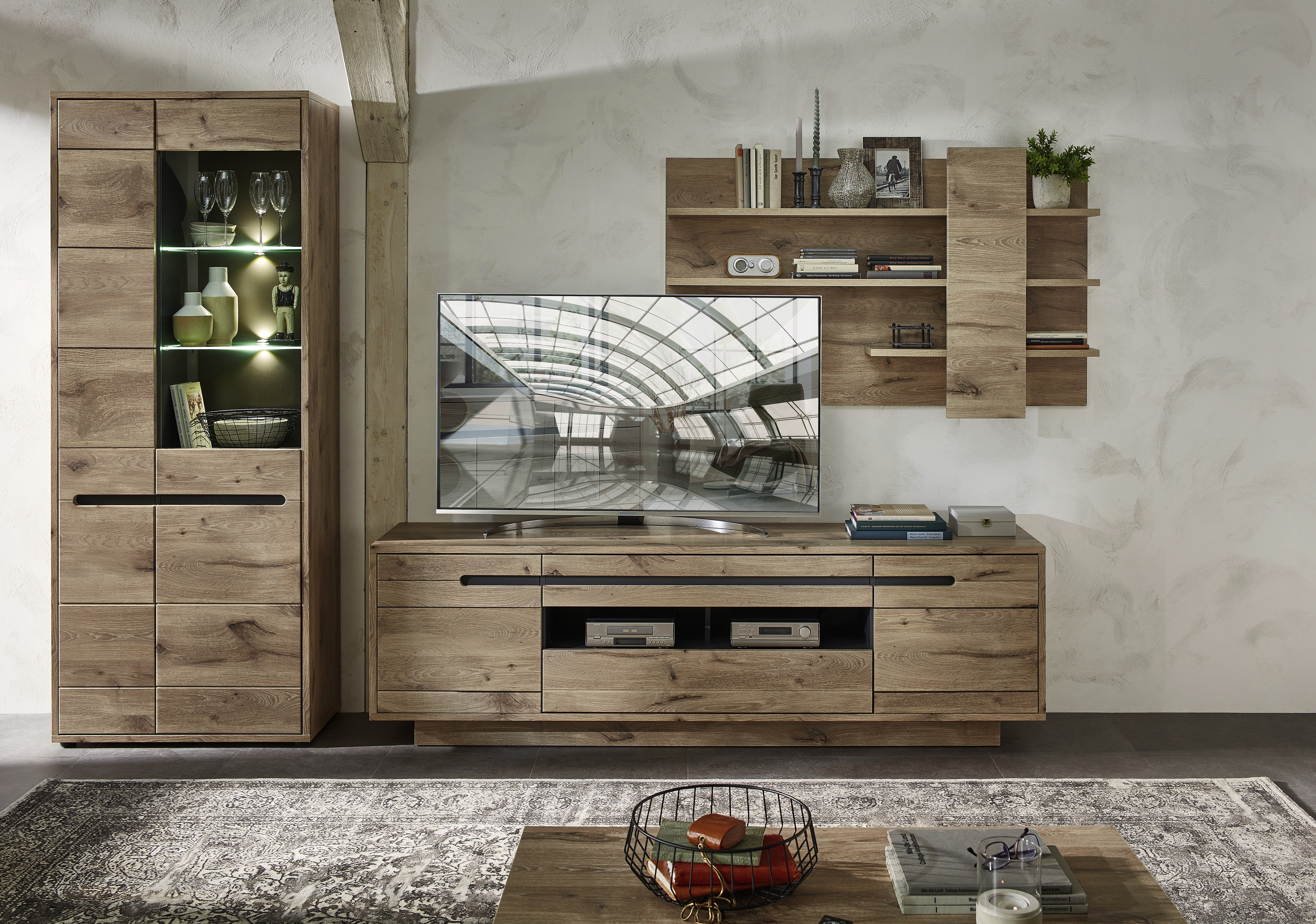1 TV-Unterteil mit 2 Schubkästen mit Doppelzarge, 2 Holztüren und 2 offenen Fächern