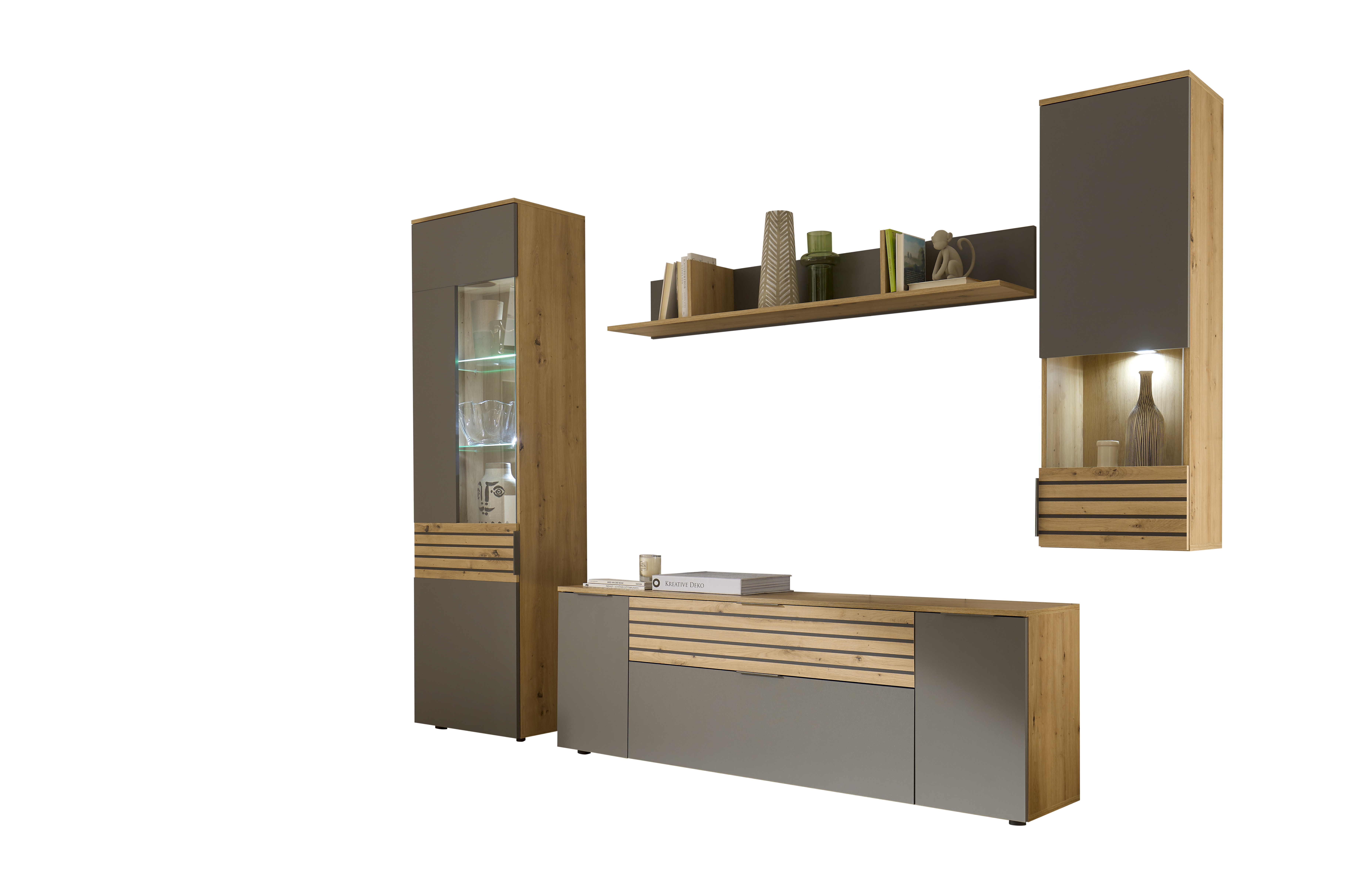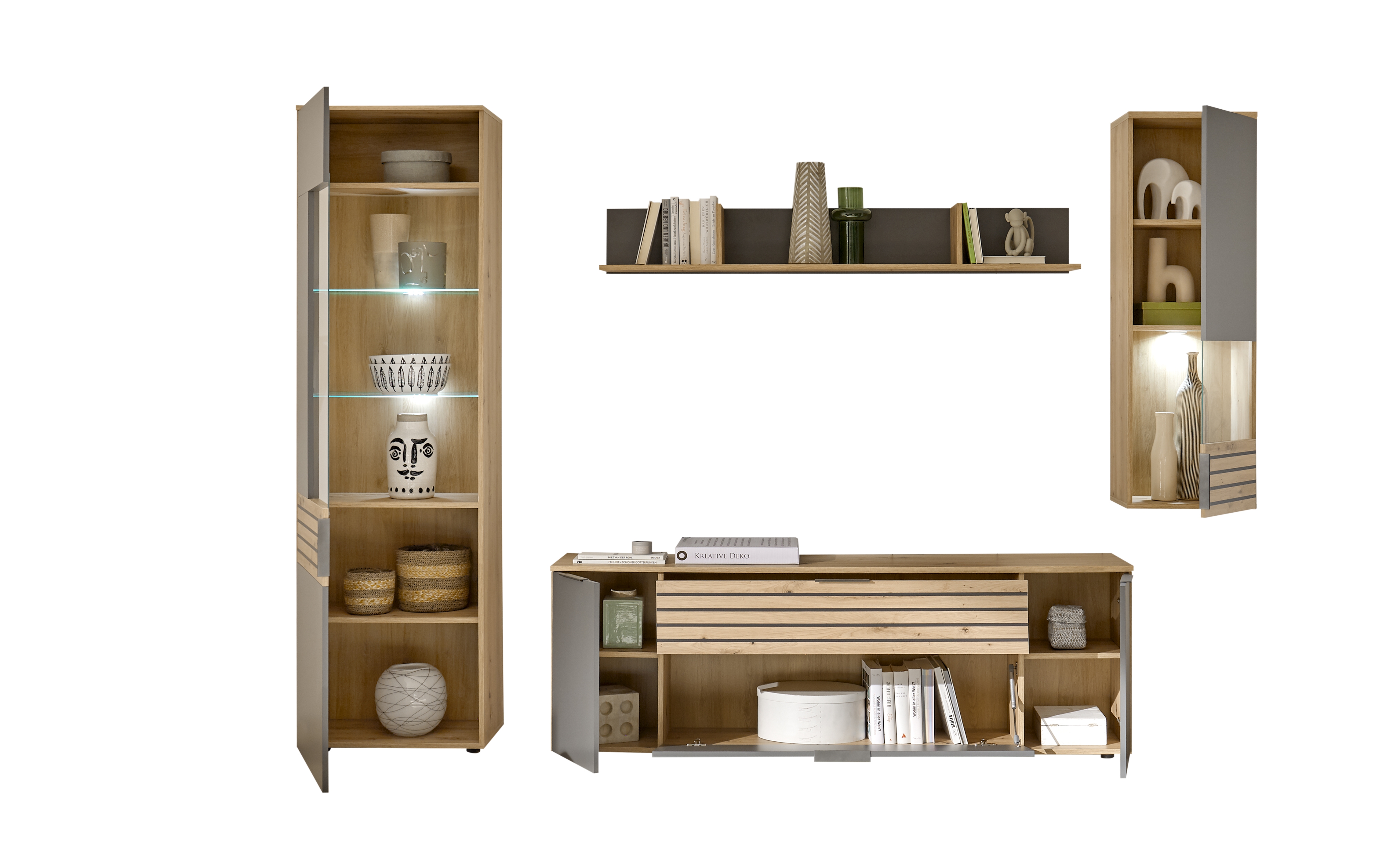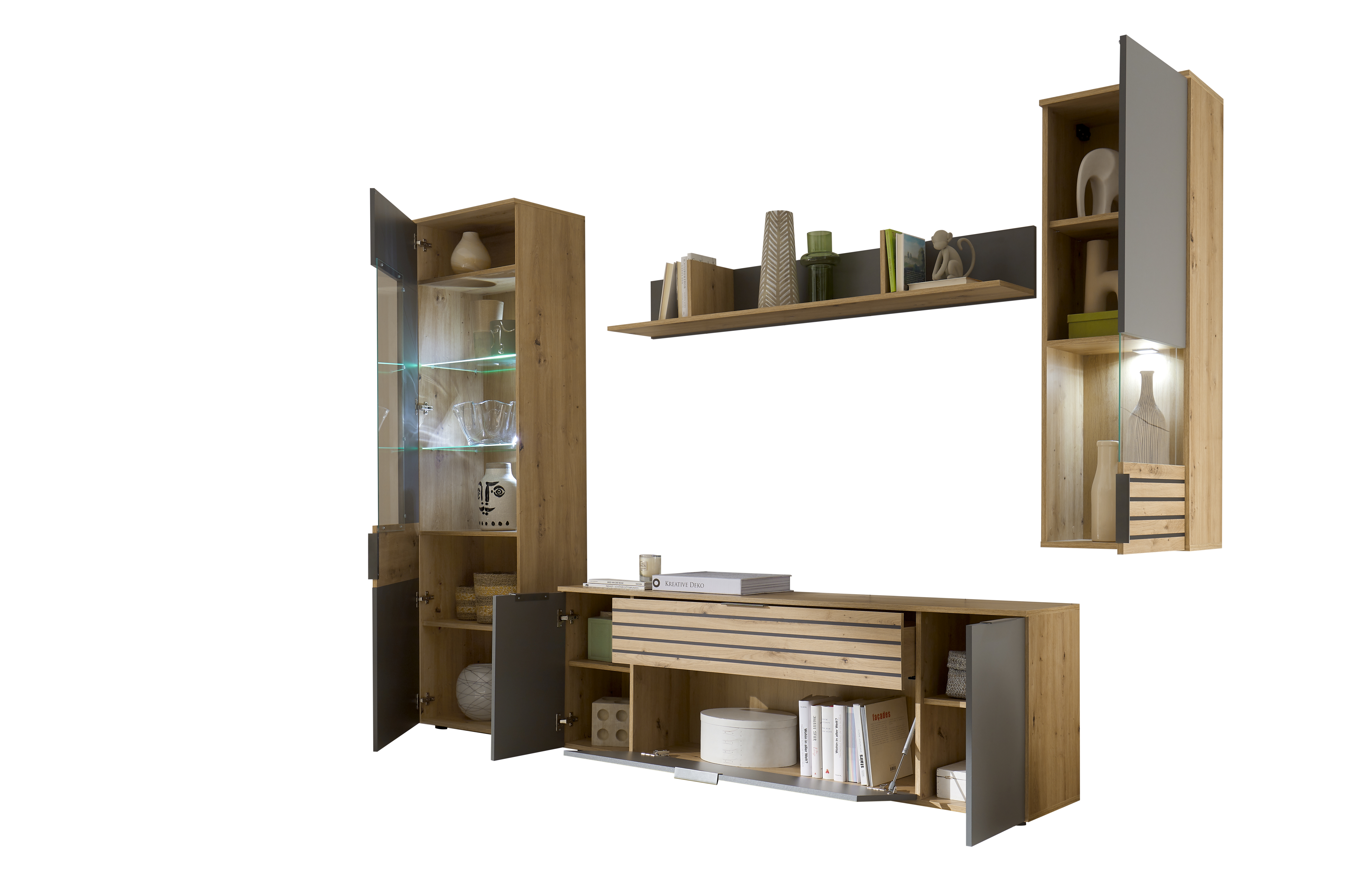- Viel Stauraum: Mit der Vitrine, dem Wandboard, dem Lowboard und der Hängevitrine bietet das Set eine Vielzahl an Ablageflächen und Aufbewahrungsmöglichkeiten