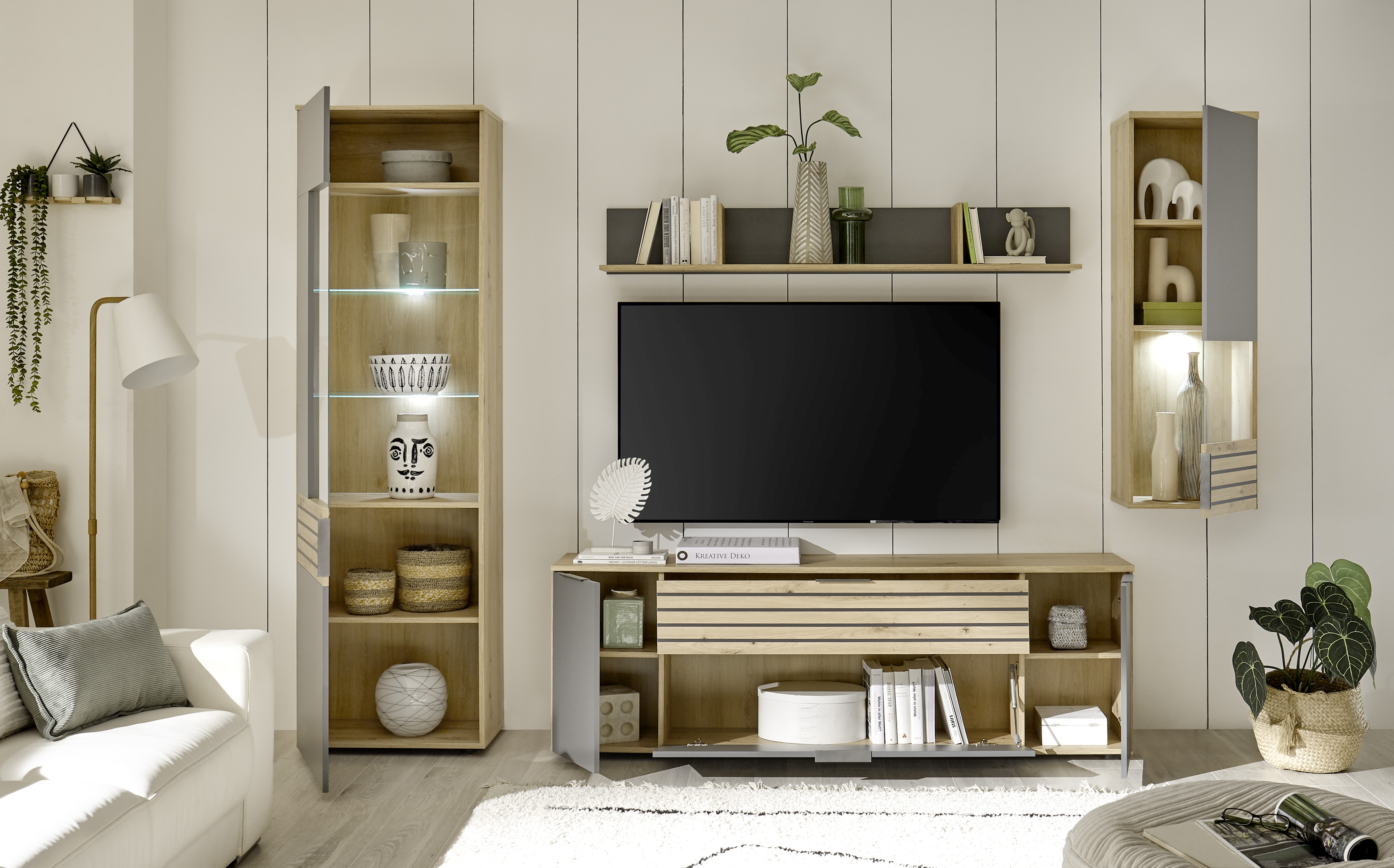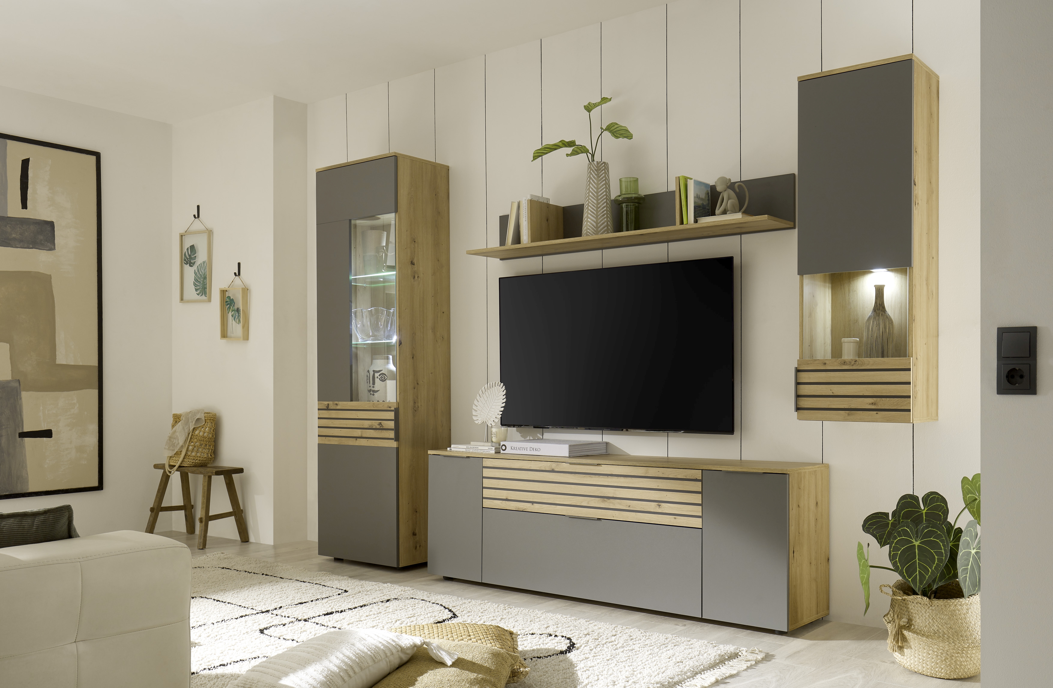 Diese stilvolle und moderne Wohnwand setzt einen eleganten Akzent in Ihrem Wohnzimmer. Die Kombination aus Artisan Eiche Holznachbildung und grauen Akzenten verleiht dem Set einen ansprechenden, natürlichen Charme, während die klaren Linien und die hochwertige Verarbeitung für eine zeitgemäße Optik sorgen.