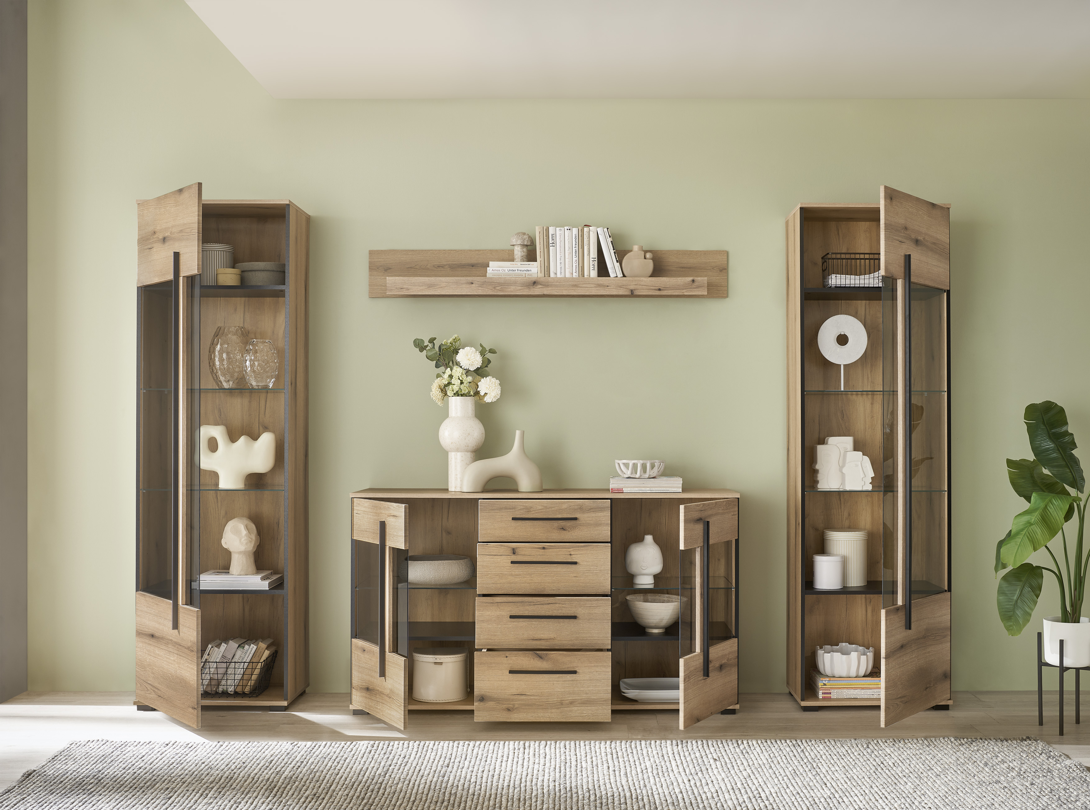 1 Sideboard mit 2 Türen, 2 Glasböden, 2 Konstruktionsböden und 4 Schubkästen