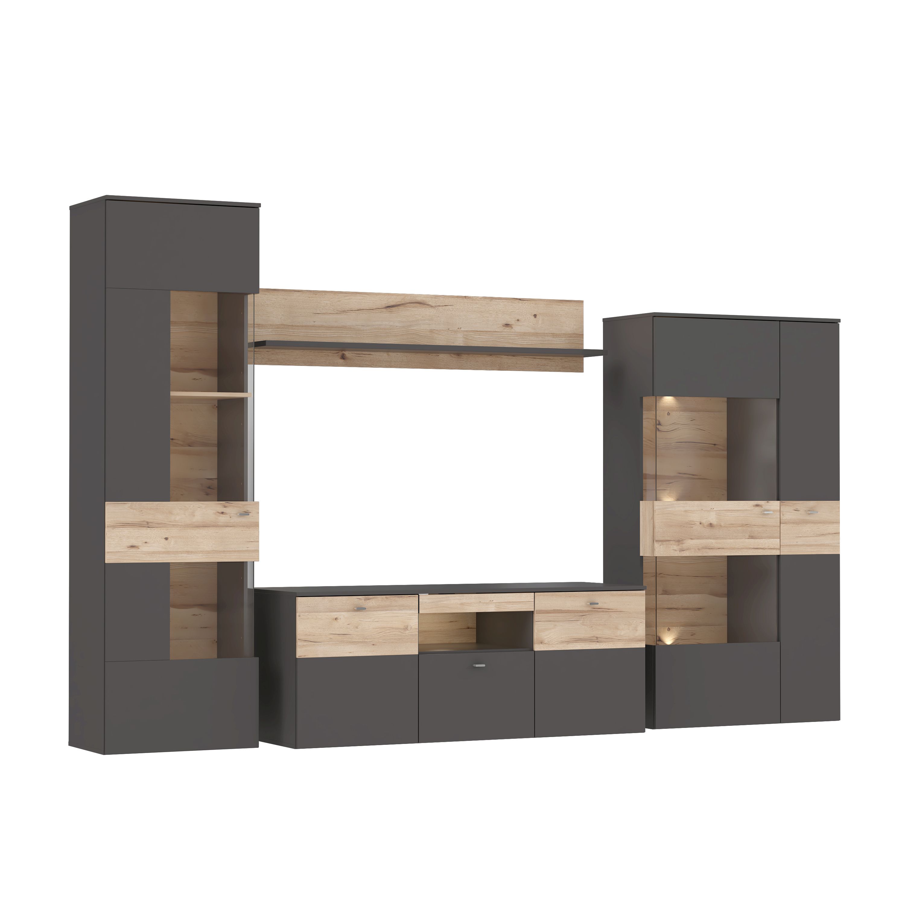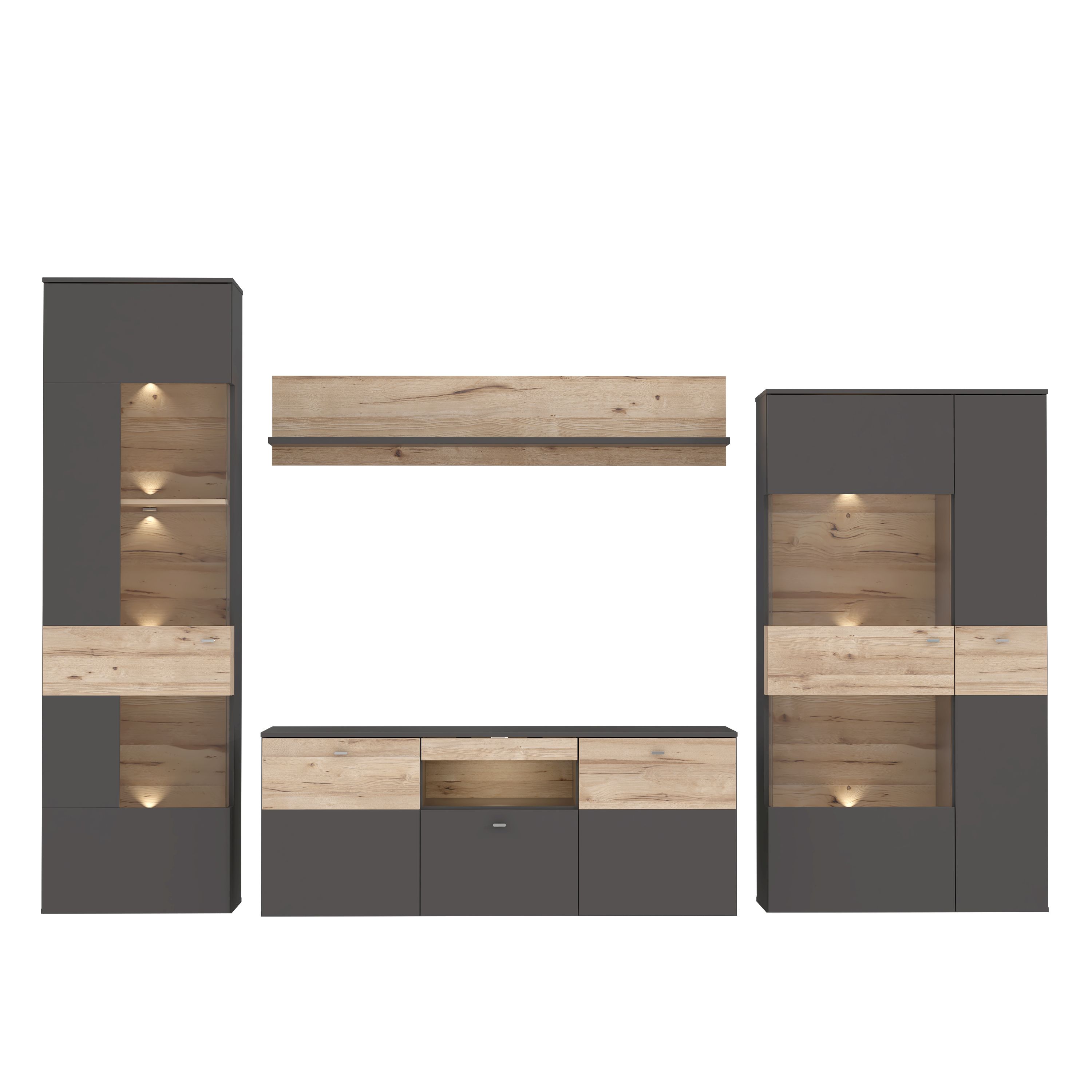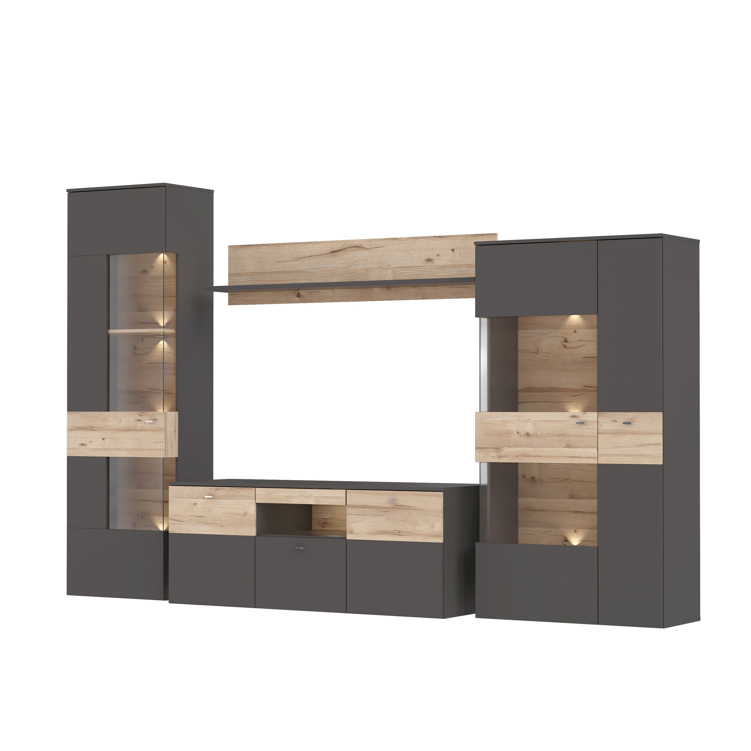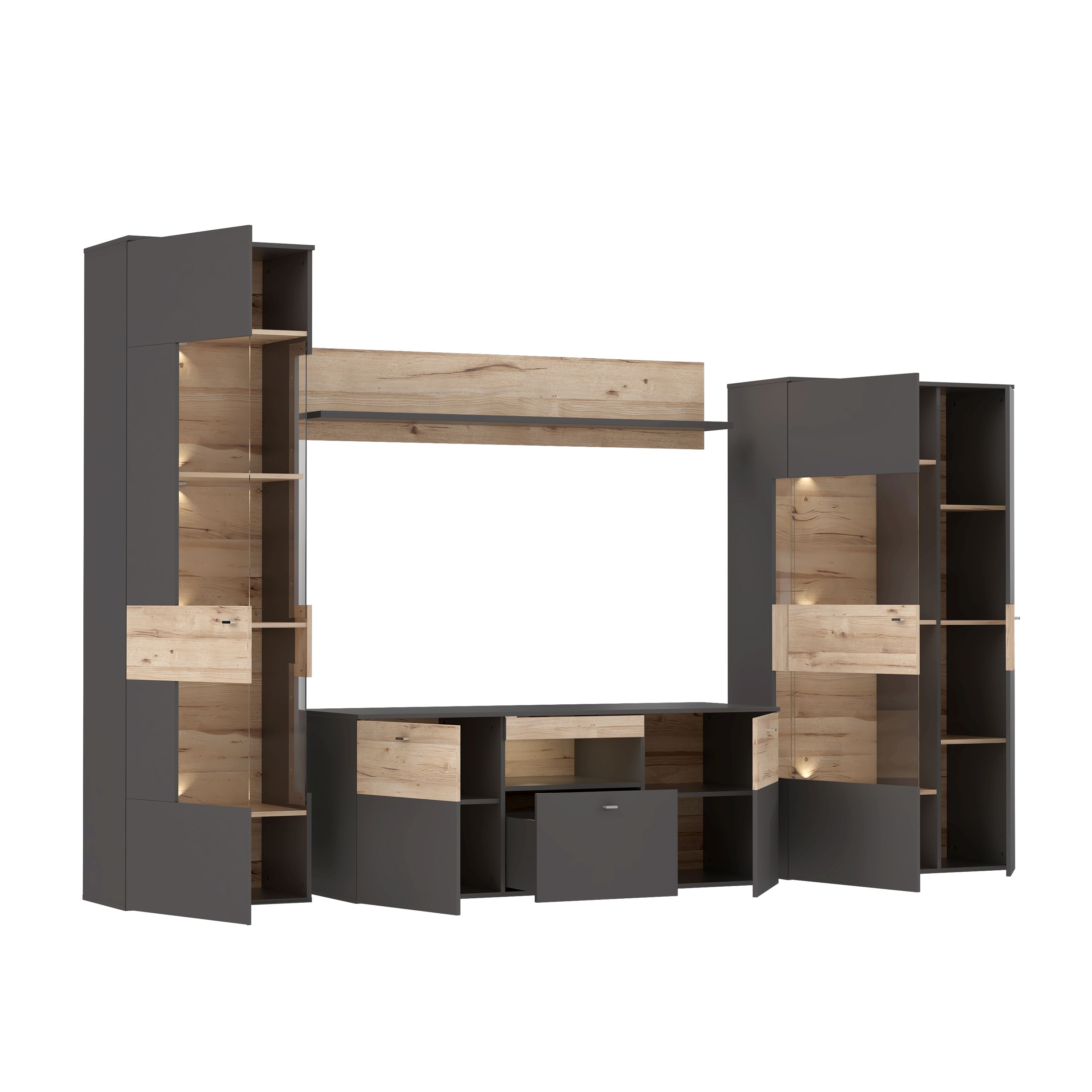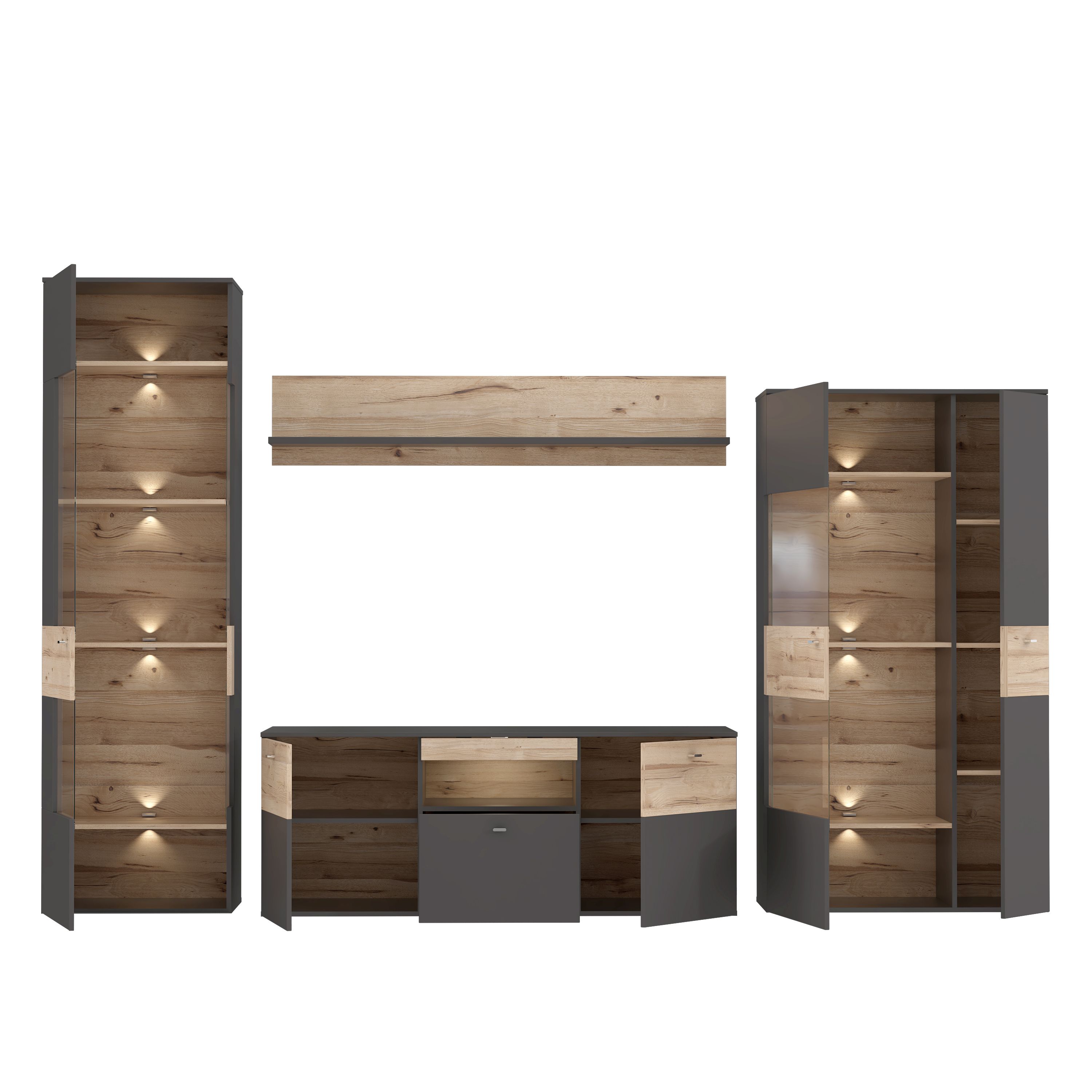 Korpus und Front: Uni Wolfram Grau kombiniert mit Planked Eiche Holznachbildung / Glas