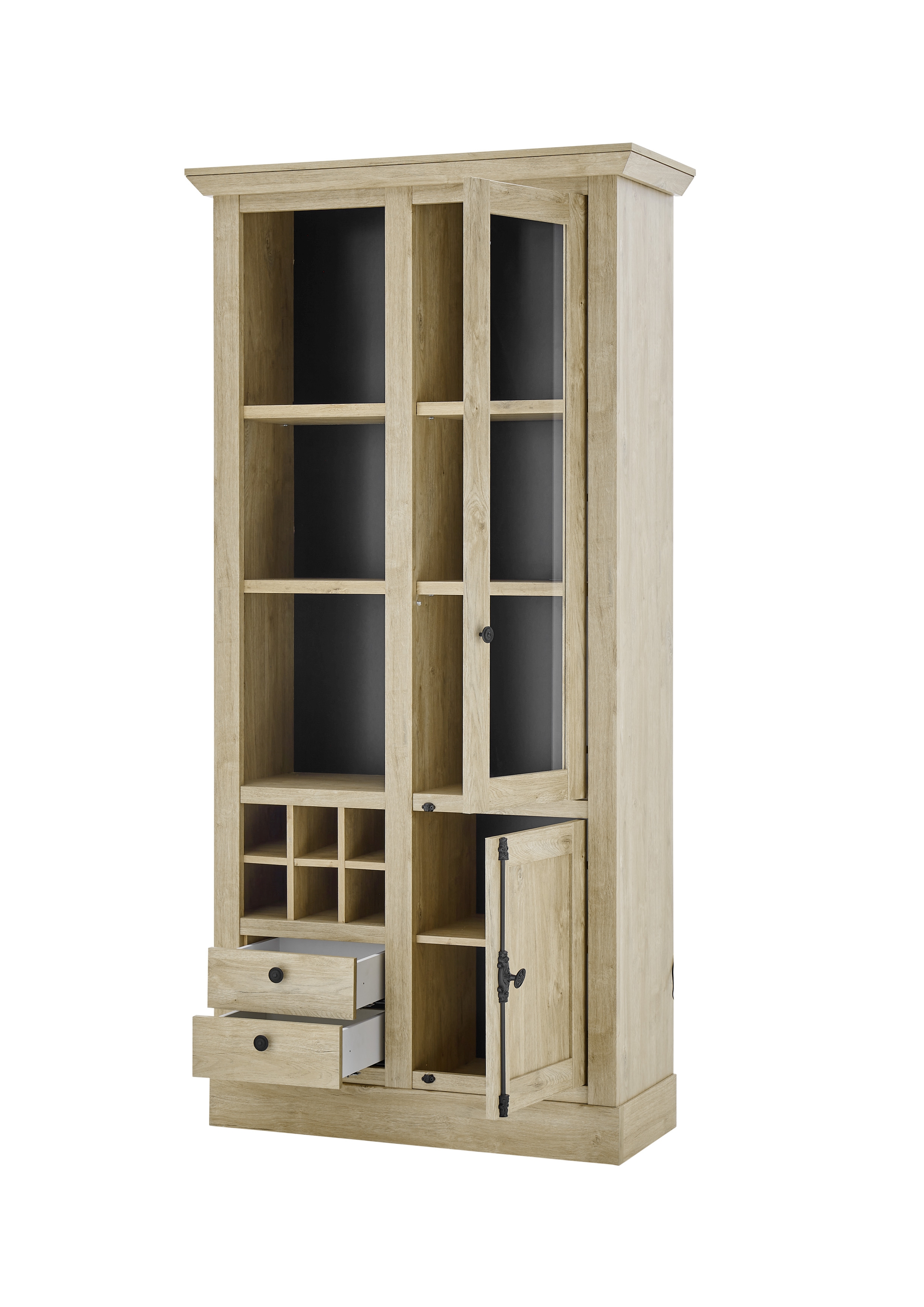 1 Buffet mit 3 offene Fächer, 1 Glasrahmentür (dahinter 2 Böden), 1 Flascheneinteilung mit 6 Fächern und 2 Schubkästen