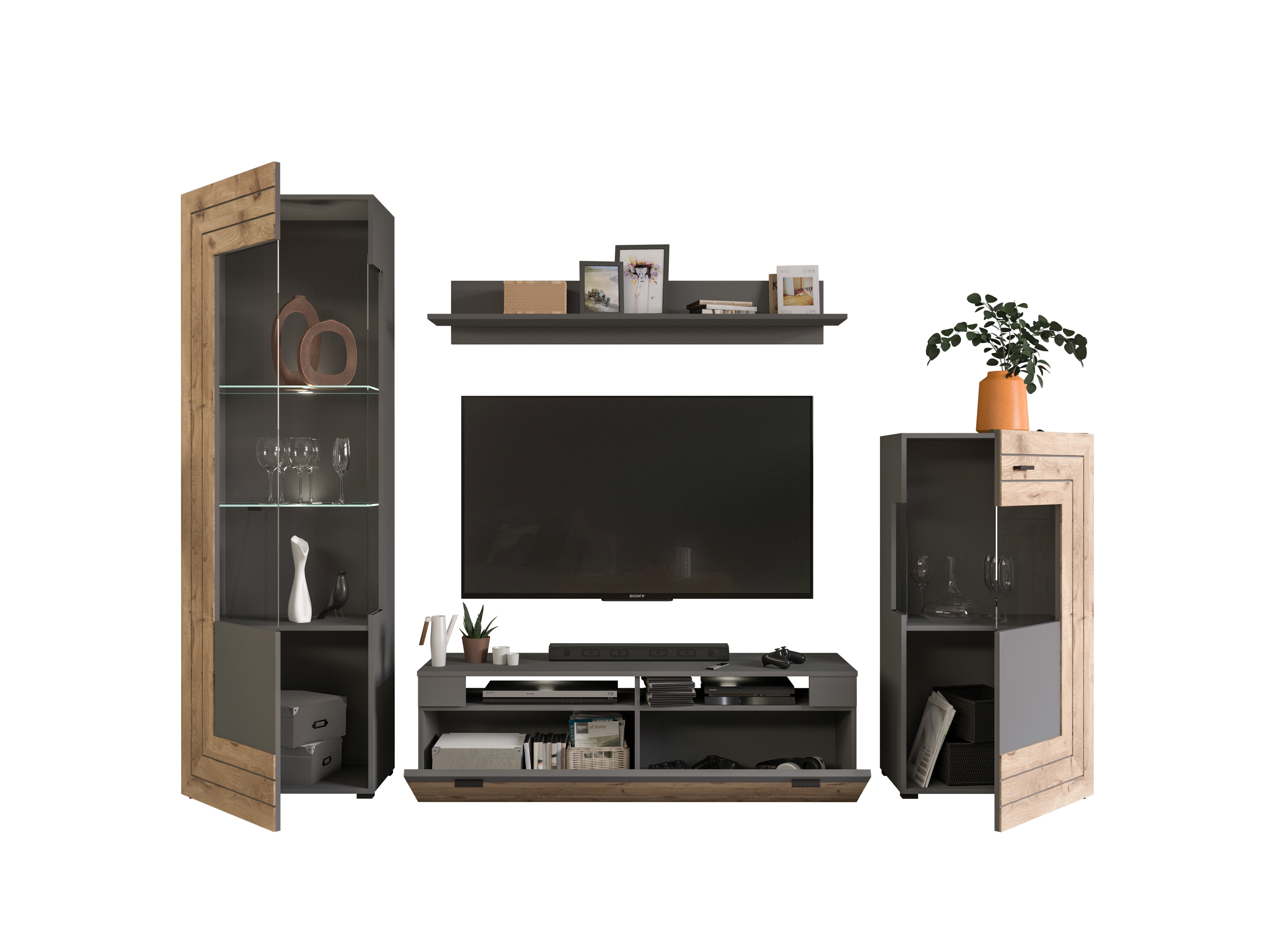 Unsere vielseitige Wohnwandkombination in ansprechendem Grau-Nachbildung bietet die perfekte Lösung für Ihr Wohnzimmer. Mit durchdachtem Design und hochwertiger Verarbeitung schafft sie nicht nur Stauraum, sondern setzt auch stilvolle Akzente in Ihrem Zuhause. Entdecken Sie jetzt die moderne Eleganz und Funktionalität dieser Wohnwandkombination, die Ihren Wohnraum bereichert und für bewundernde Blicke sorgt.