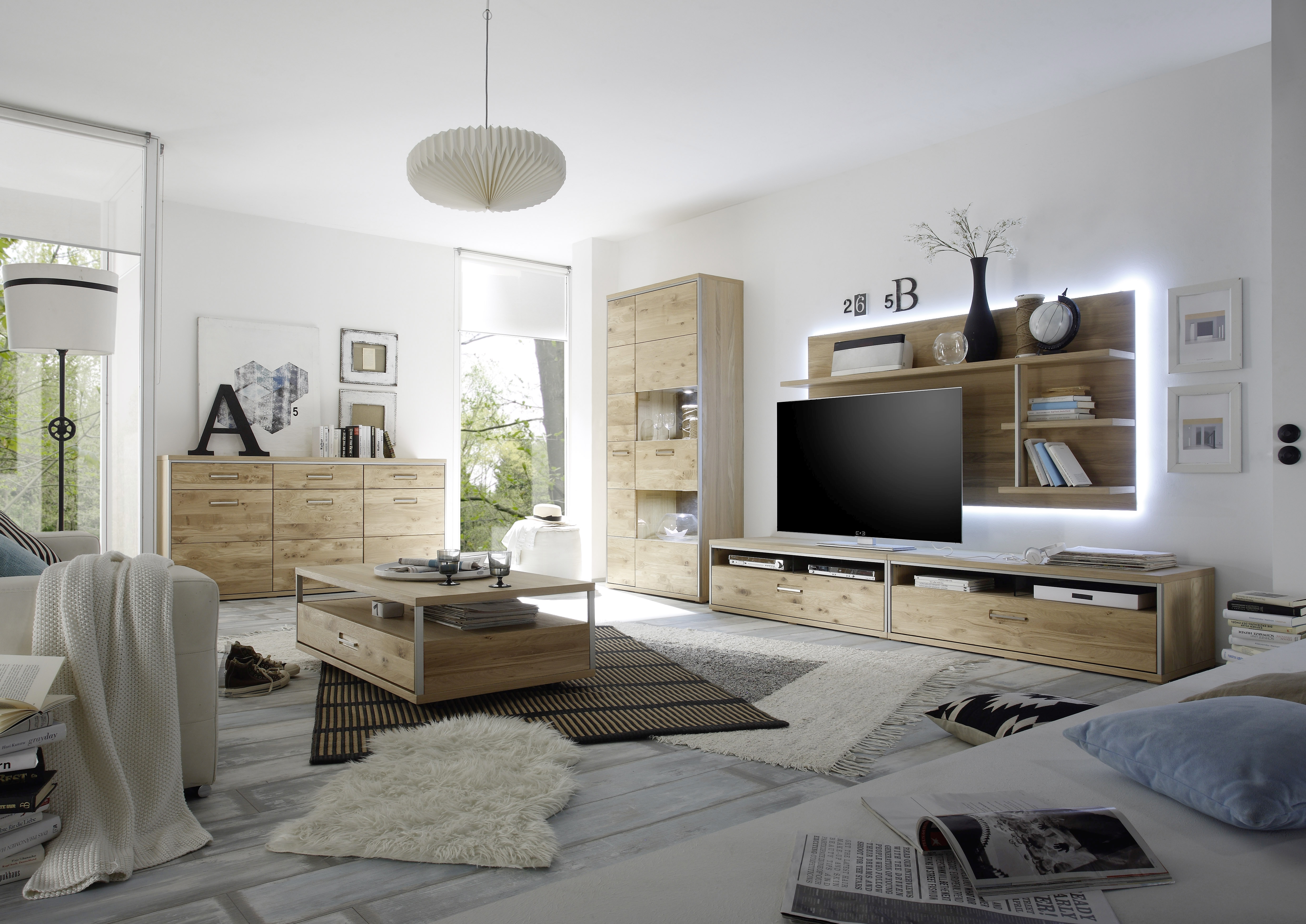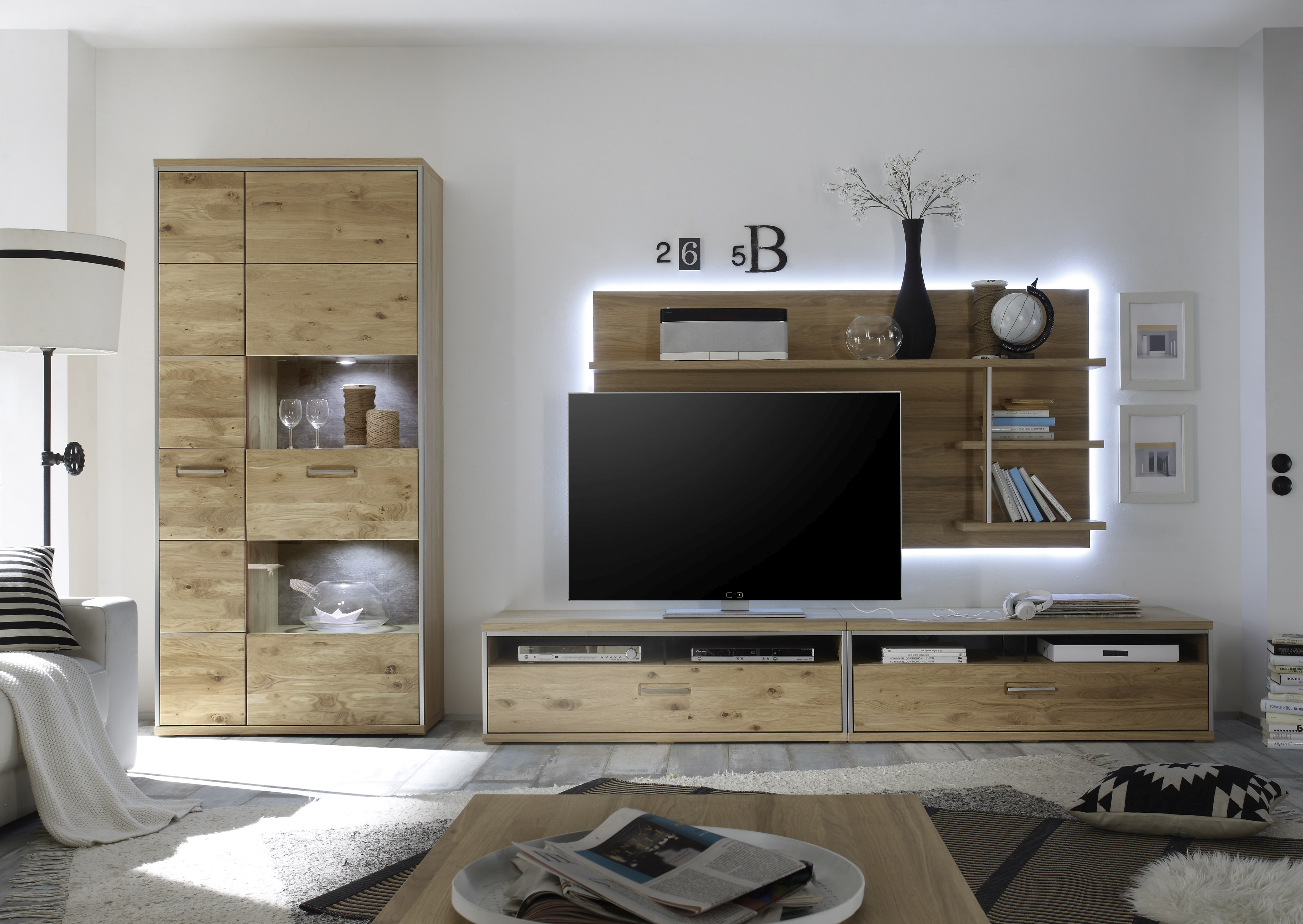 Korpus: außen: Eiche bianco furniert; innen: Eiche bianco Holznachbildung