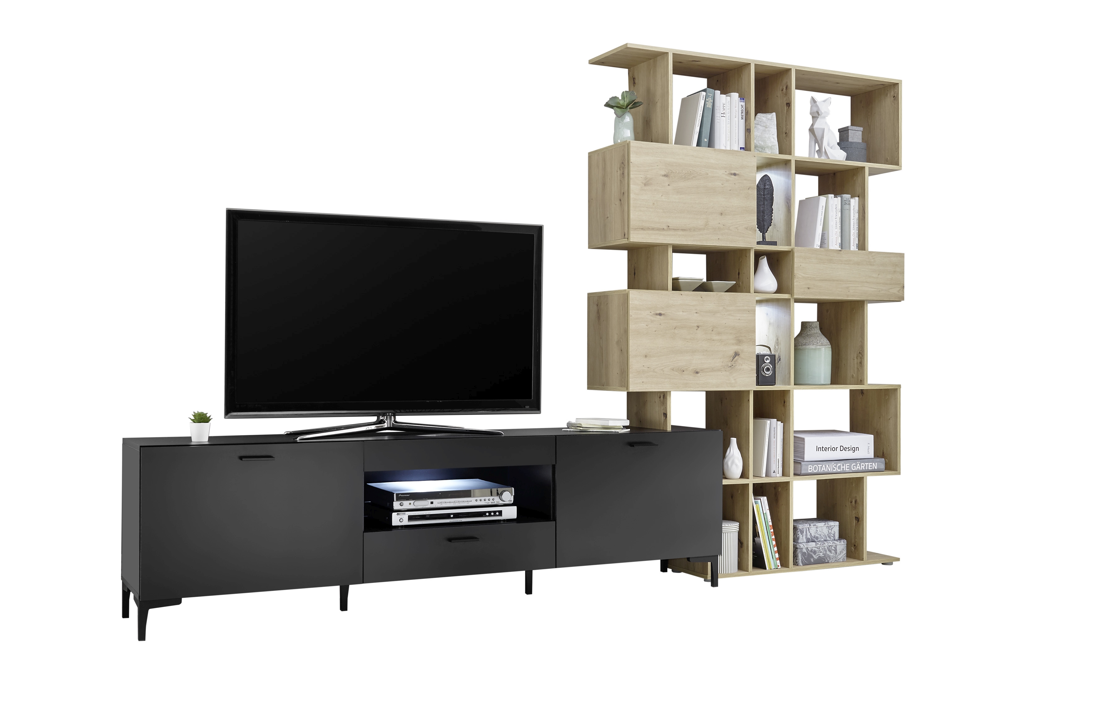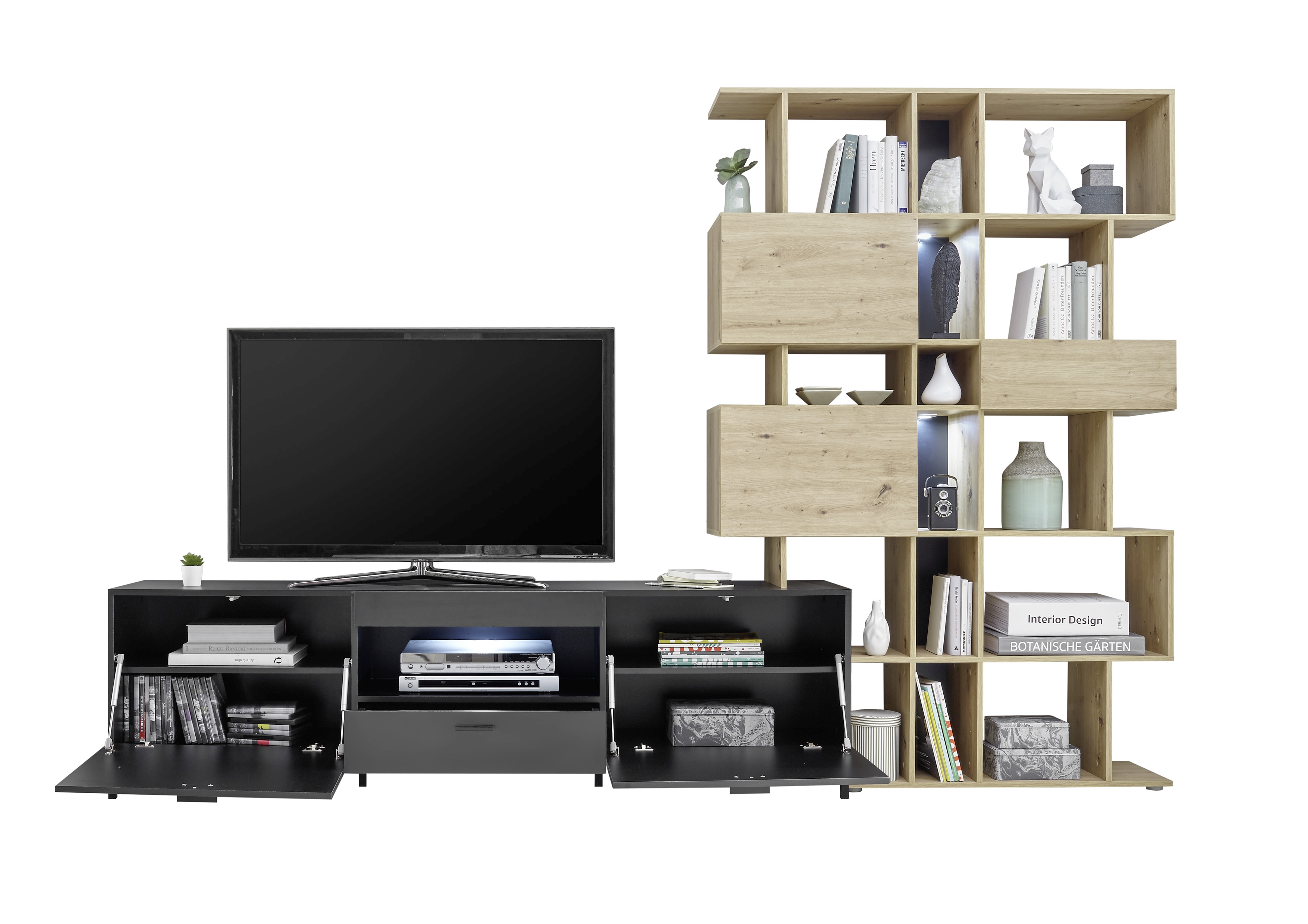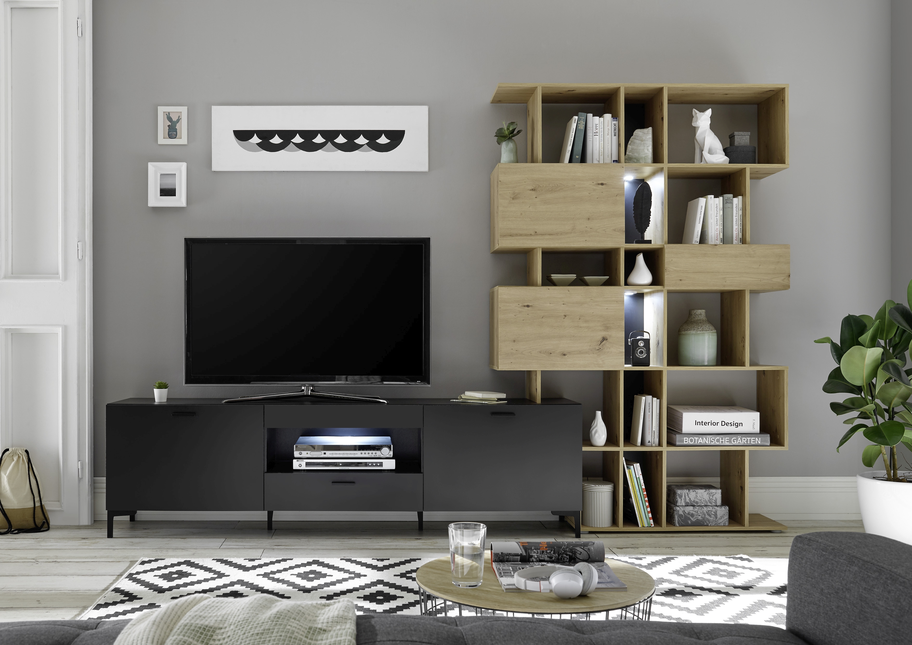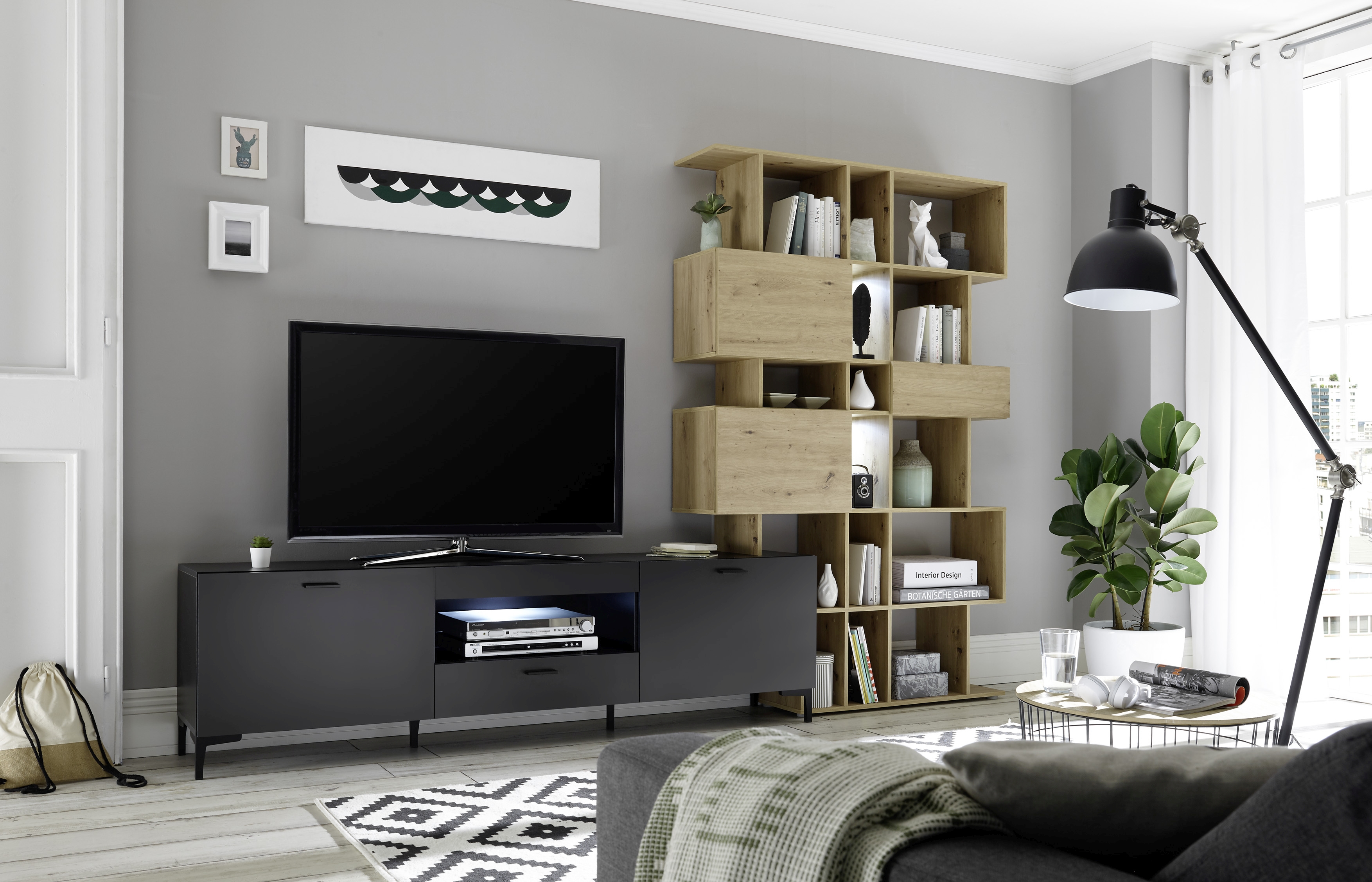 1 Lowboard mit 2 Klappen, 2 Fachböden, 1 offenes Fach und 1 Schubkasten