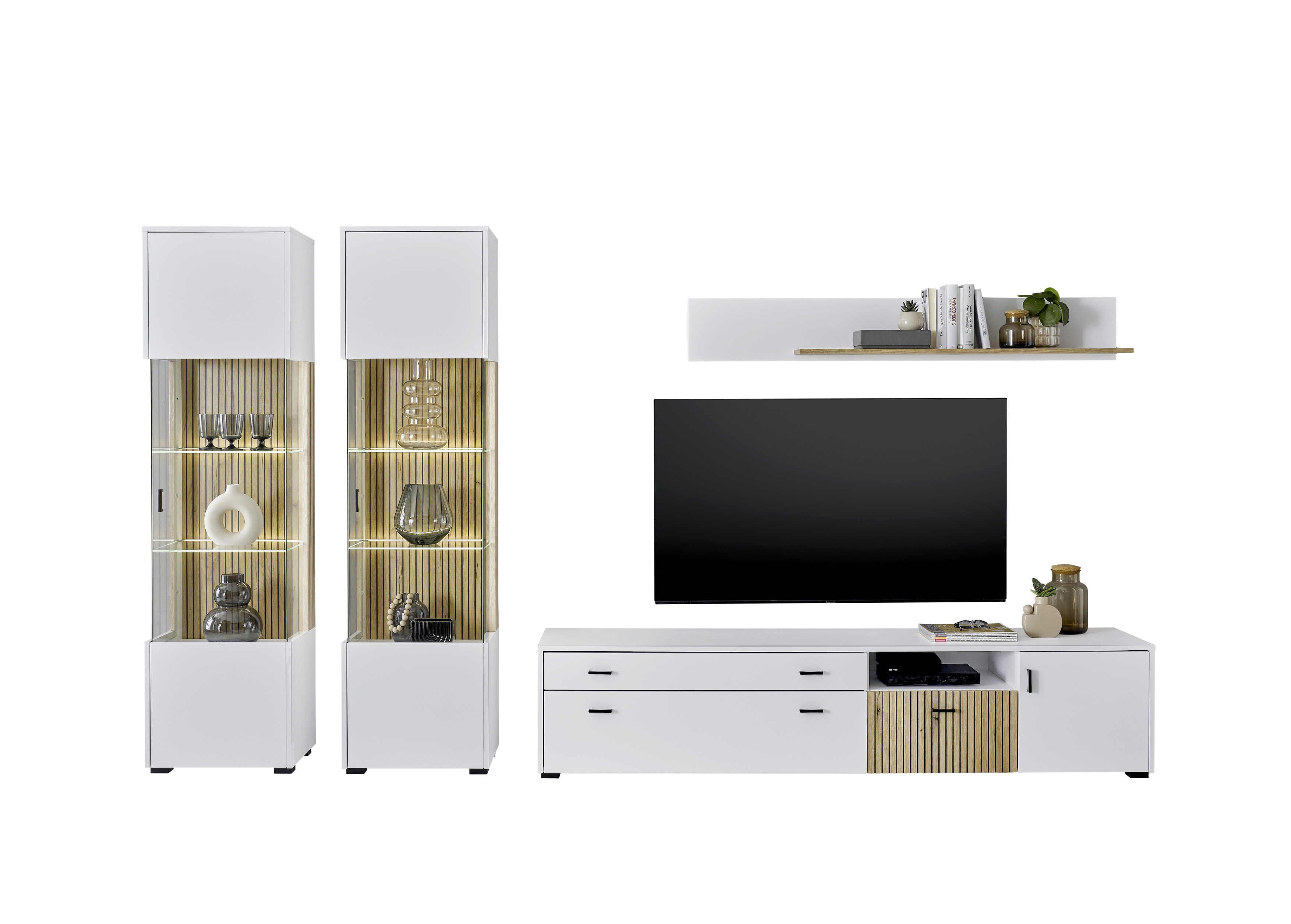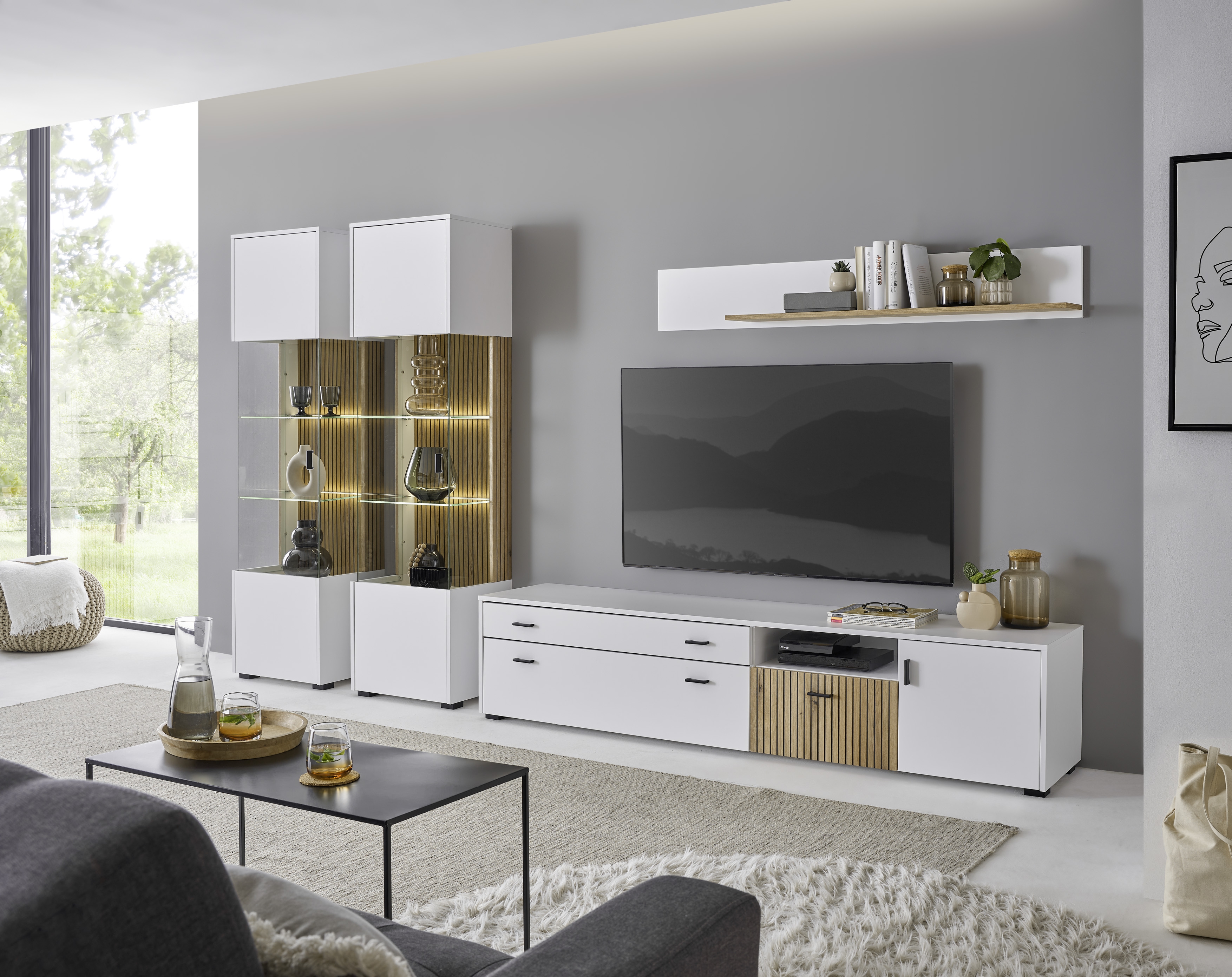 1 Lowboard mit 2 Türen, 1 Klappe, 1 Schubkasten und ein Gerätefach